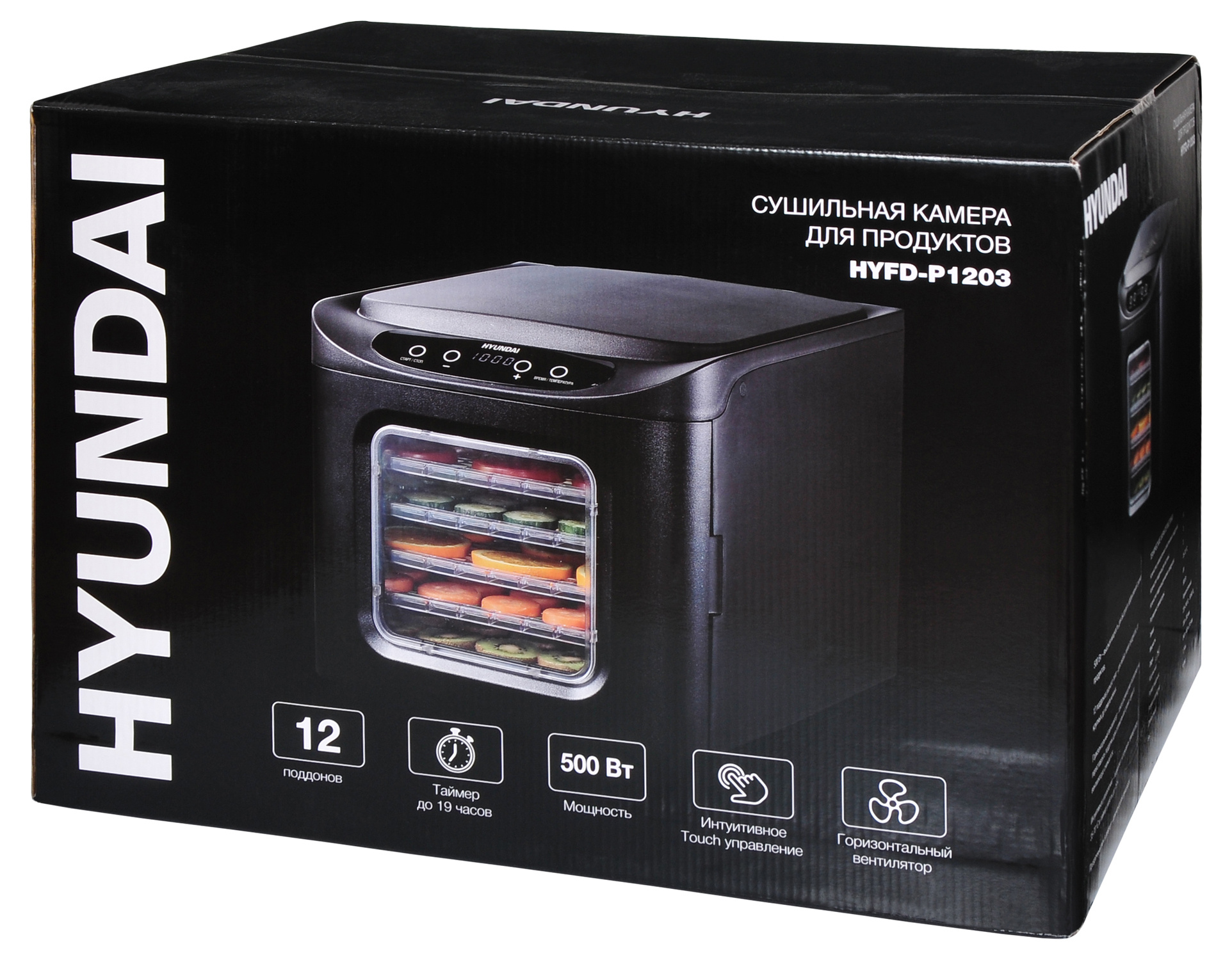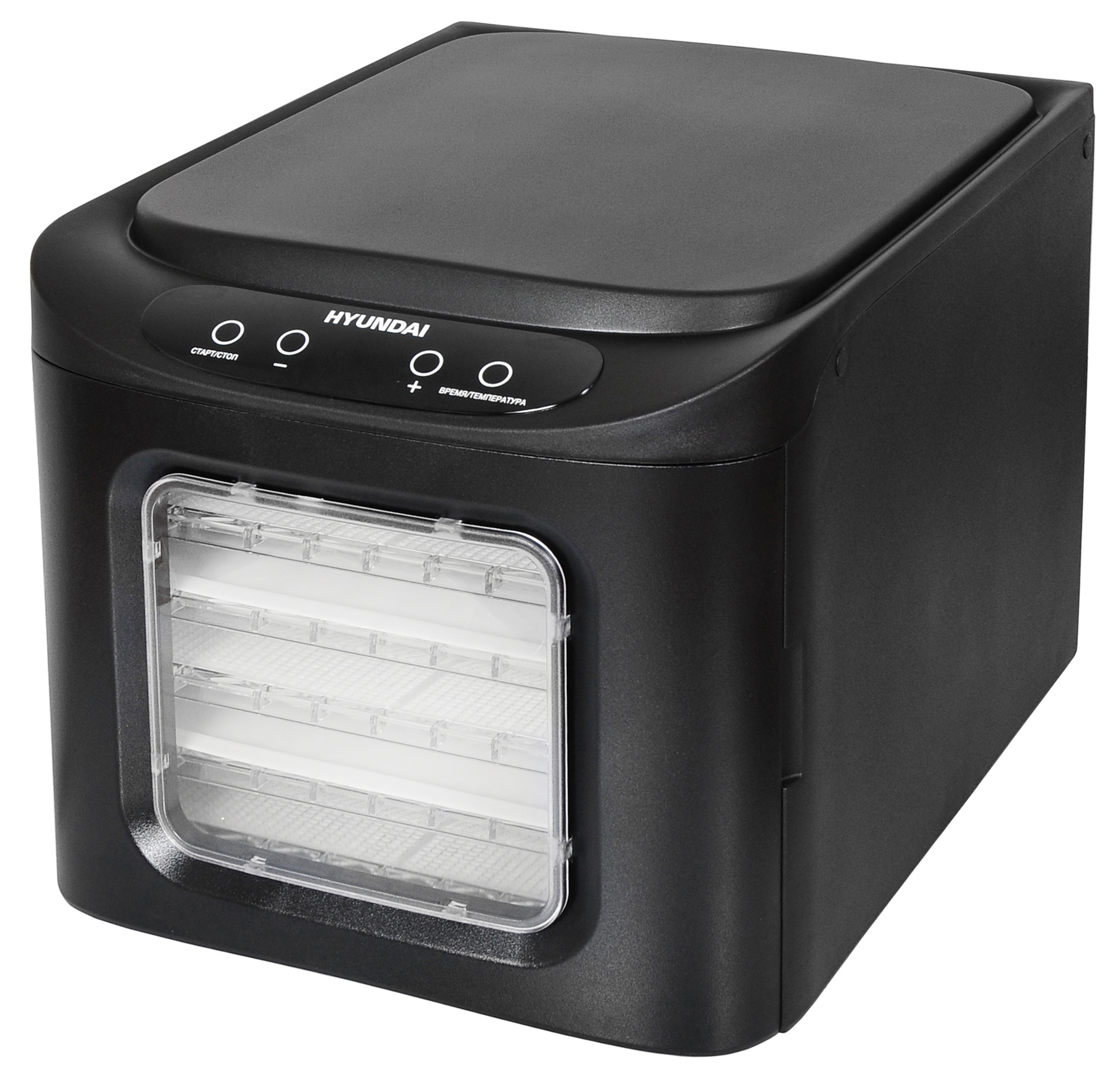Сушилка для овощей Hyundai HYFD-P1203 – востребованная модель для любителей делать домашние заготовки. Такой способ имеет многовековую историю и позволяет сохранить витамины и минералы в продуктах практически в первозданном виде. При помощи этого прибора можно сушить фрукты, ягоды, овощи, грибы, пряные травы, а также рыбу и мясо. Очень понравится любителям здорового питания вкусная пастила. Корпус изготовлен из черного пластика с матовым покрытием, которое препятствует образованию царапин и отпечатков пальцев. За такой поверхностью легко ухаживать. Дверца оборудована окошком, через которое хорошо видна степень готовности продуктов. Забор воздуха осуществляется через отверстия в задней стенке. Вентилятор расположен вертикально, поэтому запахи от продуктов с разных поддонов не смешиваются. Панель управления расположена сверху. Управление простое и интуитивно понятное. Четыре кнопки отвечают за включение, паузу, таймер и регулировку температуры. На дисплее отображается актуальное состояние прибора.