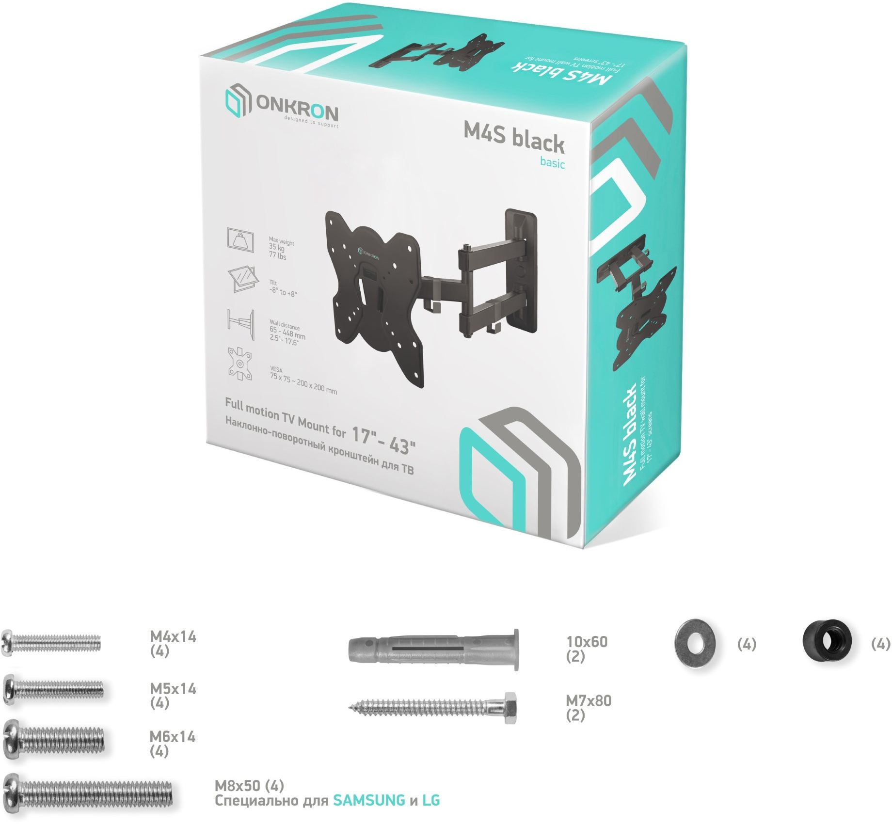 Настенный наклонно-поворотный кронштейн ONKRON M4S предназначен для ТВ с диагональю от 17 до 43 дюймов. Он подходит для небольших телевизоров и мониторов весом до 35 кг.