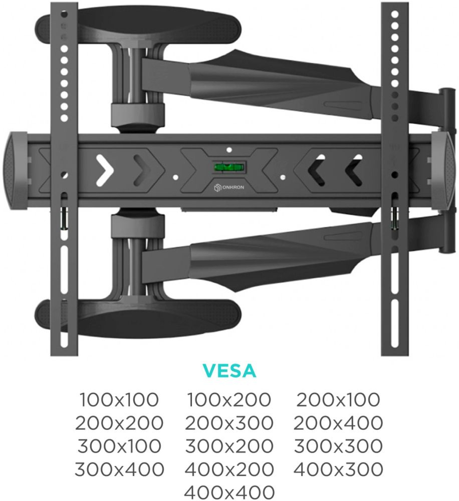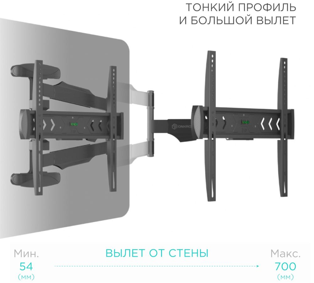 Различные варианты крепления VESA. Мощная стальная конструкция. Сверхбольшой вылет от стены. Большие возможности регулировки. Система организации проводов.