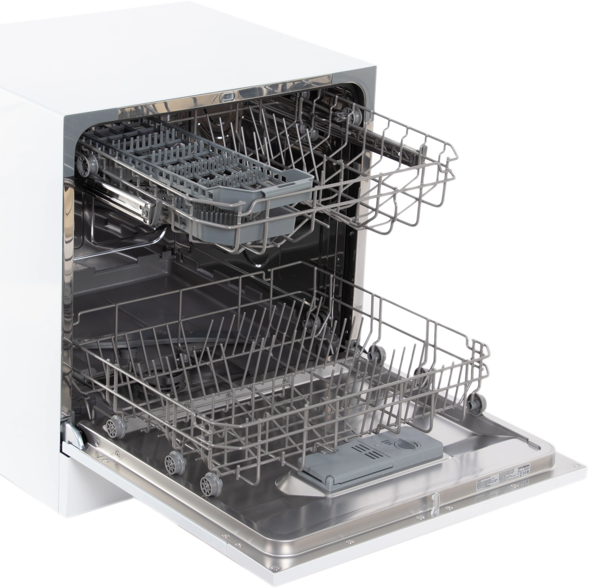 Посудомоечная модель Hyundai DT503 выполнена в глянцевом белом цвете, гармонирующим с остальной техникой на кухне. В 2-х выдвижных корзинах одновременно размещается до 8 комплектов посуды, вместе со столовыми приборами.