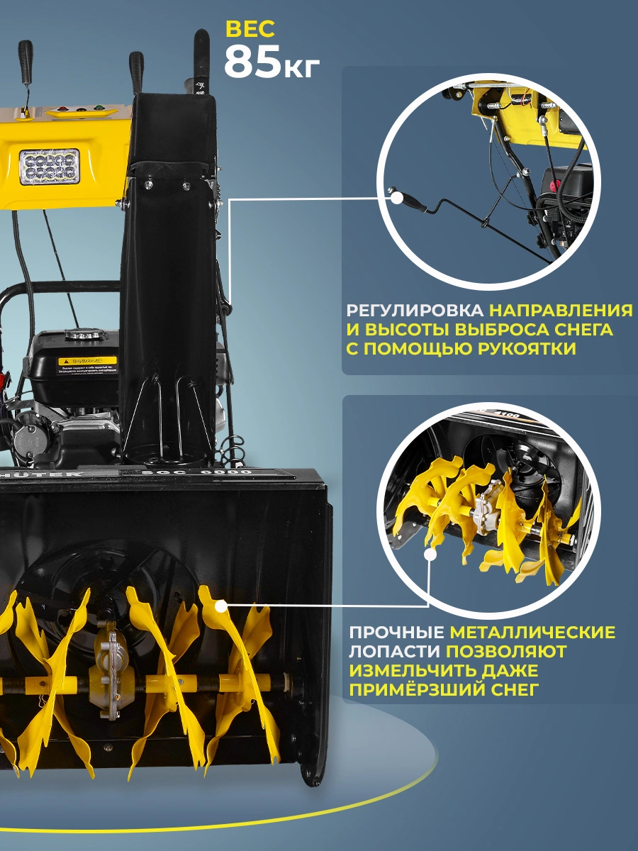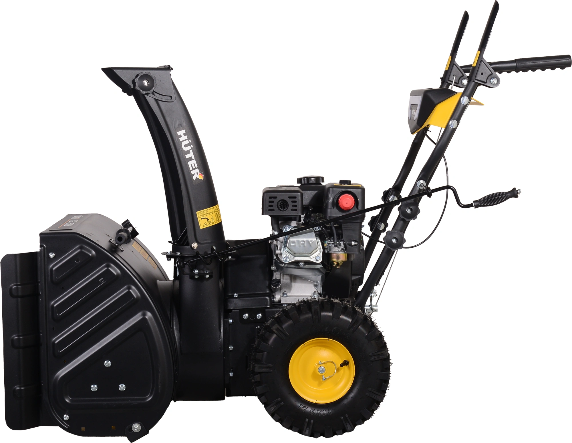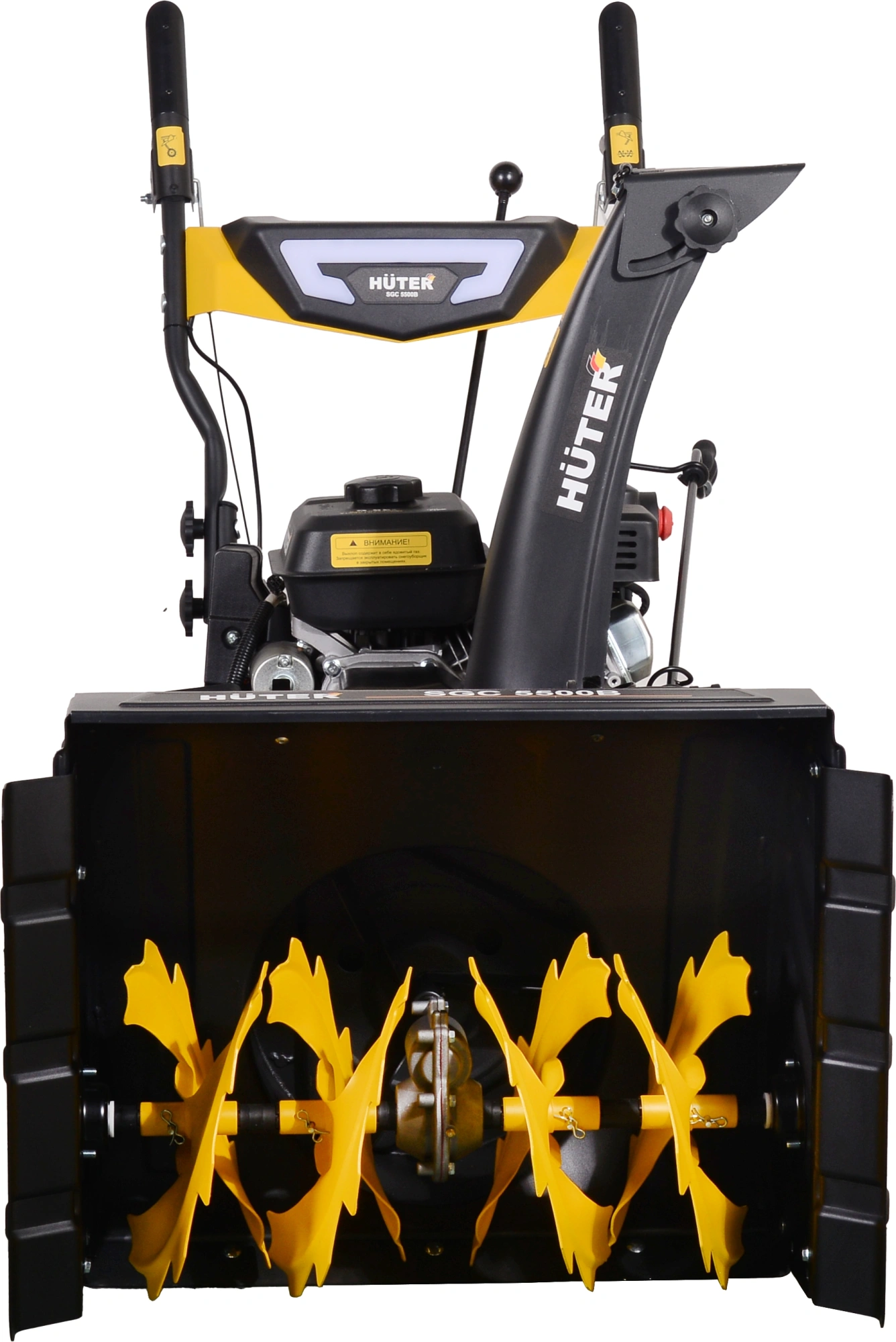 Мощный снегоуборщик Huter SGC 5500В предназначен для расчистки больших территорий. Самоходный. Металлический шнек может измельчать плотный снег. Для предотвращения повреждения ковша предусмотрены полозья.