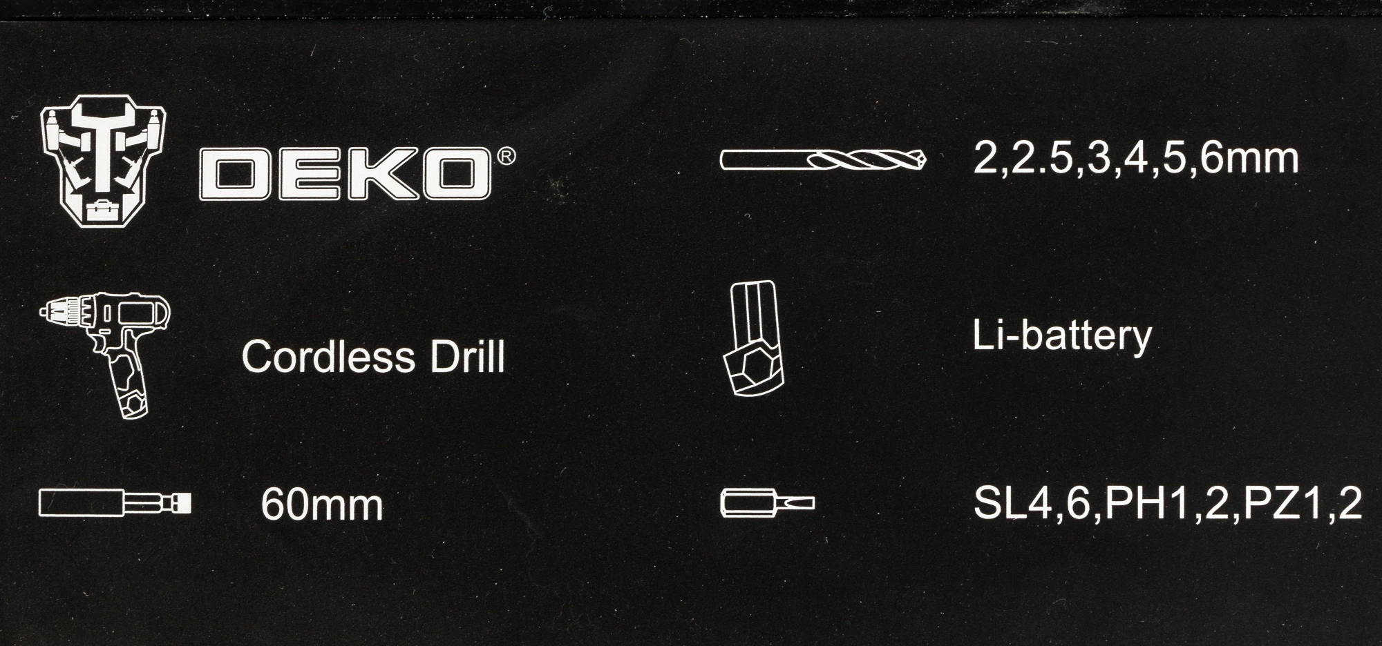 Дрель-шуруповерт, Аккумуляторная батарея - 2шт., Зарядное устройство, Биты - 6шт., Сверла - 6шт., Удлинитель бит, Кейс