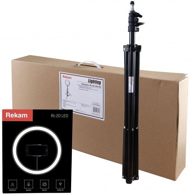 Кольцевая светодиодная лампа. Шнур питания с пультом и USB-разъёмом. Держатель для смартфона. Гибкое шарнирное крепление (Goose neck). Крепление на стойку (штатив) с интегрированной шаровой головой.. Винт регулировки угла наклона лампы. Студийная стойка REKAM LS3?200?2 (75-200 см). Инструкция.