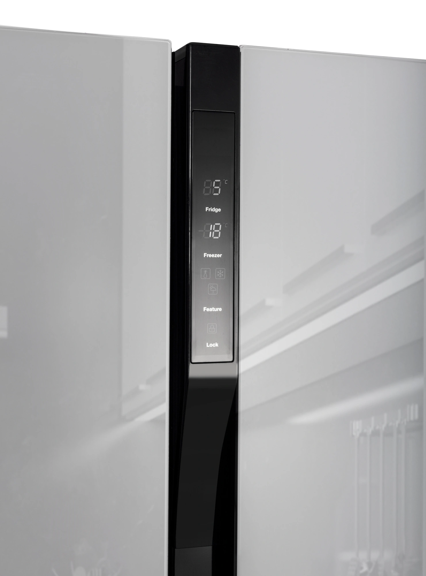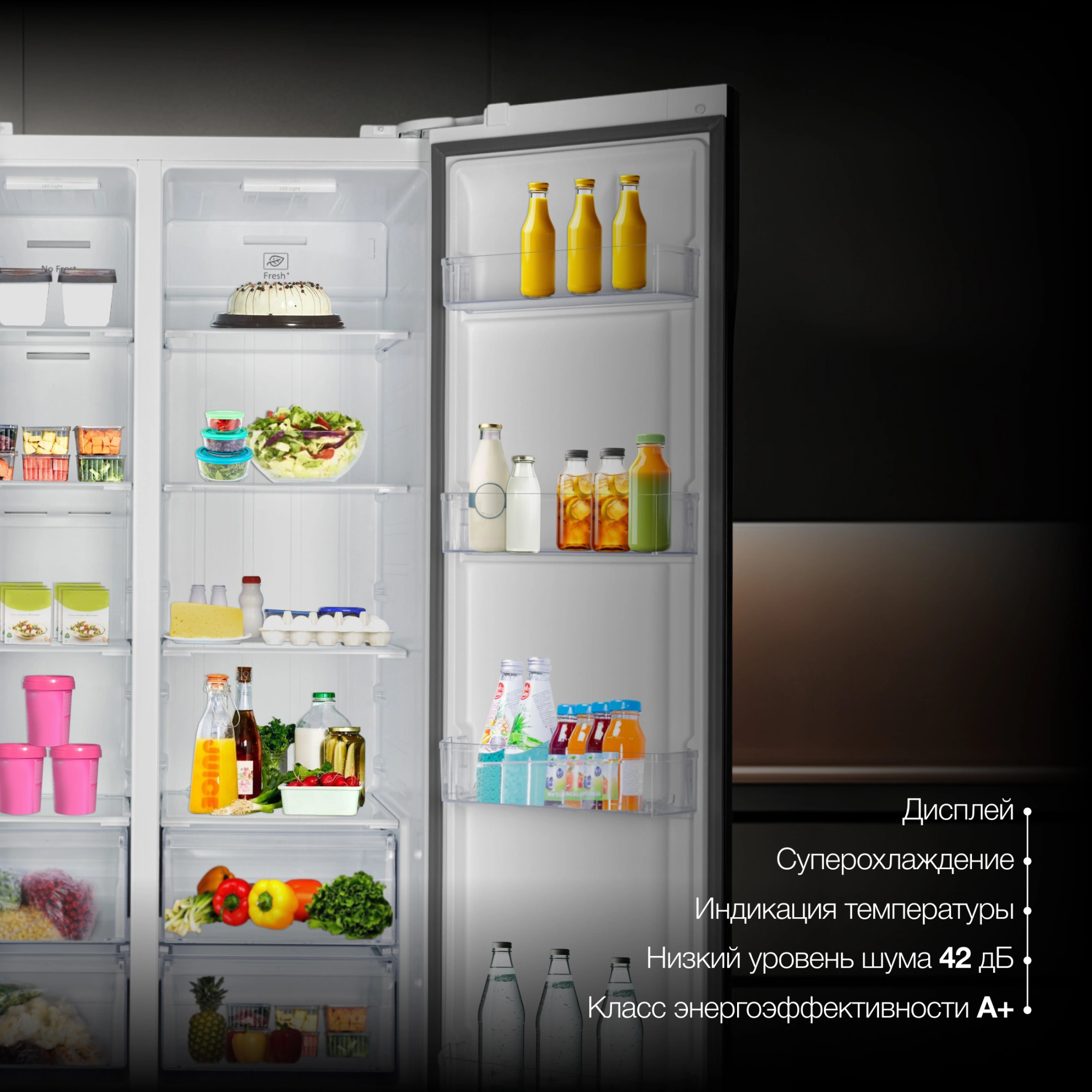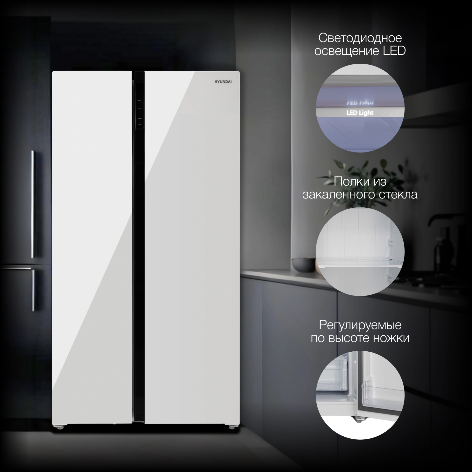 612 литров полезного объема спрятано за стеклянными дверцами холодильника HYUNDAI CS6503FV. Для хранения продуктов и напитков предусмотрены полки из закаленного стекла и выдвижные ящики. При необходимости, высота полок может варьироваться.