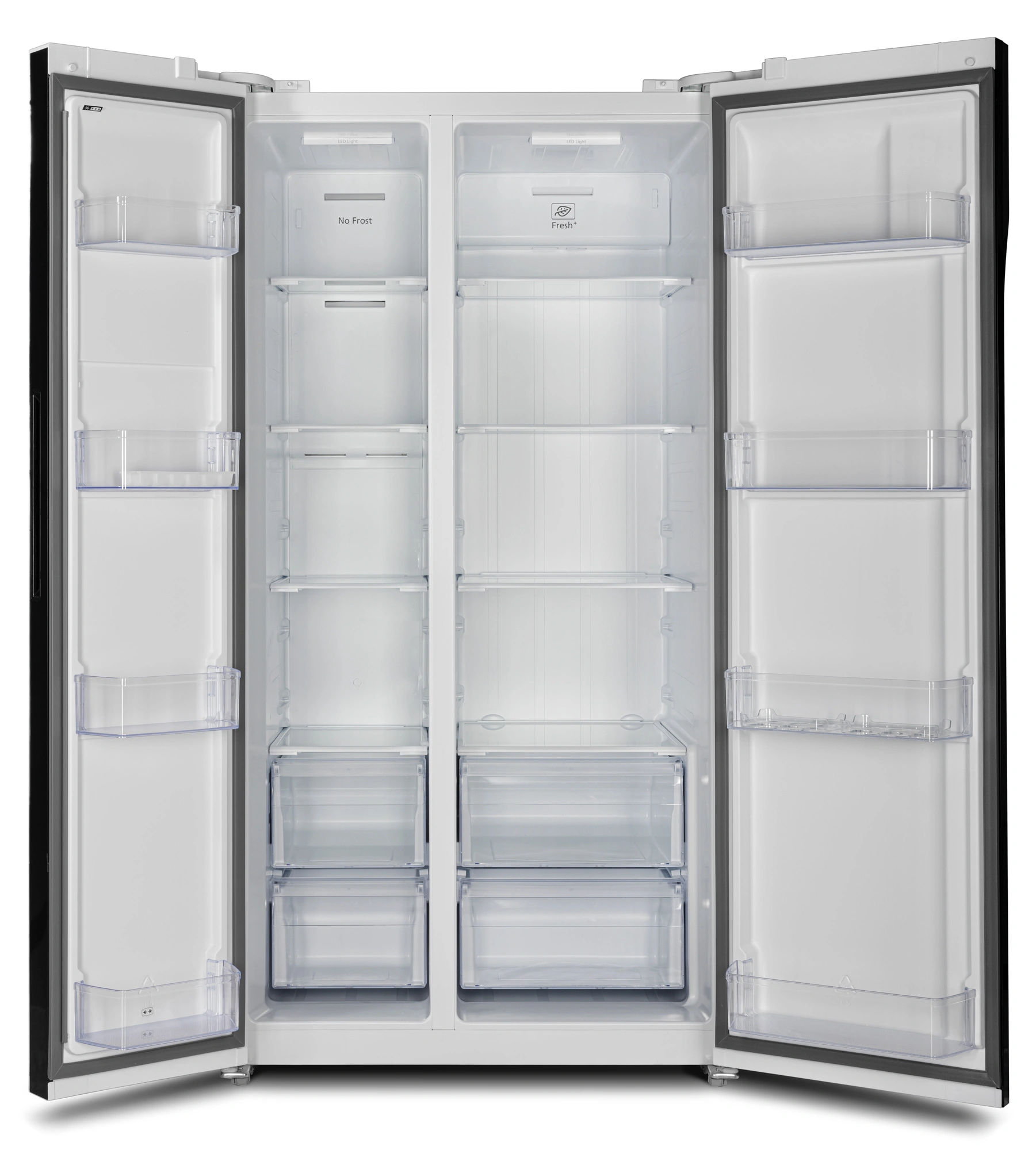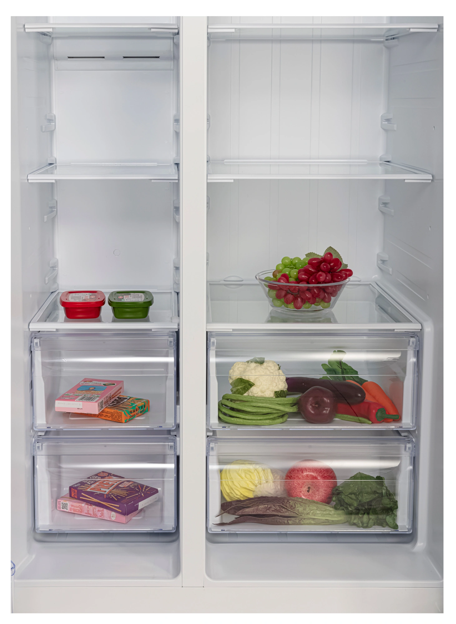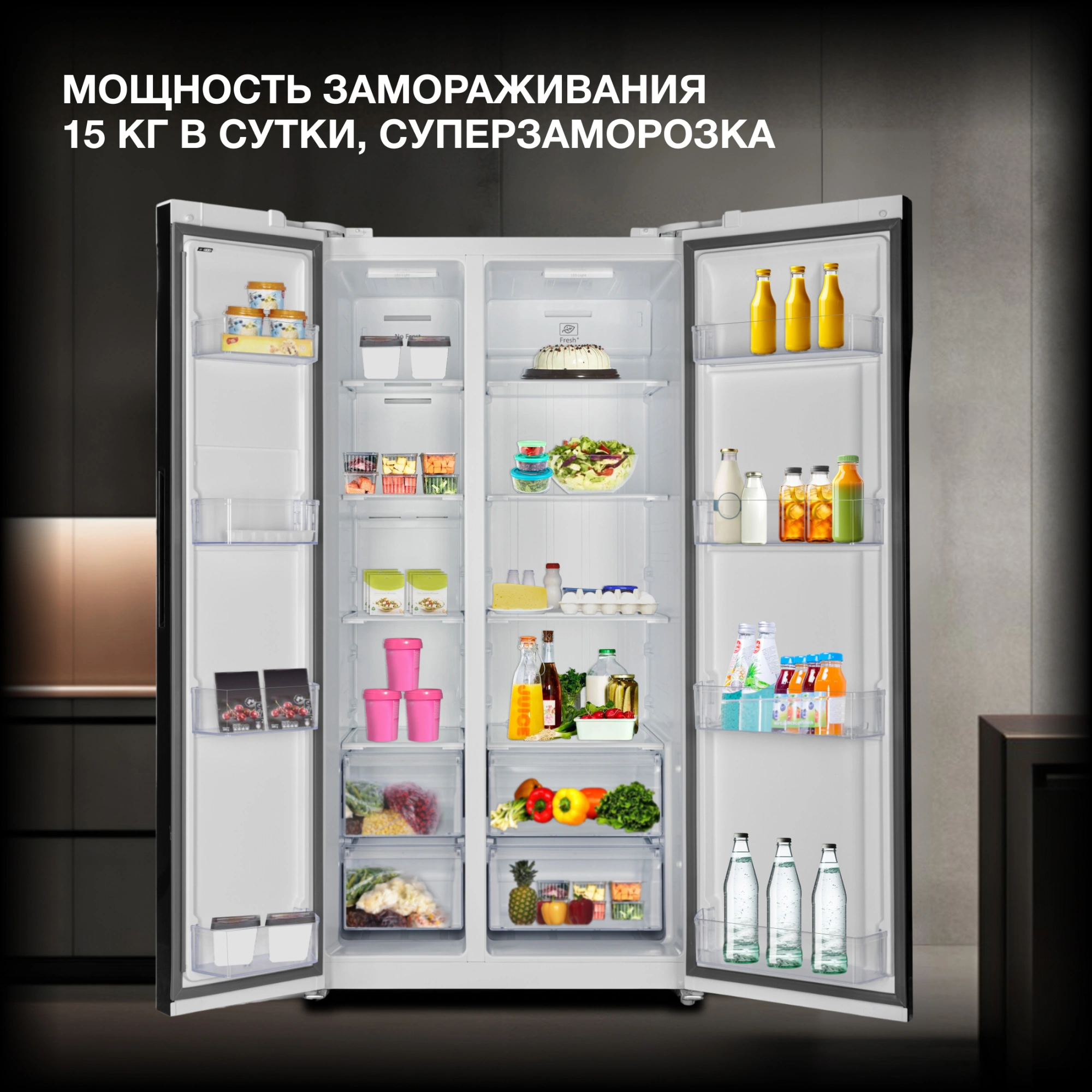 612 литров полезного объема спрятано за стеклянными дверцами холодильника HYUNDAI CS6503FV. Для хранения продуктов и напитков предусмотрены полки из закаленного стекла и выдвижные ящики. При необходимости, высота полок может варьироваться.