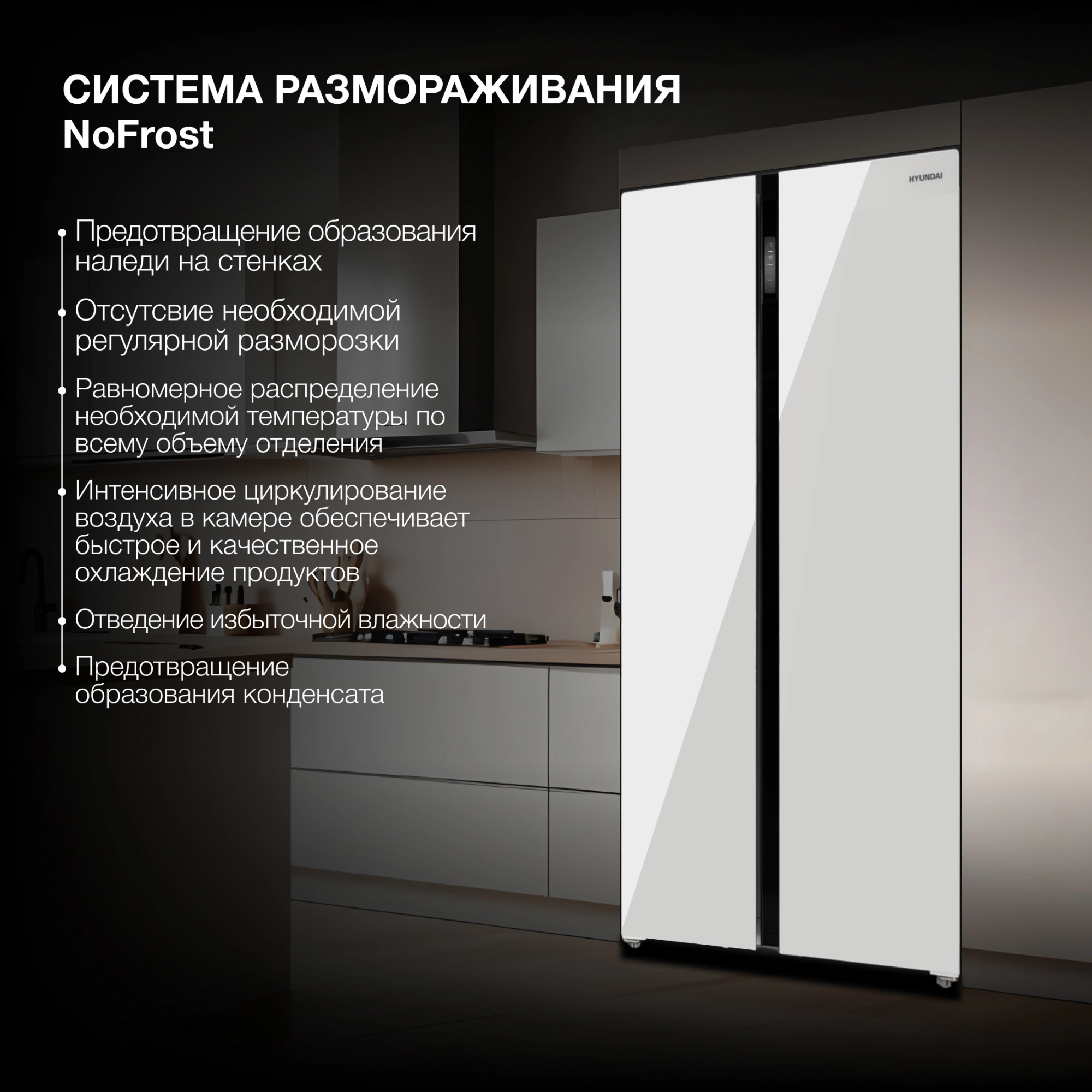 В холодильнике HYUNDAI CS6503FV применяется технология No Frost – иней и лед на стенках не образуются. Вы можете не беспокоиться о необходимости самостоятельно размораживать холодильную и морозильную камеру.