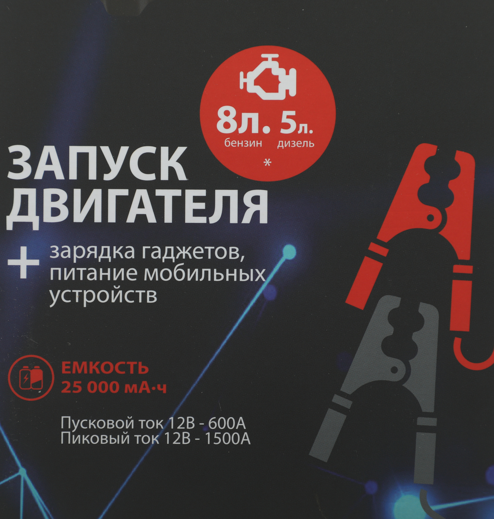 Запуск двигателей транспортных средств с бортовым электропитанием 12В и объёмом до 8 литров (бензин) и до 5 литров (дизель), зарядка и питание мобильной электроники через три USB-выхода, питание 12-вольтовых автоприборов через переходник прикуривателя.