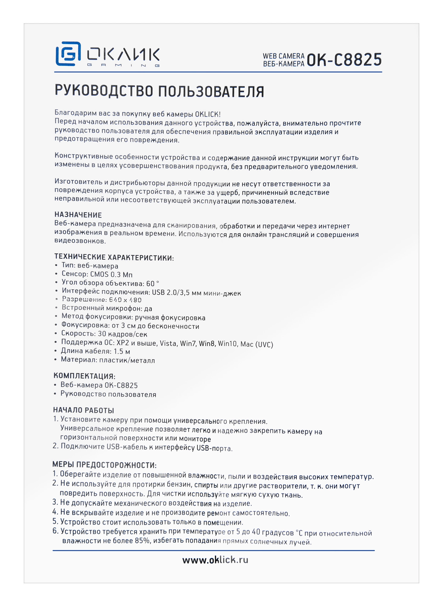 Откройте для себя Web-камеру OK-C8825 – устройство для видеоконференций, онлайн-занятий или общения с друзьями и семьей. Эта камера сочетает в себе высококачественное изображение с разрешением 640x480 пикселей и ручной фокусировкой, начиная всего с 3 см, чтобы добиться идеальной резкости в любых условиях. Встроенный микрофон записывает чистый и ясный звук без помех, а универсальное крепление поможет легко установить камеру на мониторе или гладкой поверхности.