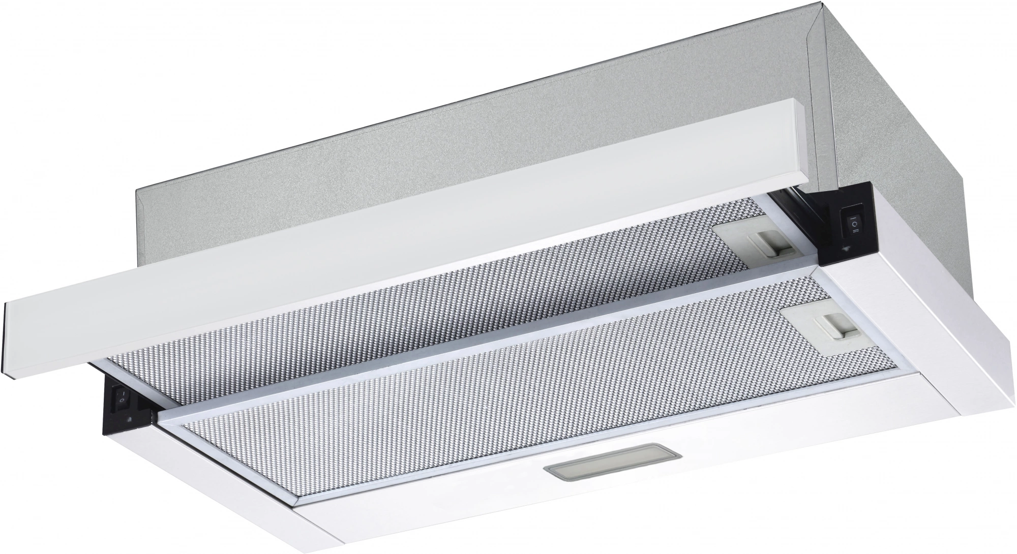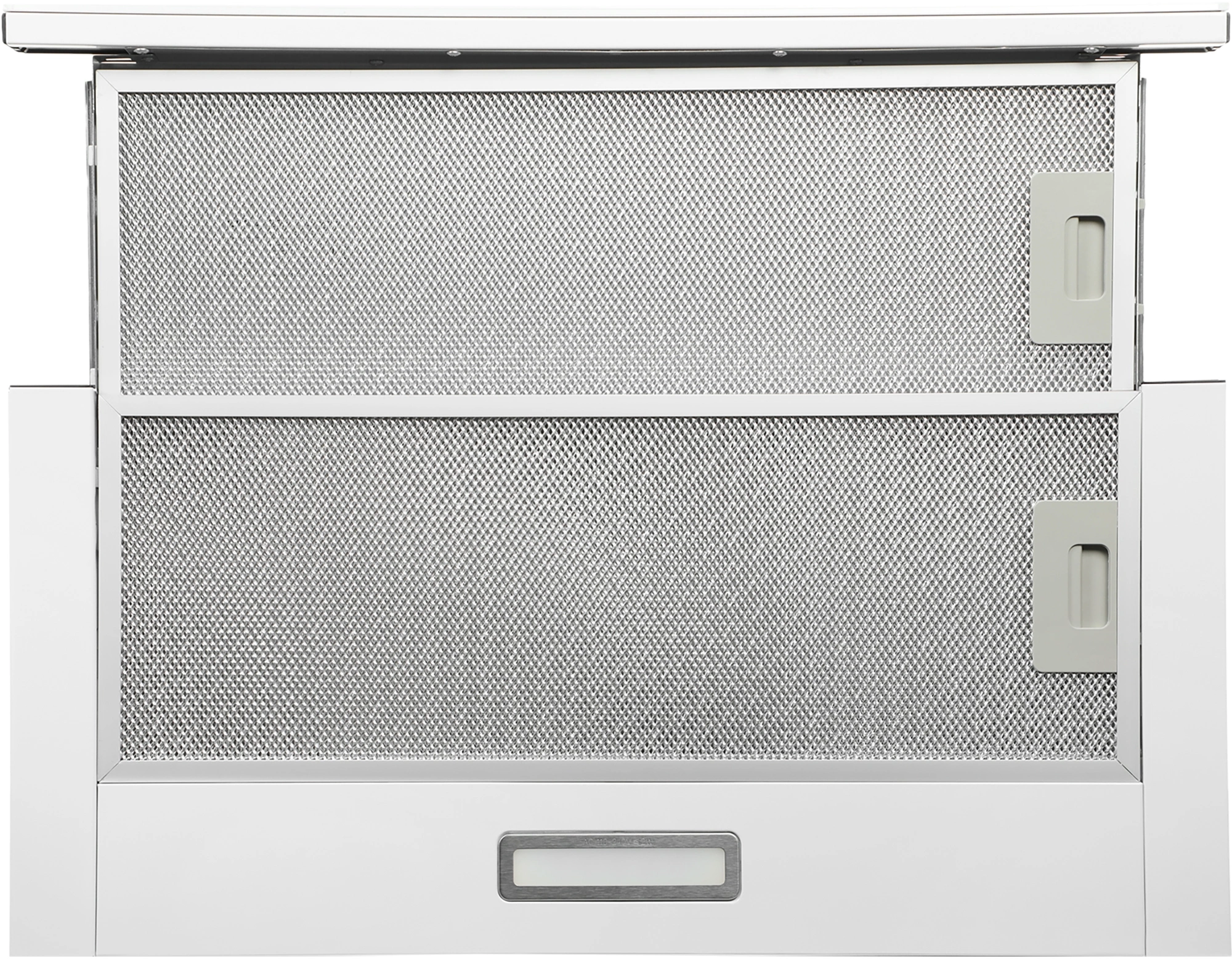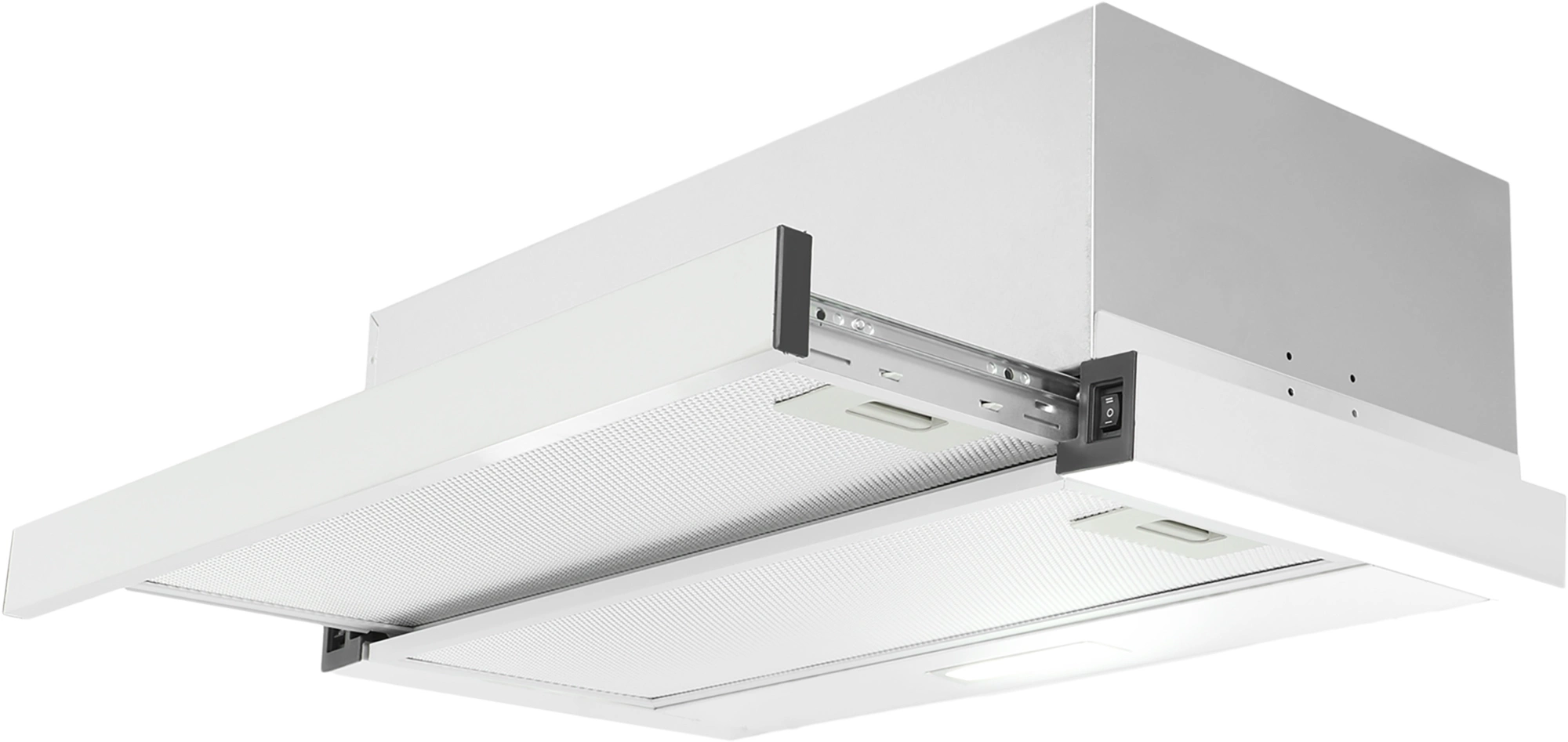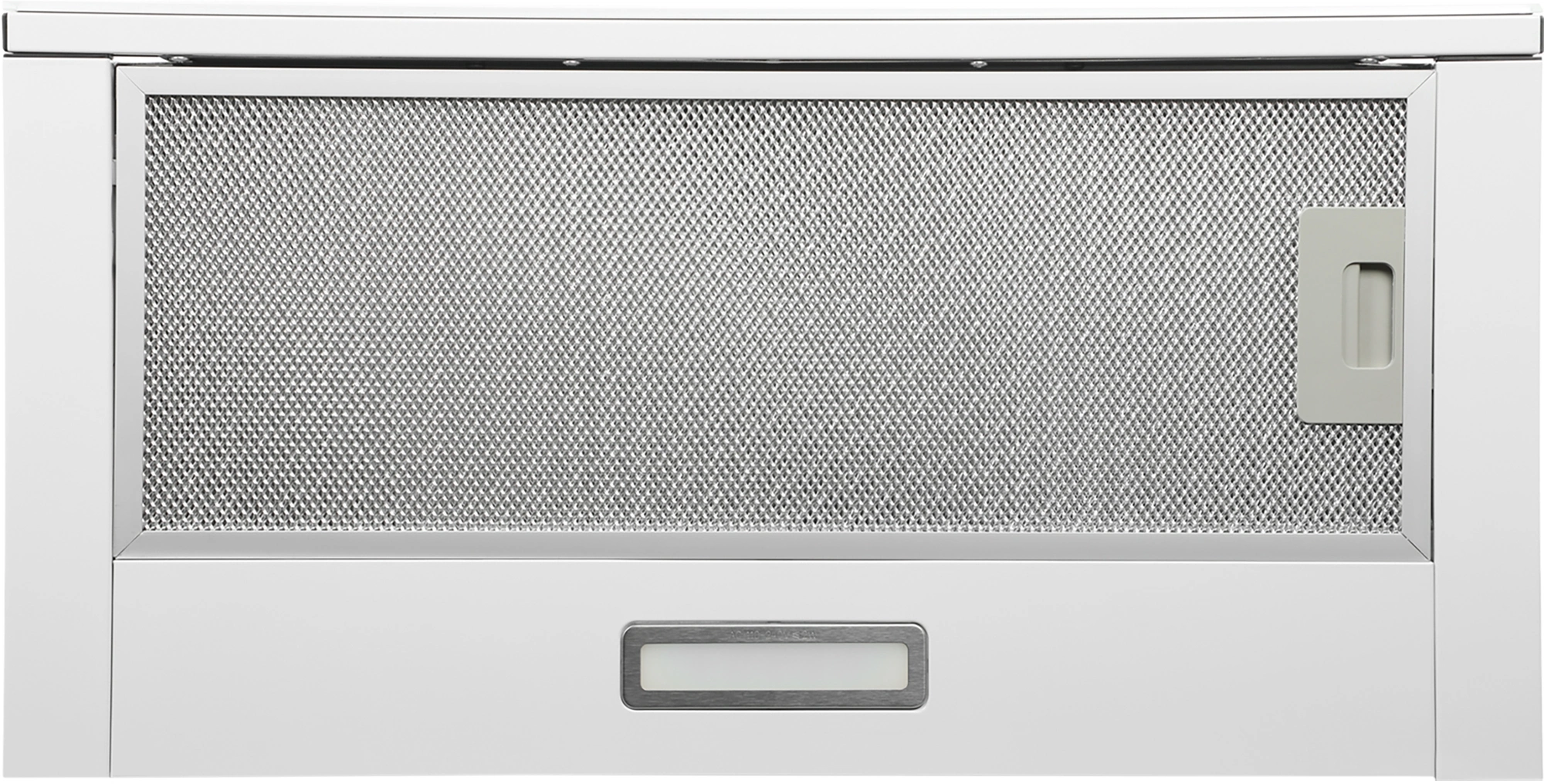 Минималистичный дизайн. Корпус вытяжки встраивается в навесной шкаф шириной 60 см. Глазу видна только лицевая стеклянная панель белого цвета. Она выглядит элегантно и подойдет к кухонным гарнитурам в светлых тонах. Выдвигайте лицевую панель вперед, чтобы включать вытяжку в заранее установленном режиме. Это позволит управлять прибором легче и быстрее.