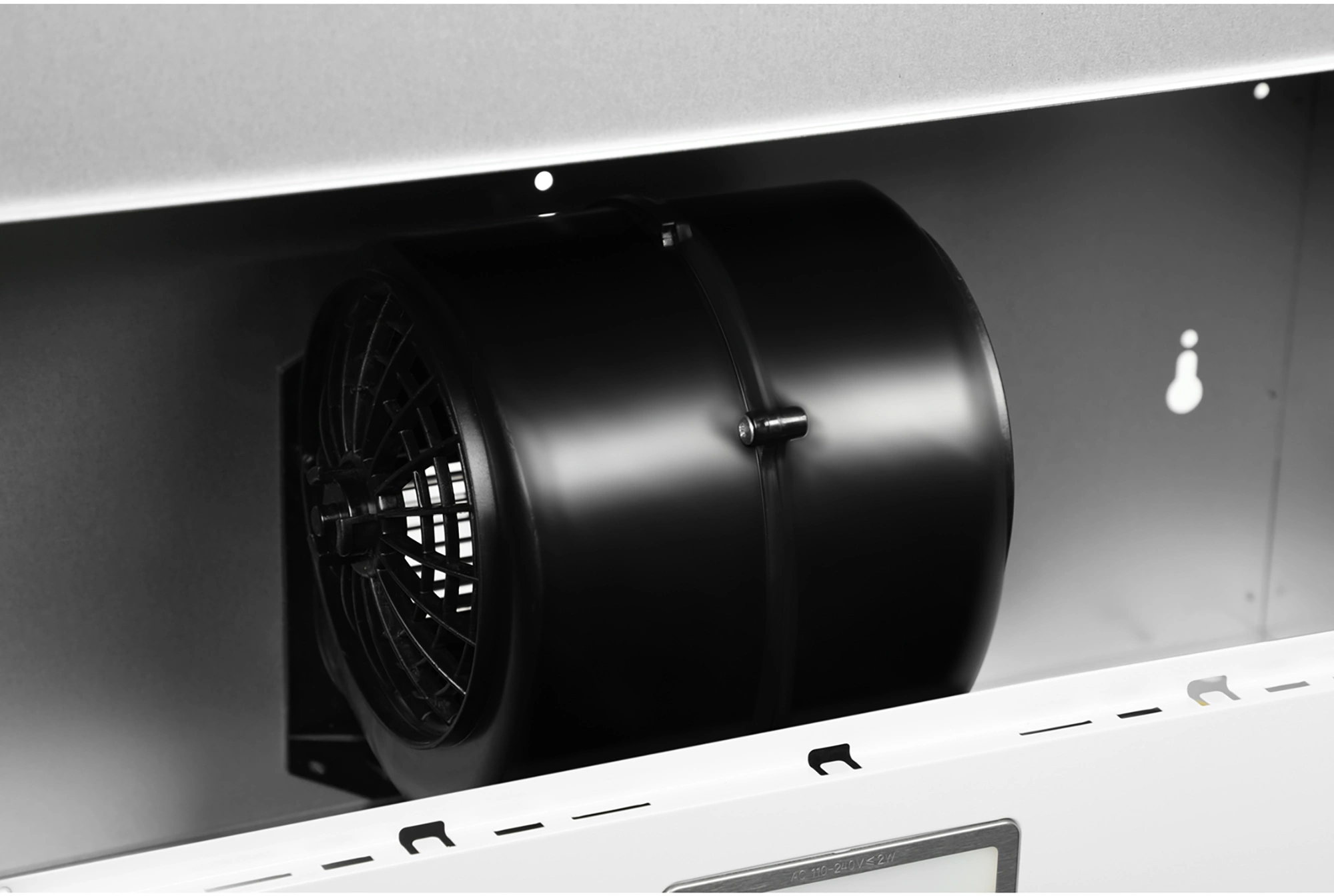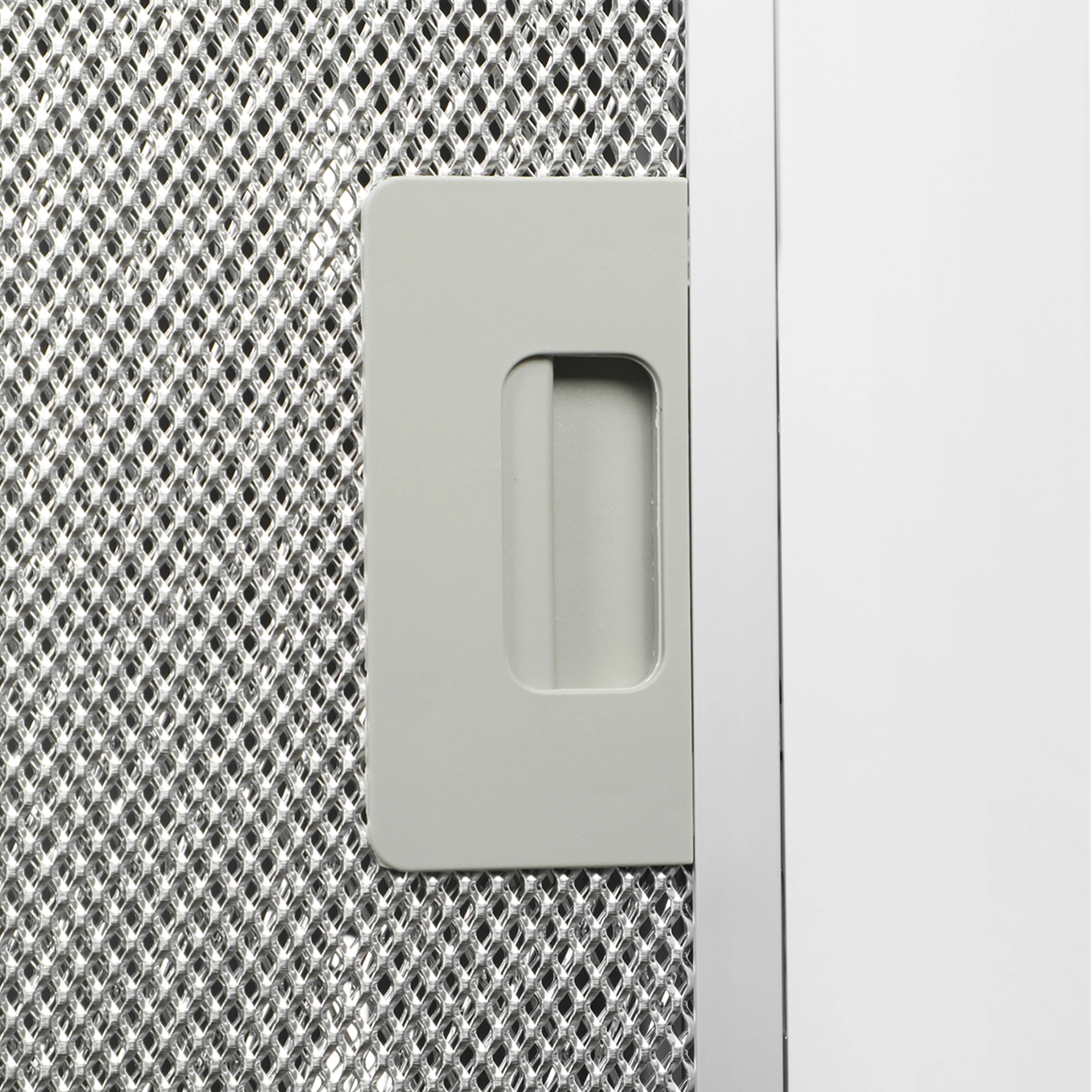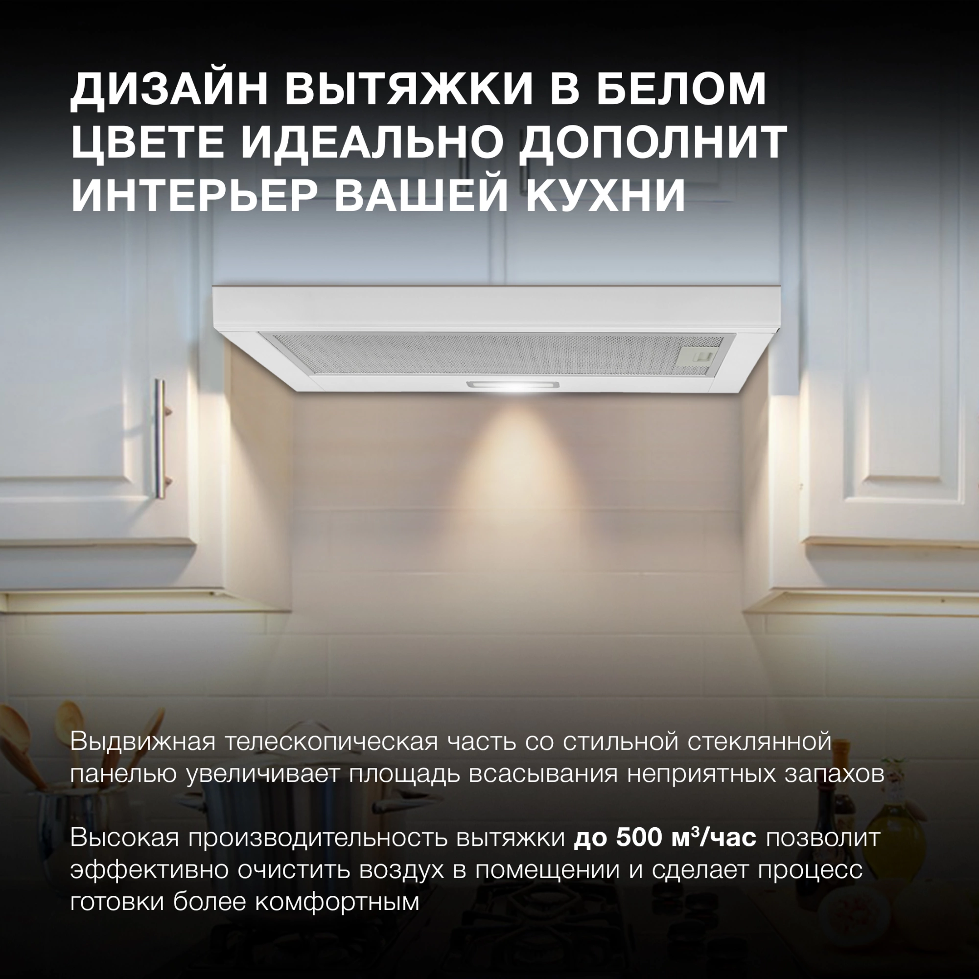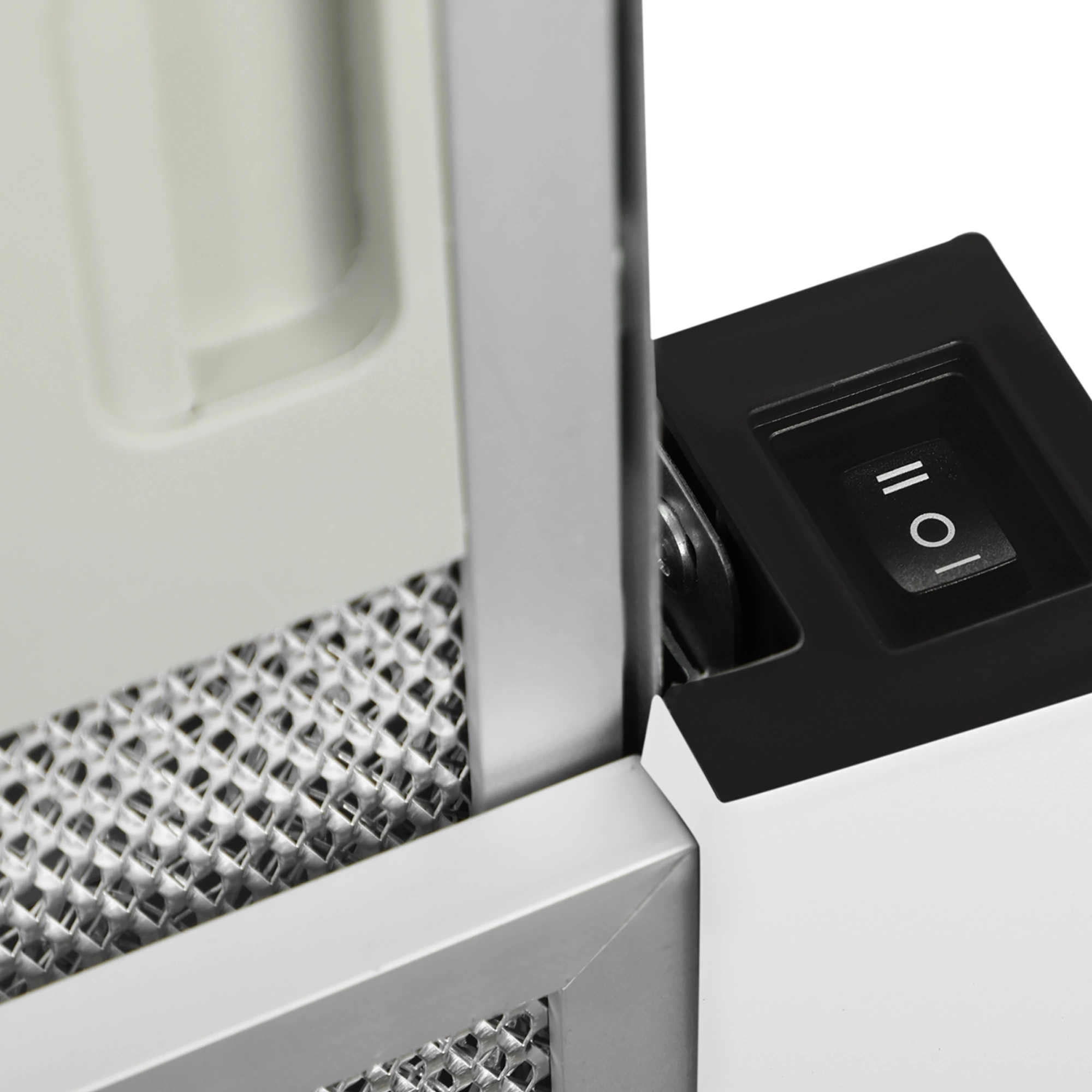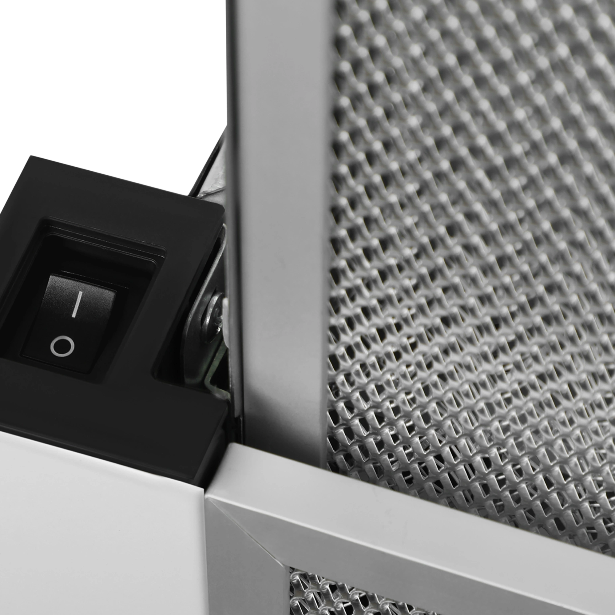 Минималистичный дизайн. Корпус вытяжки встраивается в навесной шкаф шириной 60 см. Глазу видна только лицевая стеклянная панель белого цвета. Она выглядит элегантно и подойдет к кухонным гарнитурам в светлых тонах. Выдвигайте лицевую панель вперед, чтобы включать вытяжку в заранее установленном режиме. Это позволит управлять прибором легче и быстрее.