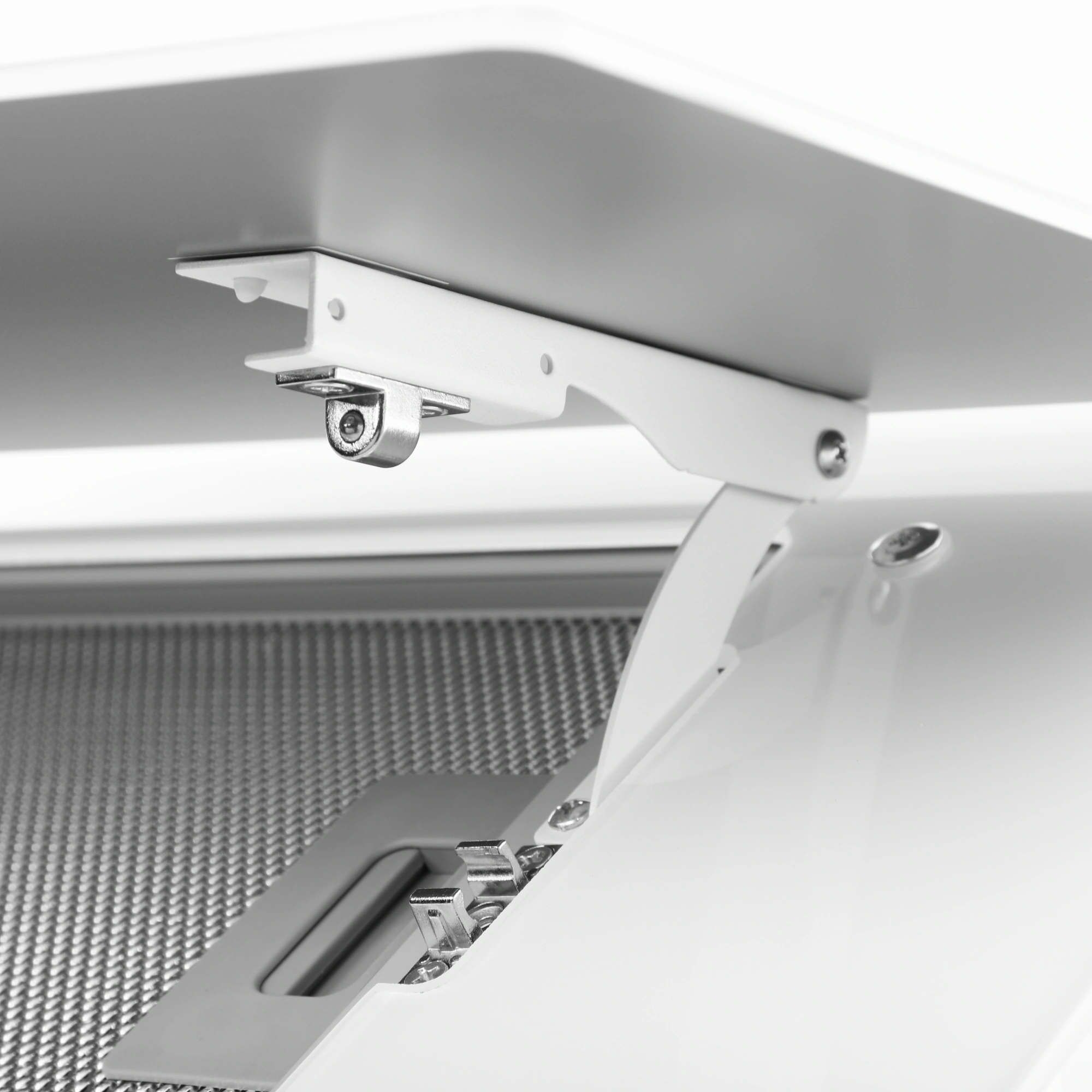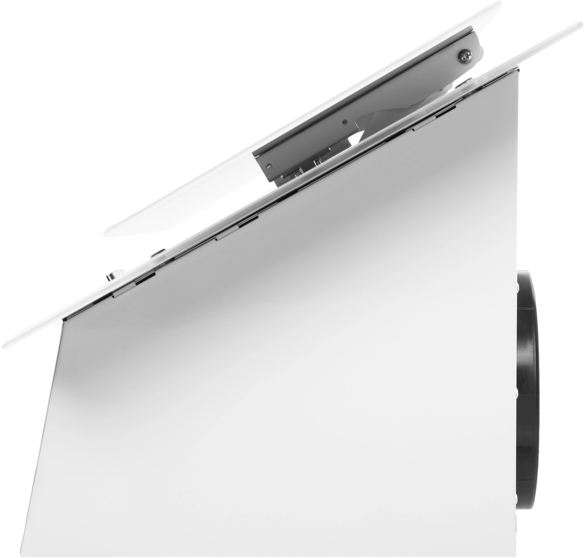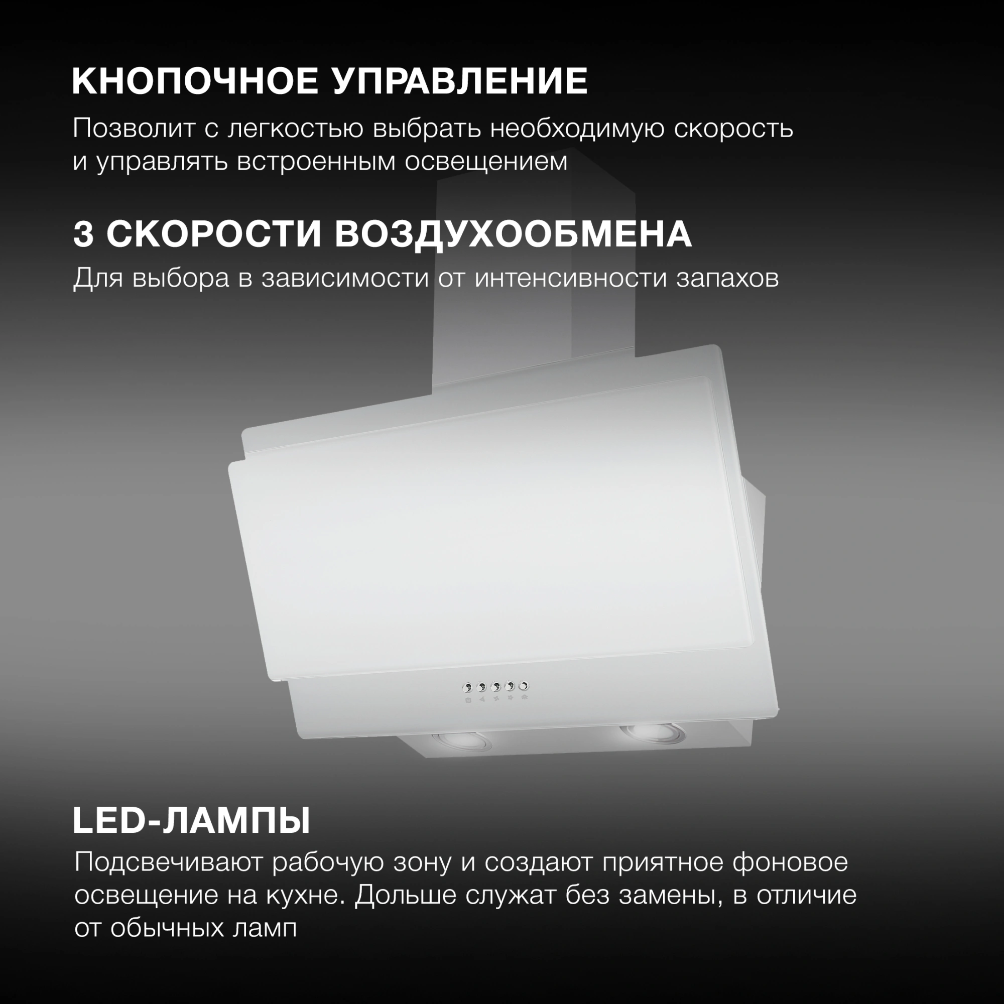 Современный и эргономичный дизайн. Корпус вытяжки шириной 60 см изготовлен из качественных износостойких материалов – стекла и металла. Жироулавливающий фильтр скрыт за декоративной панелью. Модель выполнена в элегантной белой расцветке и хорошо подойдет к кухонным гарнитурам в светлых тонах. Благодаря наклонной конструкции вытяжка не мешает при готовке: можно наклоняться над плитой без риска ушибиться.