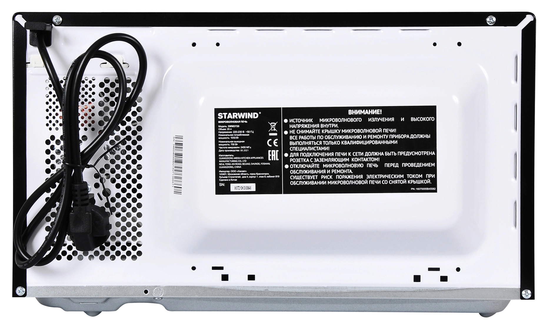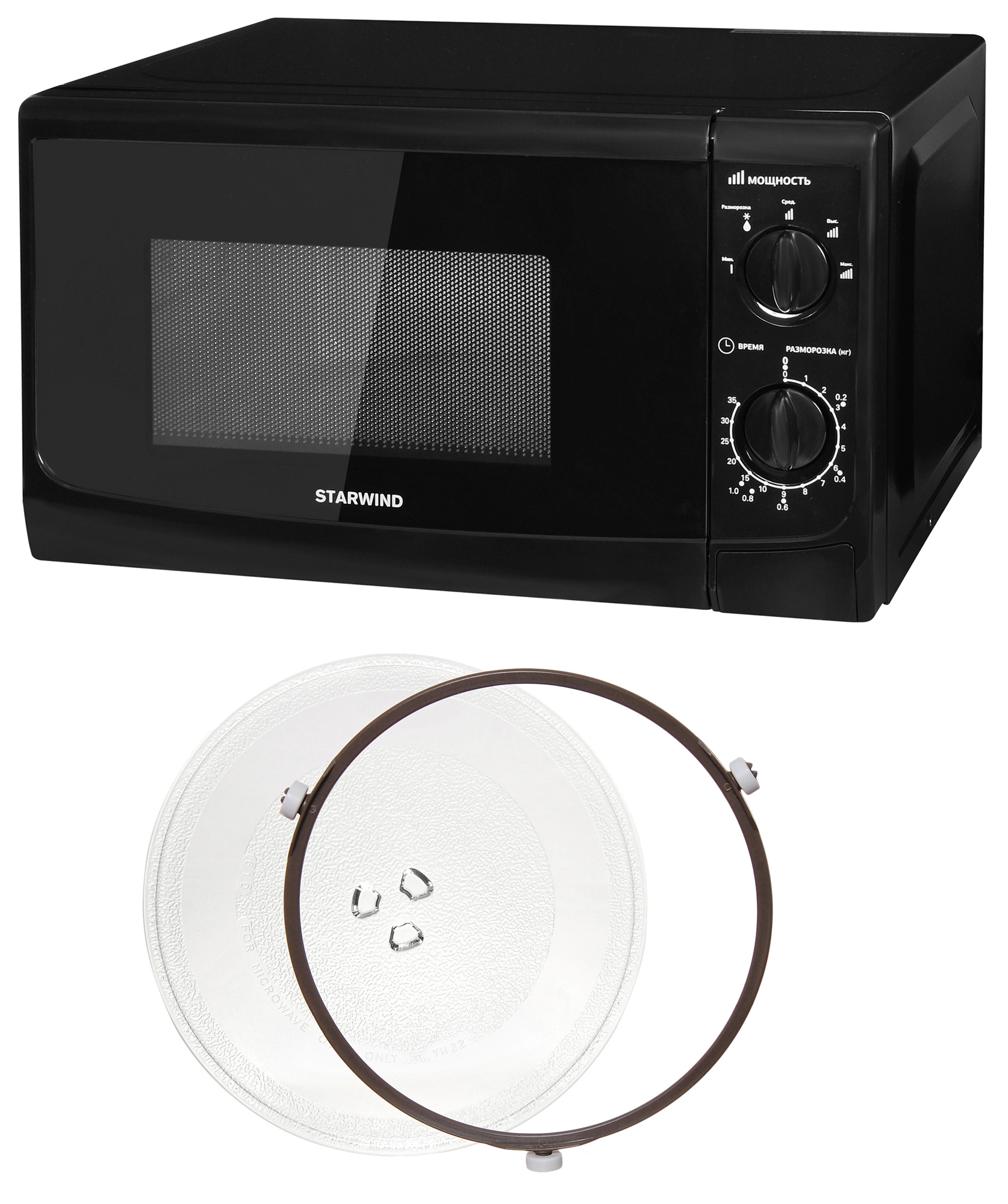 Корпус микроволновки Starwind выполнен в черном цвете, имеет достаточно привлекательный внешний вид. Отлично будет смотреться на любой кухне. Благодаря глянцевой поверхности внутри и снаружи, не создает сложностей в уходе. Дверца открывается мягко и бесшумно, с помощью кнопки.