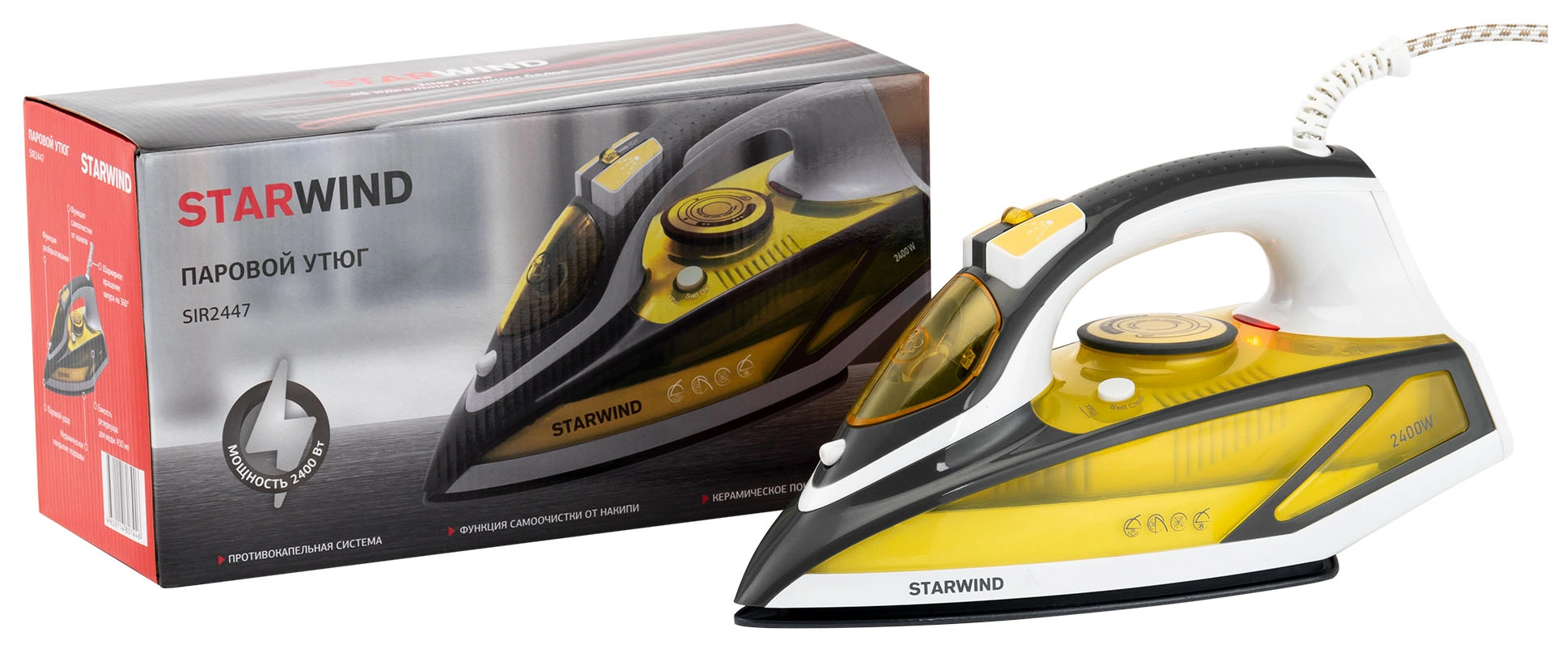 Утюг StarWind SIR2447 – выгодное решение для ухода за одеждой в домашних условиях. Устройство порадует своей производительностью и современным функционалом. Прежде всего, следует выбрать один из четырех температурных режимов согласно особенностям материала. Прибором можно пользоваться в классическом понимании, разложив одежду на гладильной доске, либо ухаживать за вещами при помощи режима вертикального отпаривания. В любом случае качество глажки будет на высоте. Кроме того, в устройстве предусмотрена система самоочистки от накипи. Это значит, что прибор прослужит хозяйке и домочадцам длительный период времени.