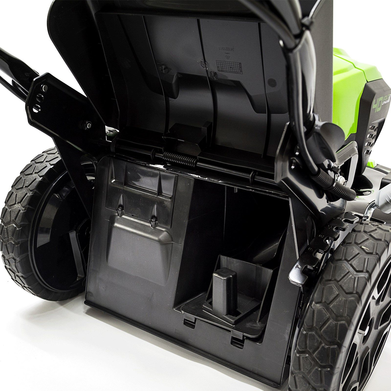 Бесщёточный мотор DigiPro. Самоходная функция. Мощность, сопоставимая с бензиновыми аналогами. Возможность установки двух аккумуляторных батарей. Система защиты двигателя от механических повреждений. Складная ручка для удобства хранения.