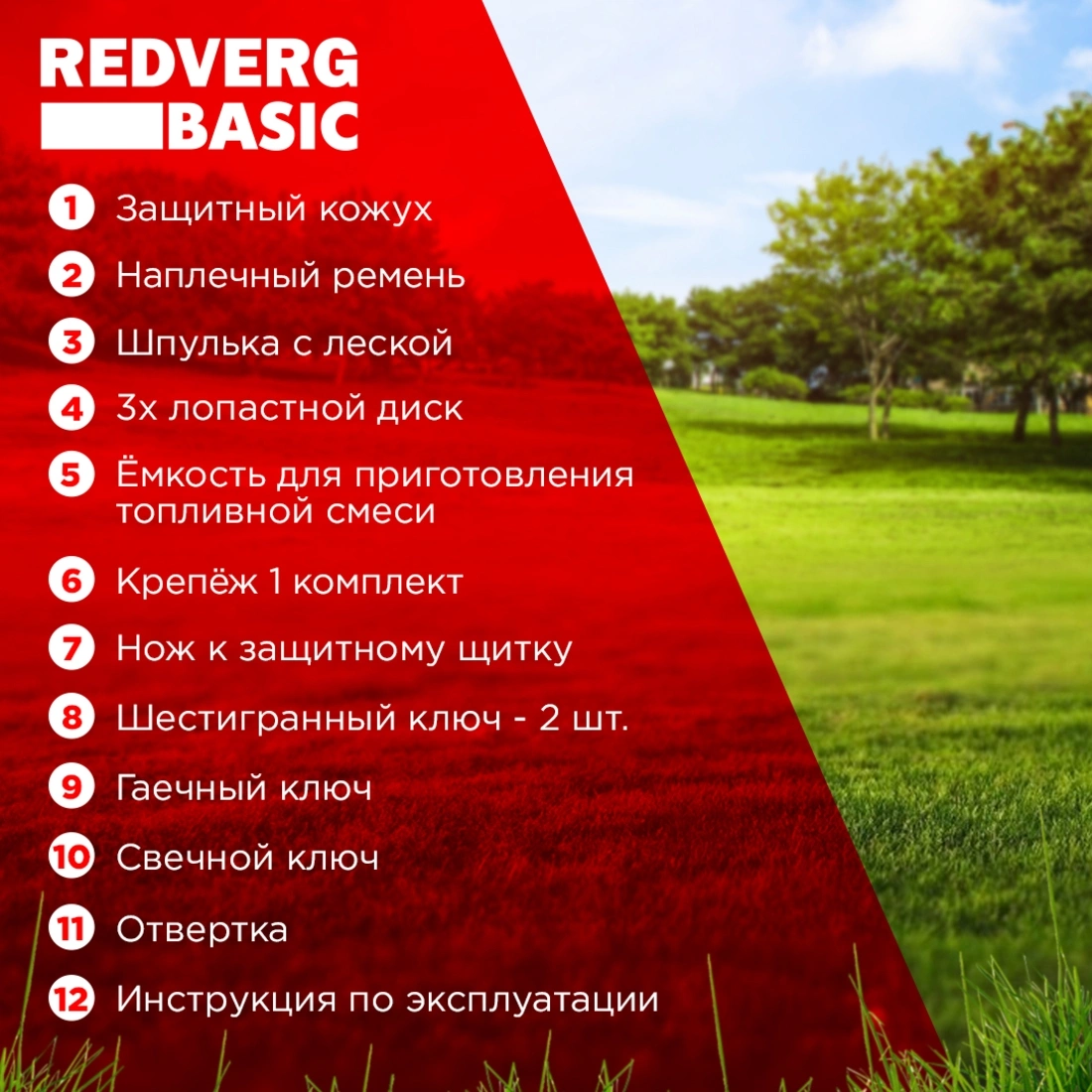 Триммер бензиновый, Ручка, Штанга, Режущий диск, катушка с леской, Защитный щиток, Наплечный ремень.