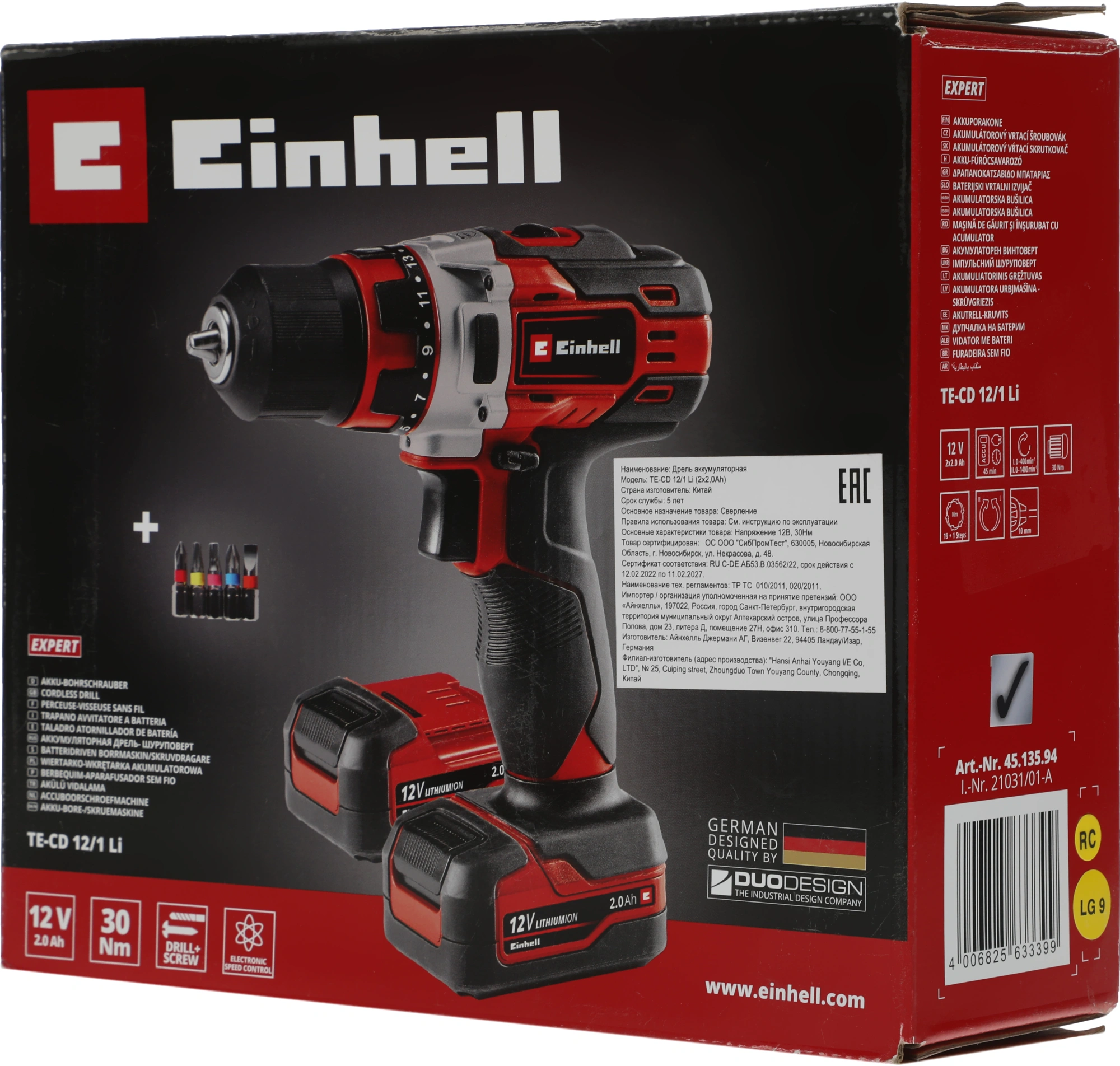 Дрель-шуруповерт, аккумуляторная батарея - 2 шт., зарядное устройство, коробка с магнитным замком.