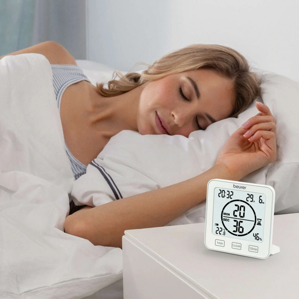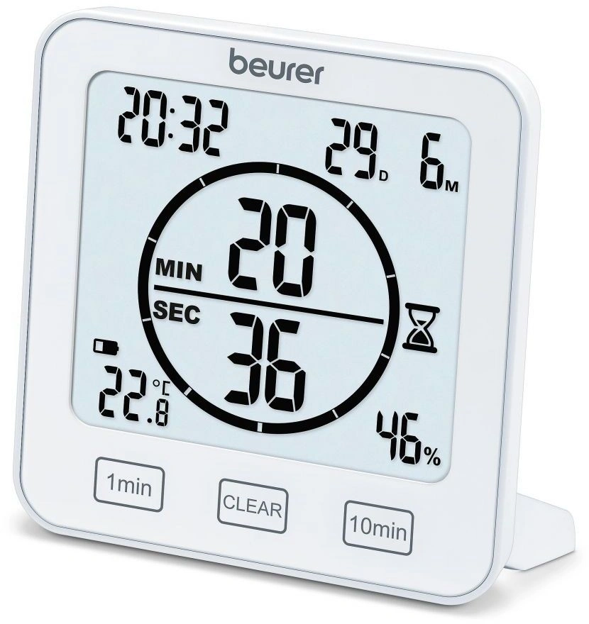 Индикация температуры, влажности воздуха, времени и даты. С функцией таймера: регулировка с помощью сенсорных кнопок, со звуковым сигналом.Индикатор необходимости замены батареек. Большой, хорошо читаемый дисплей
