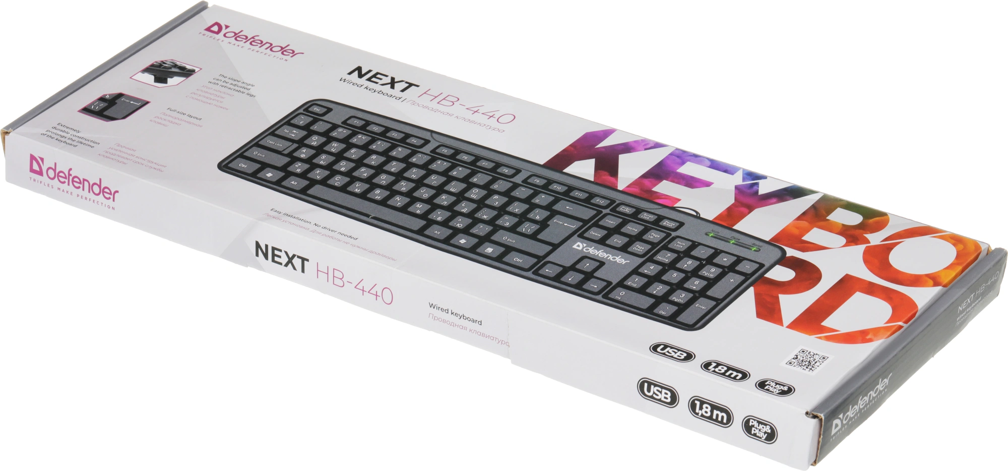 Прочная усиленная конструкция продлевает срок службы клавиатуры. Полноразмерная раскладка клавиш. Угол наклона клавиатуры регулируется с помощью ножек. Легкая установка. Для работы не нужны драйверы.