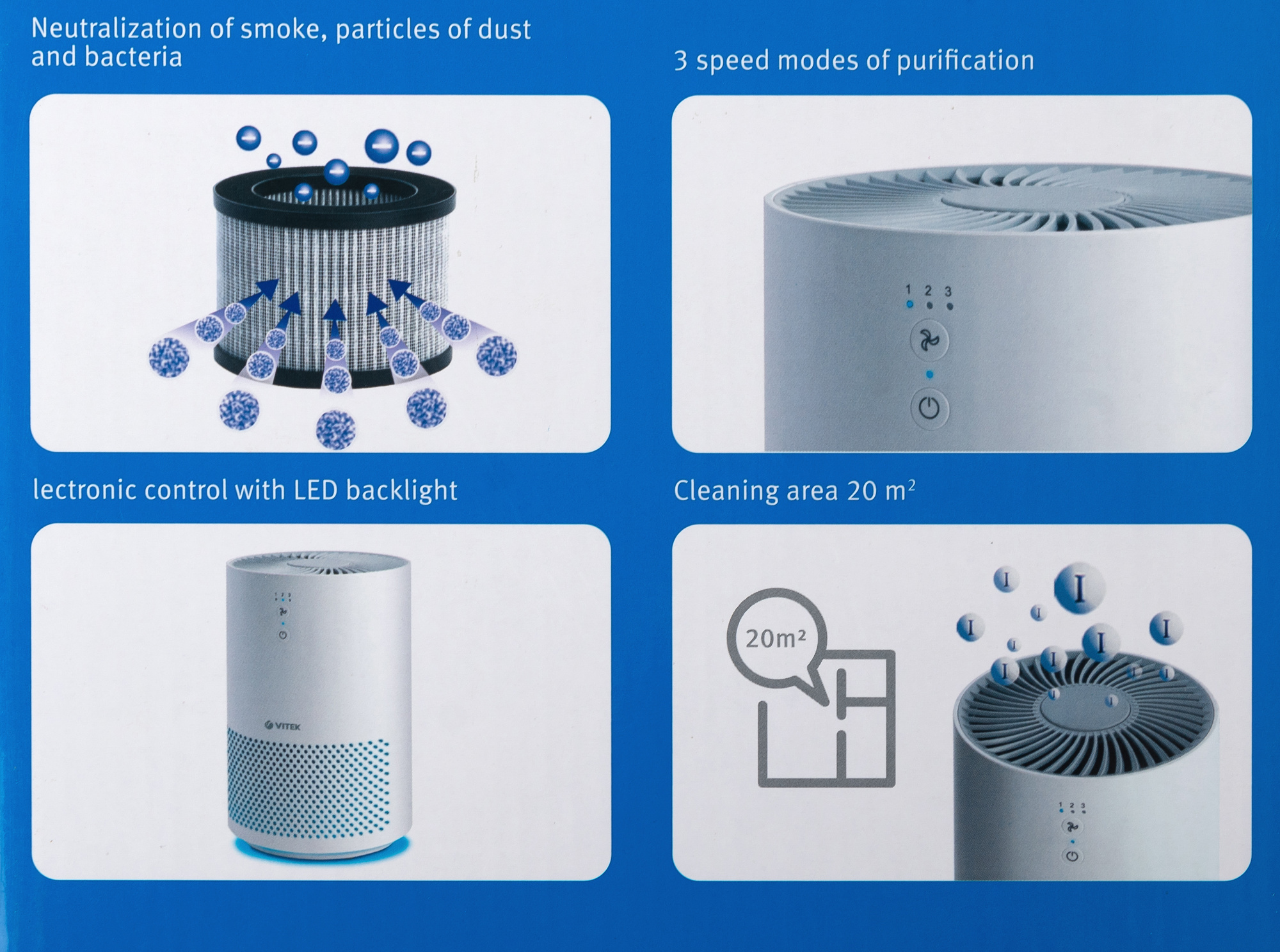 Создать в помещении площадью 20 м2 идеальный микроклимат способен очиститель воздуха VITEK VT-8553. Простое и понятное электронное управление позволяет легко выбрать одну из трех скоростей работы прибора, идеально подходящую именно вам. Благодаря системе фильтрации с НЕРА-фильтром, устройство очищает воздух от дыма, частиц пыли и бактерий, обеспечивая идеальные условия для жизни или работы. Красивая LED-подсветка корпуса в процессе работы прибора способствует созданию в комнате особенно уютной атмосферы.