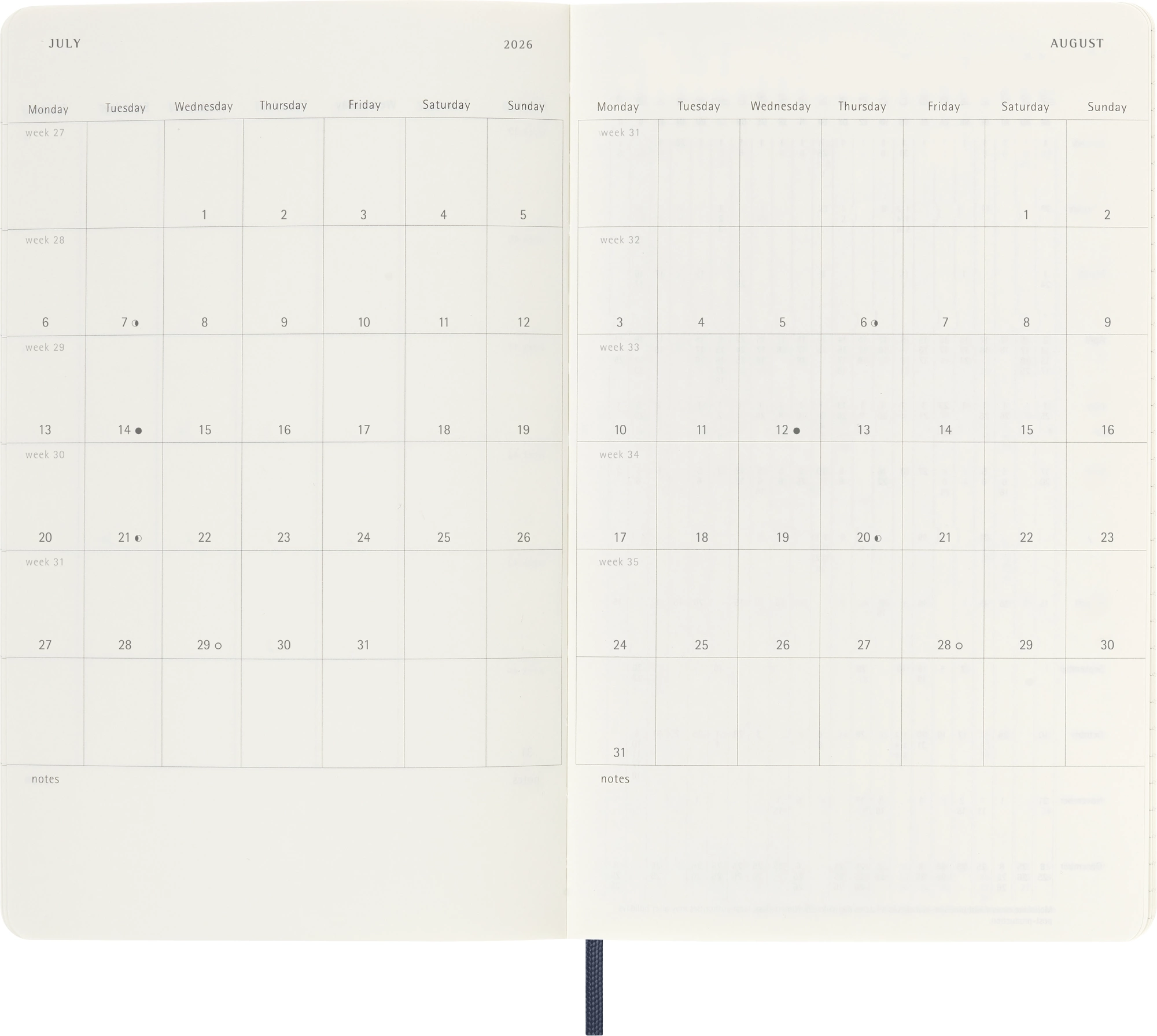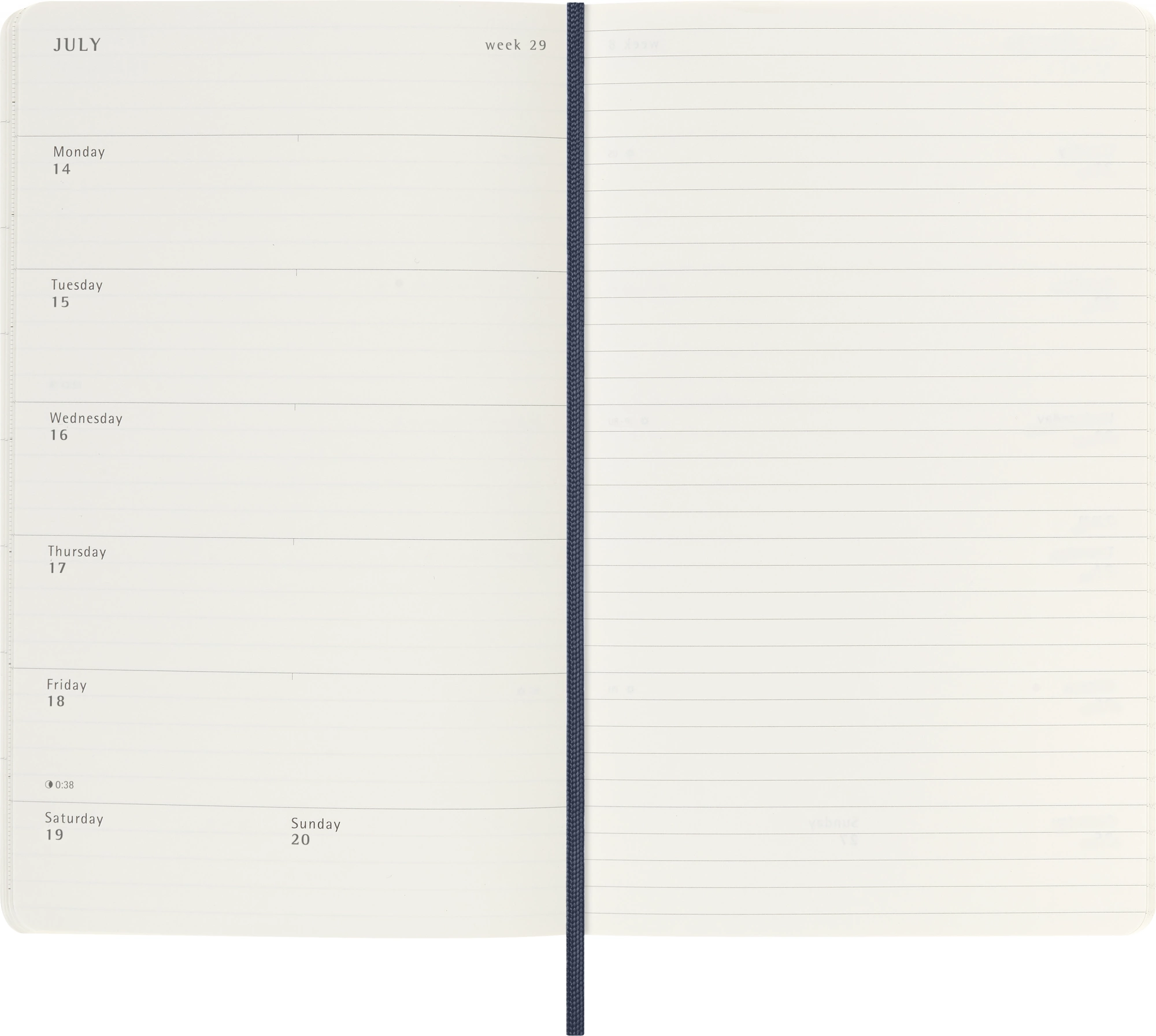 Записная книжка-еженедельник Moleskine в твердой обложке рассчитан на 18 месяцев, начиная с июля и заканчивая декабрем. На левой странице отображаются намеченные на текущую неделю встречи, а правая линованная страница предназначена для записи заметок и идей.