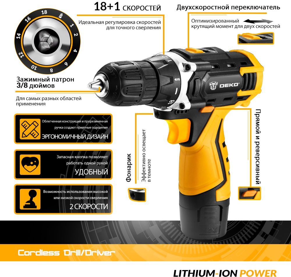 Идеальная регулировка для точного сверления благодаря 18-ти крутящих моментов. Зажимной патрон 3/8 дюймов для самых разных областей применения. Удобство благодаря запасной кнопке, позволяющей работать одной рукой.