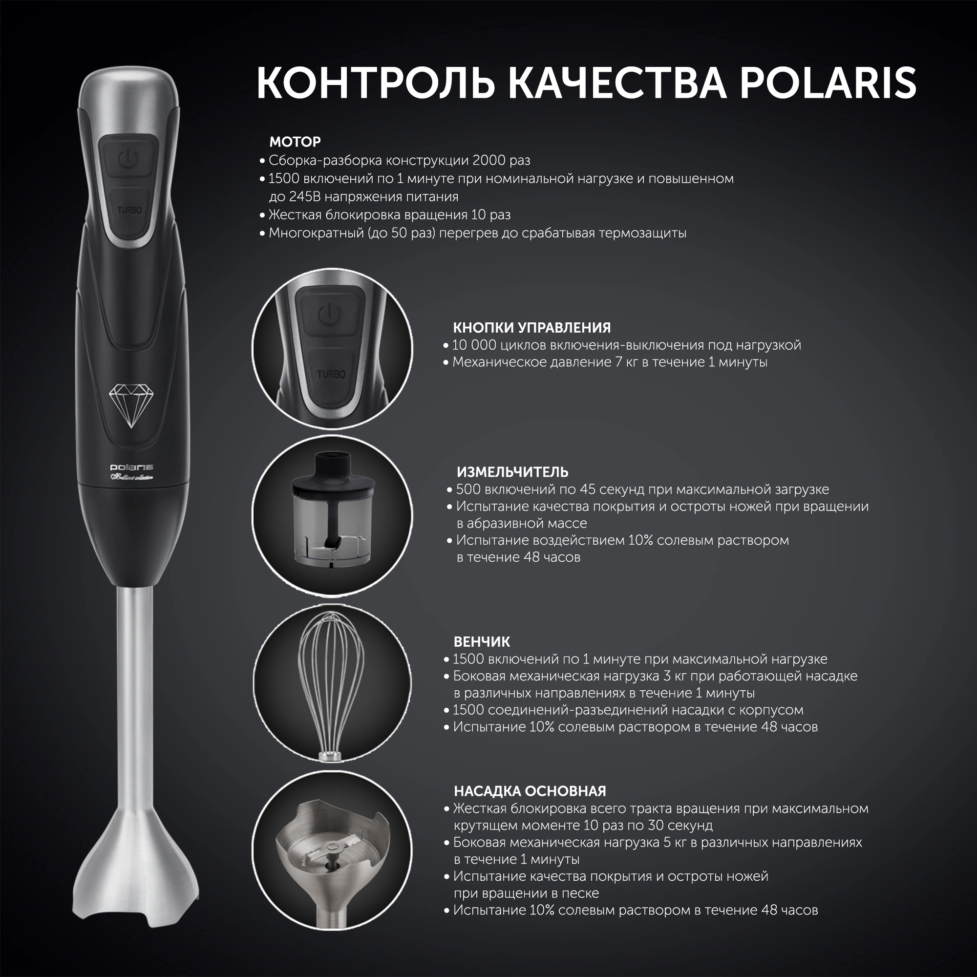 измельчение твердых продуктов, регулировка скорости вращения, режим колки льда, режим Турбо, функция взбивания