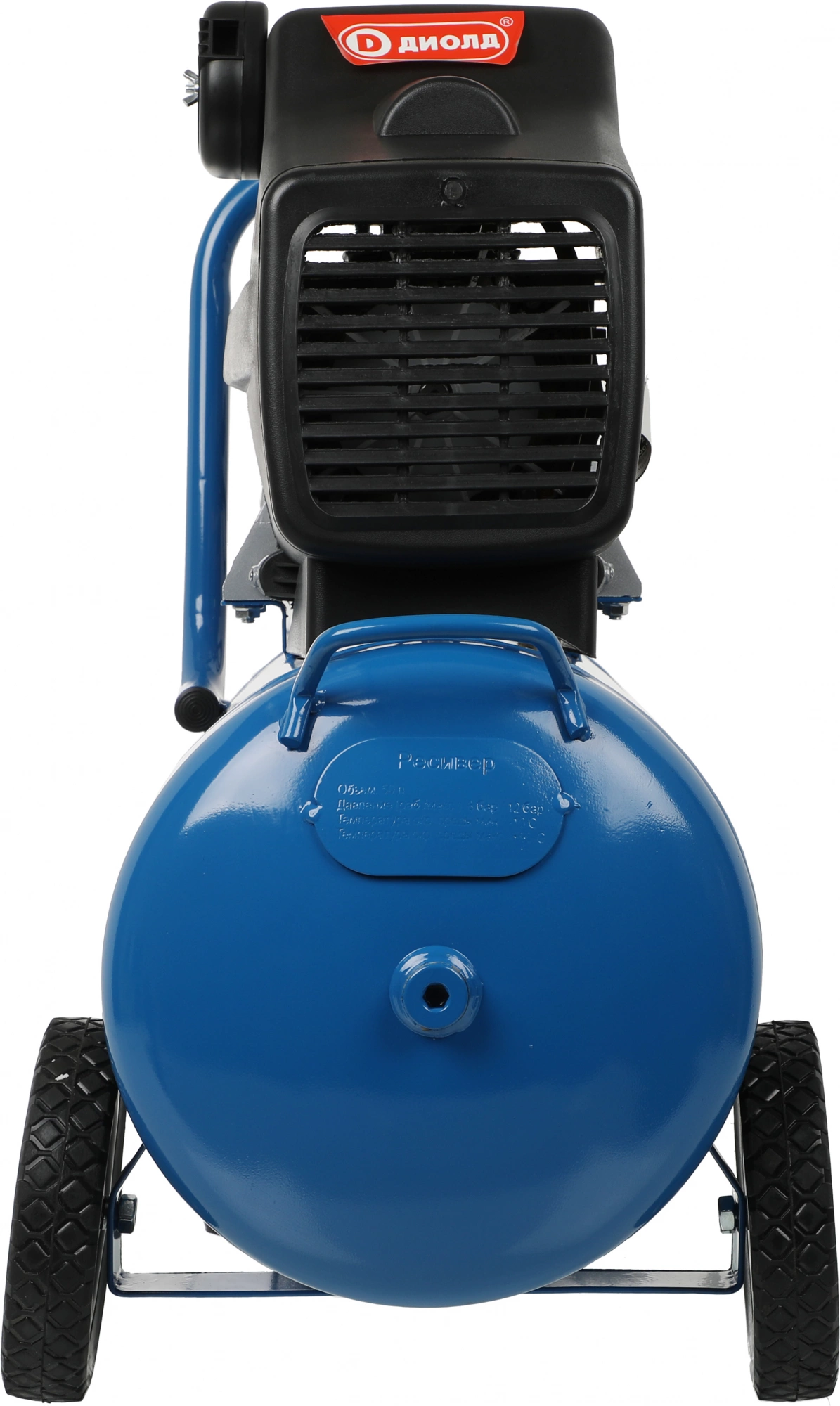 Компрессор, Колесо - 2шт., Воздушный фильтр, Сапун (пробка горловины заливки масла), Опора передняя - 2шт., Комплект крепления опоры (болт М8х25, гайка М8) - 2шт., Комплект крепления колеса (винт специальный резьба М10х17, шайба 10 (2 шт), шайба пружинная 10, гайка М10) - 2шт., Емкость с маслом