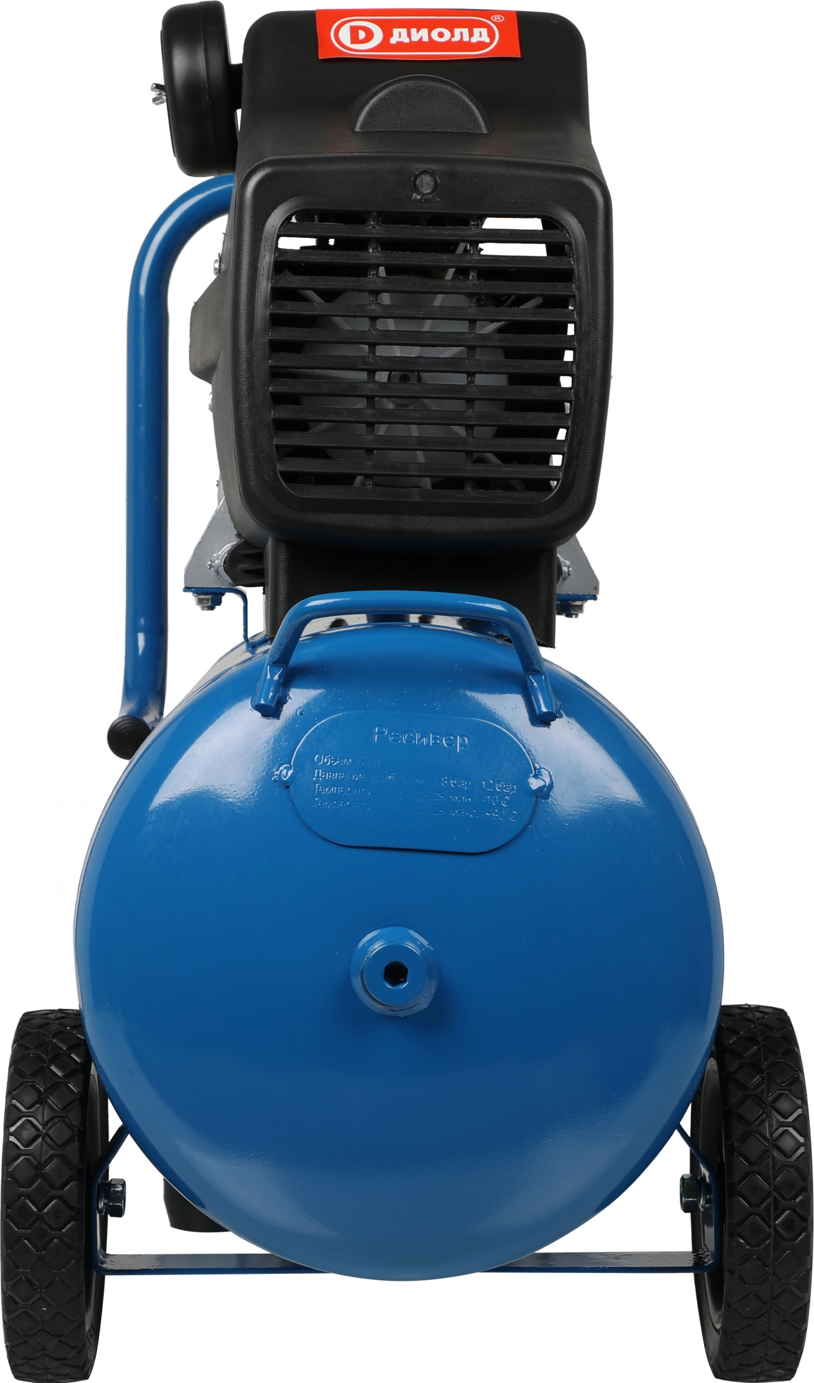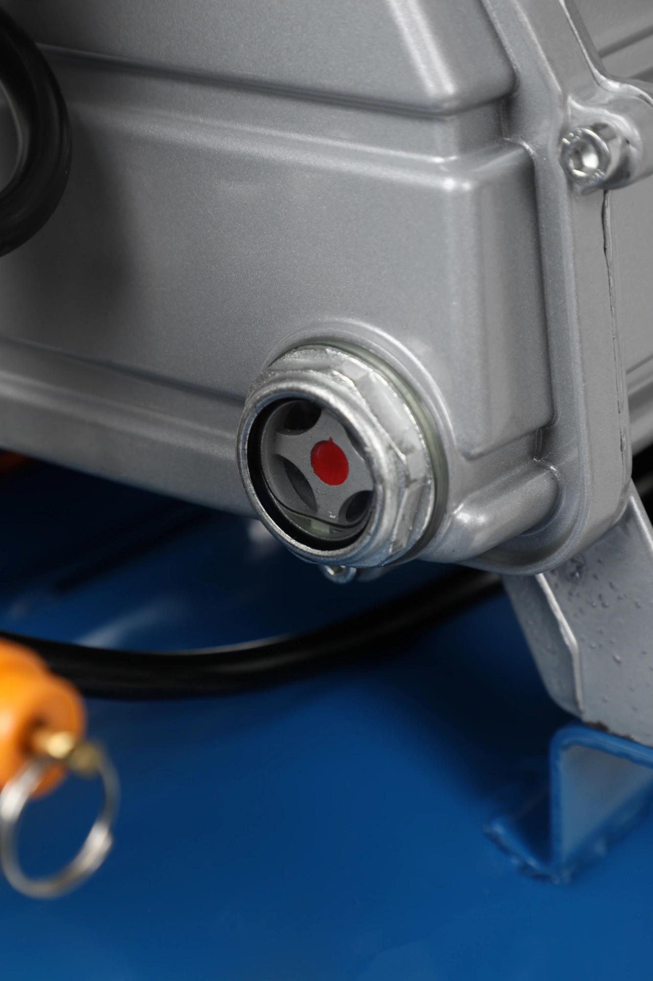 Компрессор, Колесо - 2шт., Воздушный фильтр, Сапун (пробка горловины заливки масла), Опора передняя - 2шт., Комплект крепления опоры (болт М8х25, гайка М8) - 2шт., Комплект крепления колеса (винт специальный резьба М10х17, шайба 10 (2 шт), шайба пружинная 10, гайка М10) - 2шт., Емкость с маслом