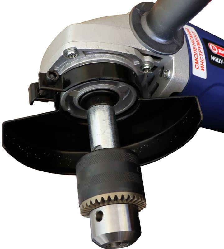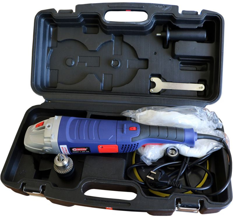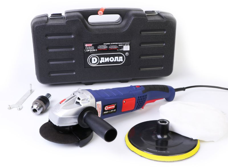 Углошлифовальная машина, Щетка - 2шт., Рукоятка дополнительная, Ключ, Полировальная насадка, Патрон сверлильный с ключом, Переходник для патрона, Шлифовальная шкурка O180мм, Платформа для полировальных и шлифовальных насадок, Кейс