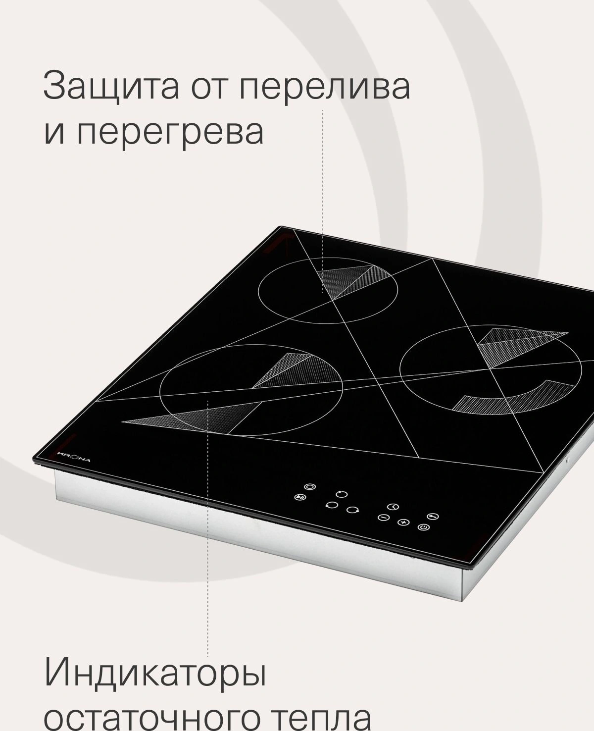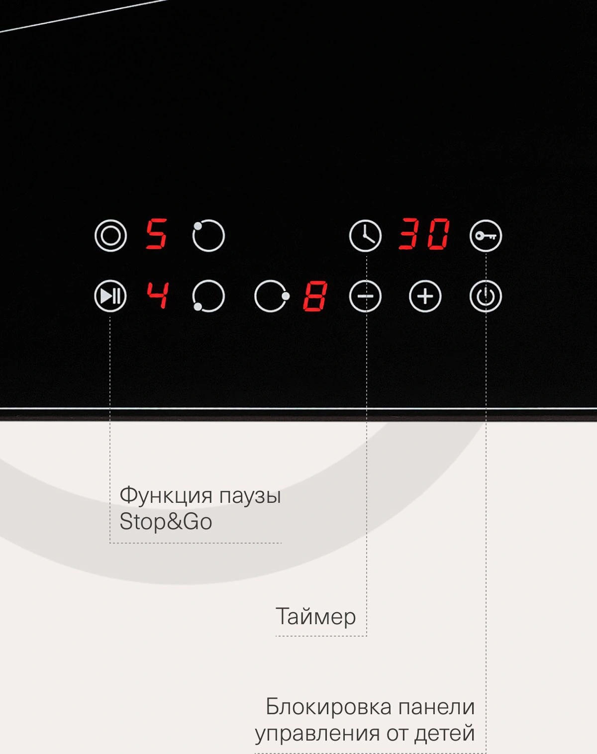 блокировка управления (защита от детей), защитное отключение, отключение при проливе жидкости