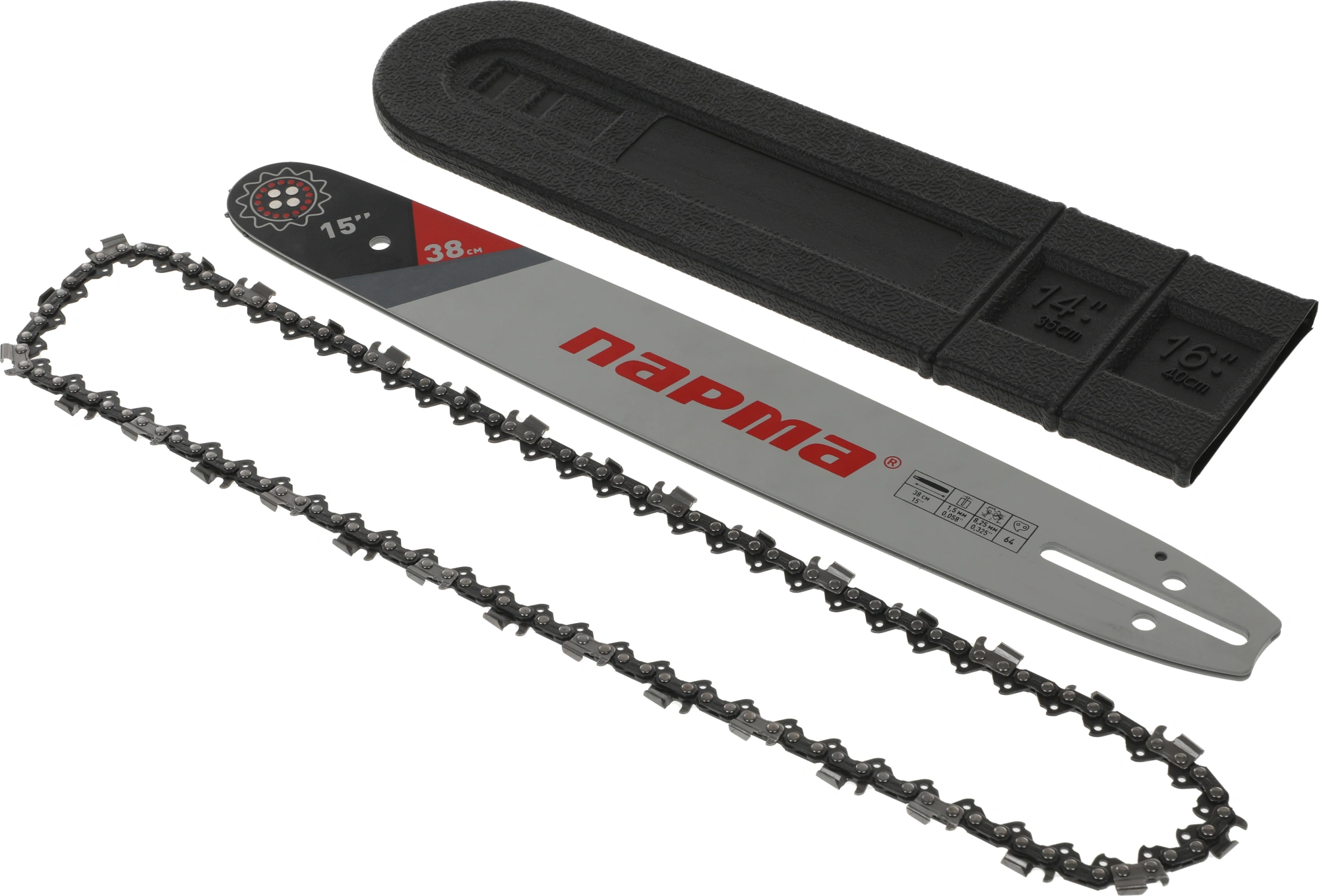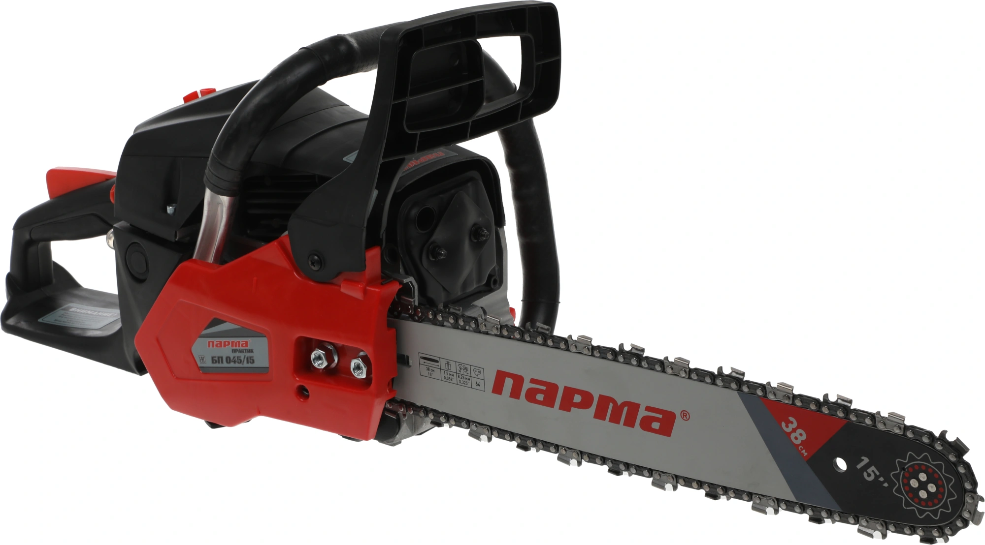Бензопила, цепь, шина, чехол для шины, емкость для топливной смеси, ключ-отвертка, отвертка для регулировки карбюратора, шестигранный ключ, зубчатый упор с крепежом, инструкция, упаковка.