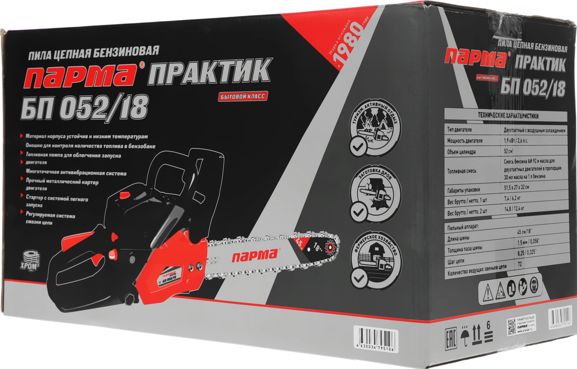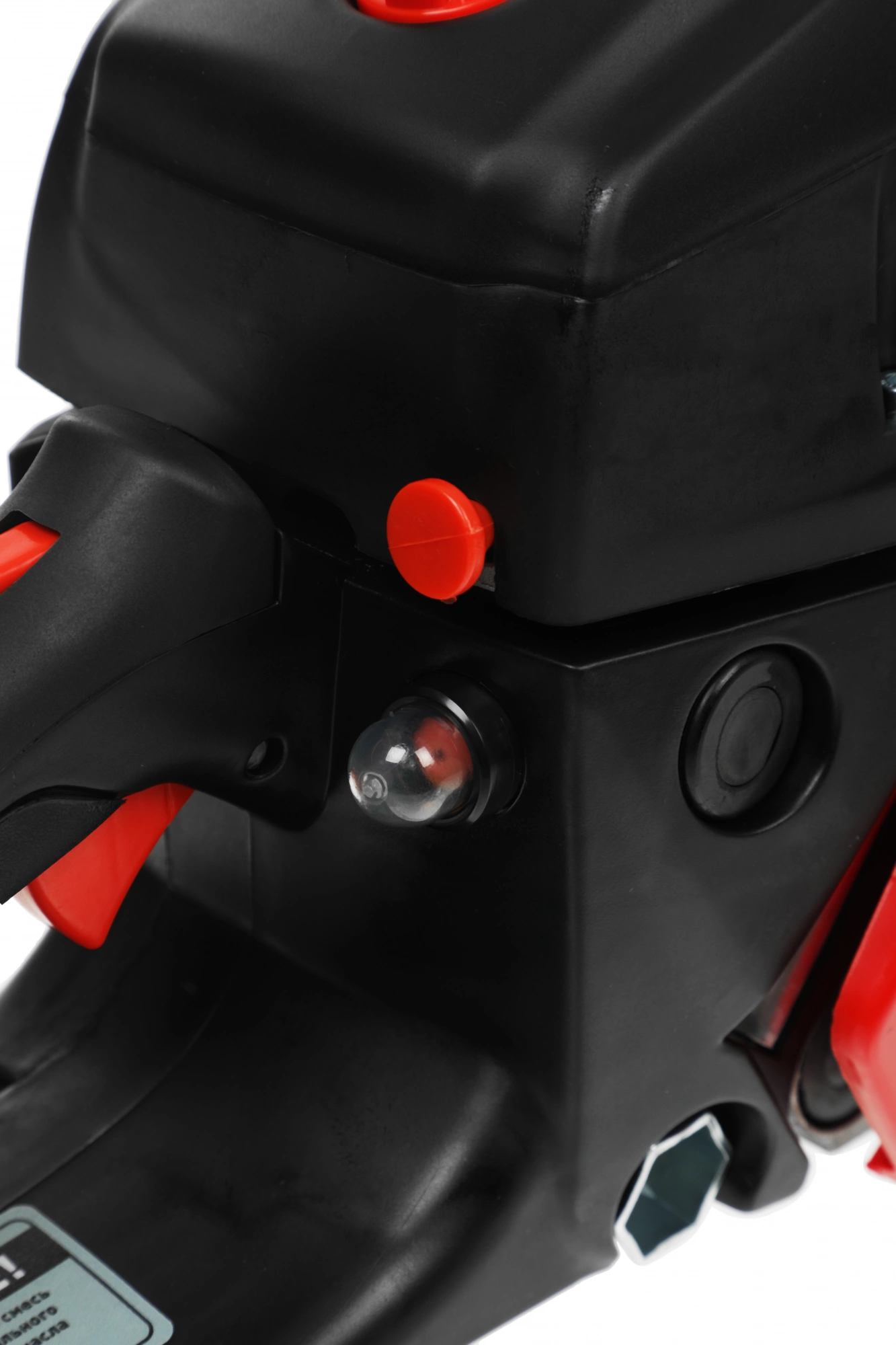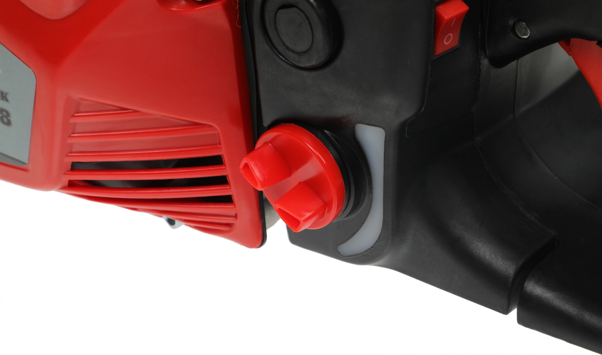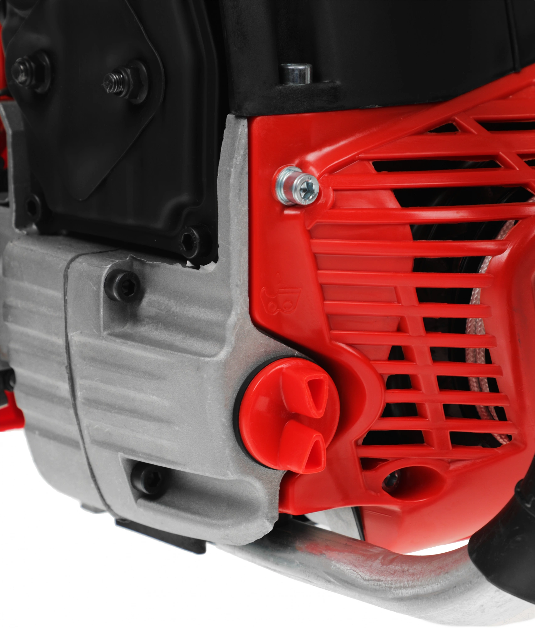 Материал корпуса устойчив к низким температурам. Окошко для контроля количества топлива в бензобаке. Топливная помпа для облегчения запуска двигателя. Многоточечная антивибрационная система. Прочный металлический картер двигателя. Стартер с системой легкого запуска. Регулируемая система смазки цепи.