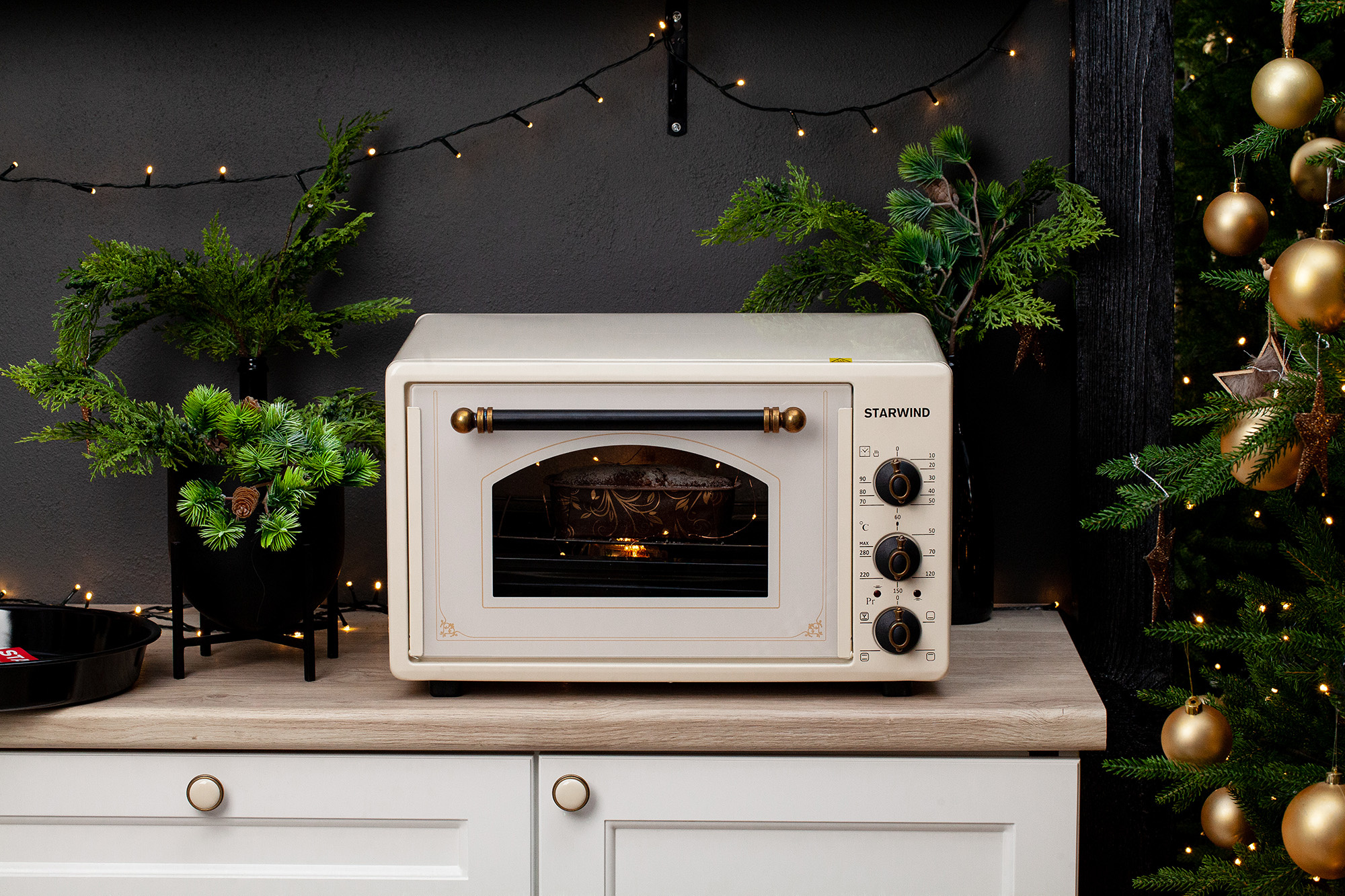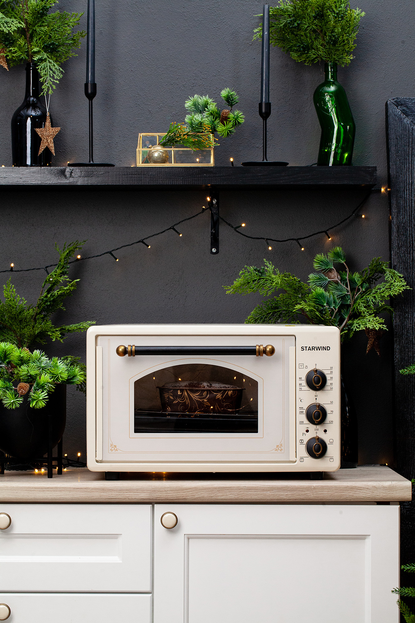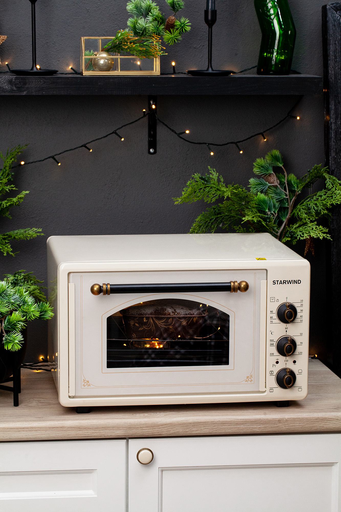 Электропечь Starwind SMO2026 сразу привлекает к себе внимание уникальным внешним видом, выполнена в ретро-стиле. Устройство представляет собой металлический корпус, на фронтальной части которого имеется стеклянная дверь. Выполнен бытовой прибор в светло-бежевом цвете, а ручки и переключатели стилизованы под старину. Мощность электрической печи составляет порядка 1300 Вт, а объем внутреннего пространства равен 36 литрам. Допускается приготовление блюд в различных температурных режимах – от 50 до 280 градусов Цельсия. Пользователю предлагается включить один из четырех режимов функционирования.