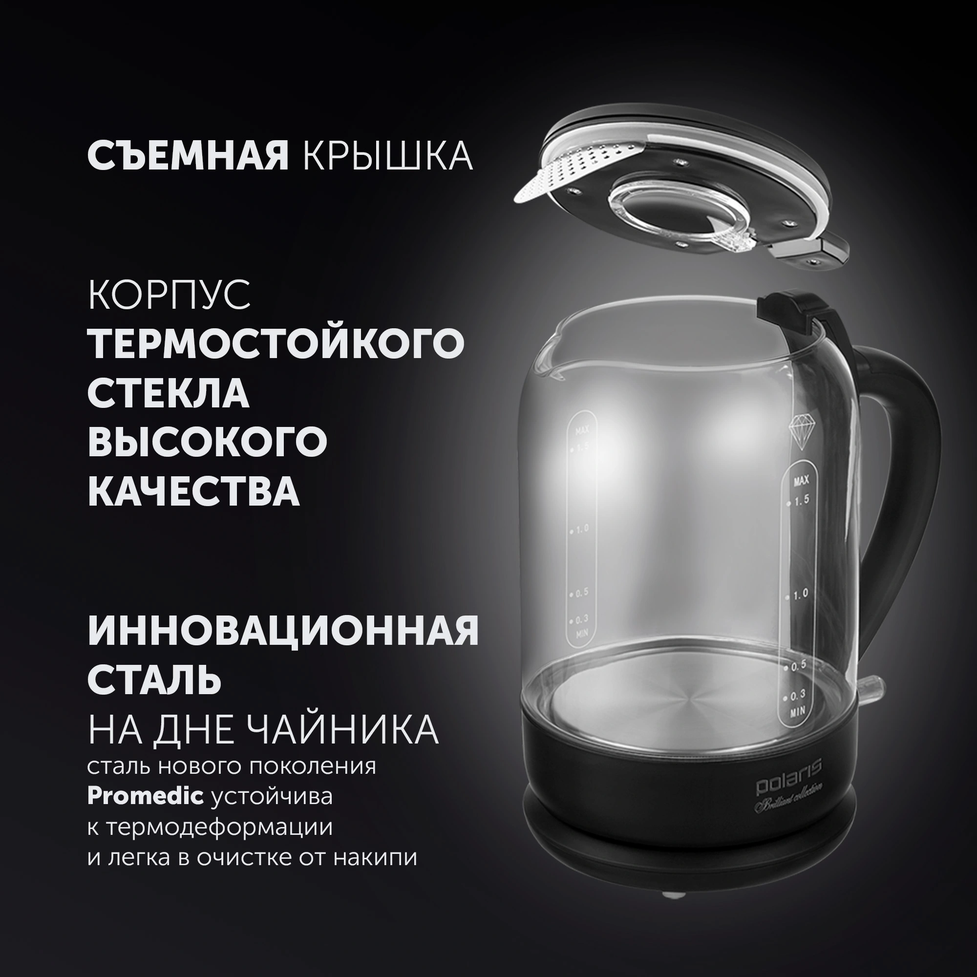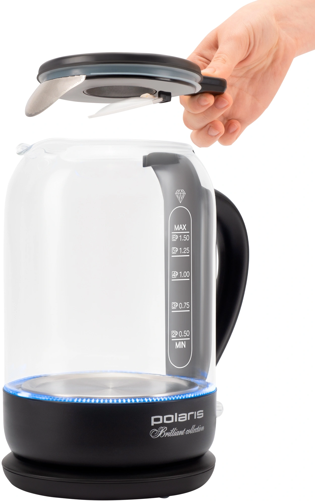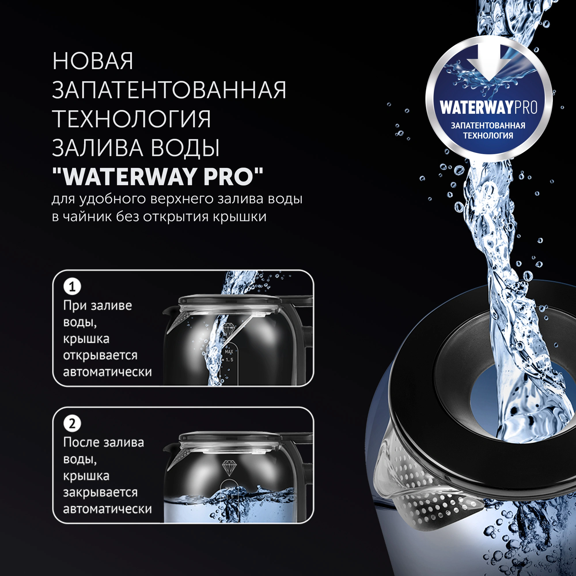 Особенностью стеклянного электрического чайника PWK 1753CGL является новая запатентованная технология верхнего залива воды """"WATERWAY PRO"""" без открытия крышки.