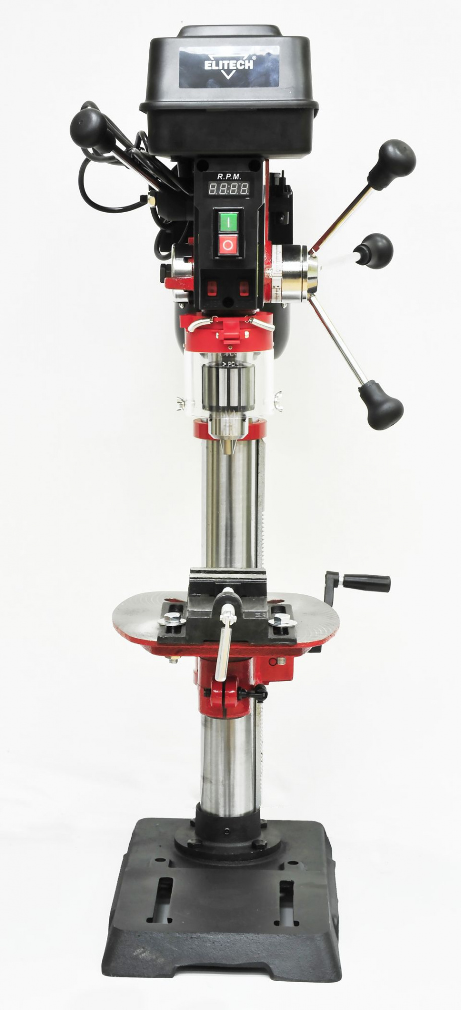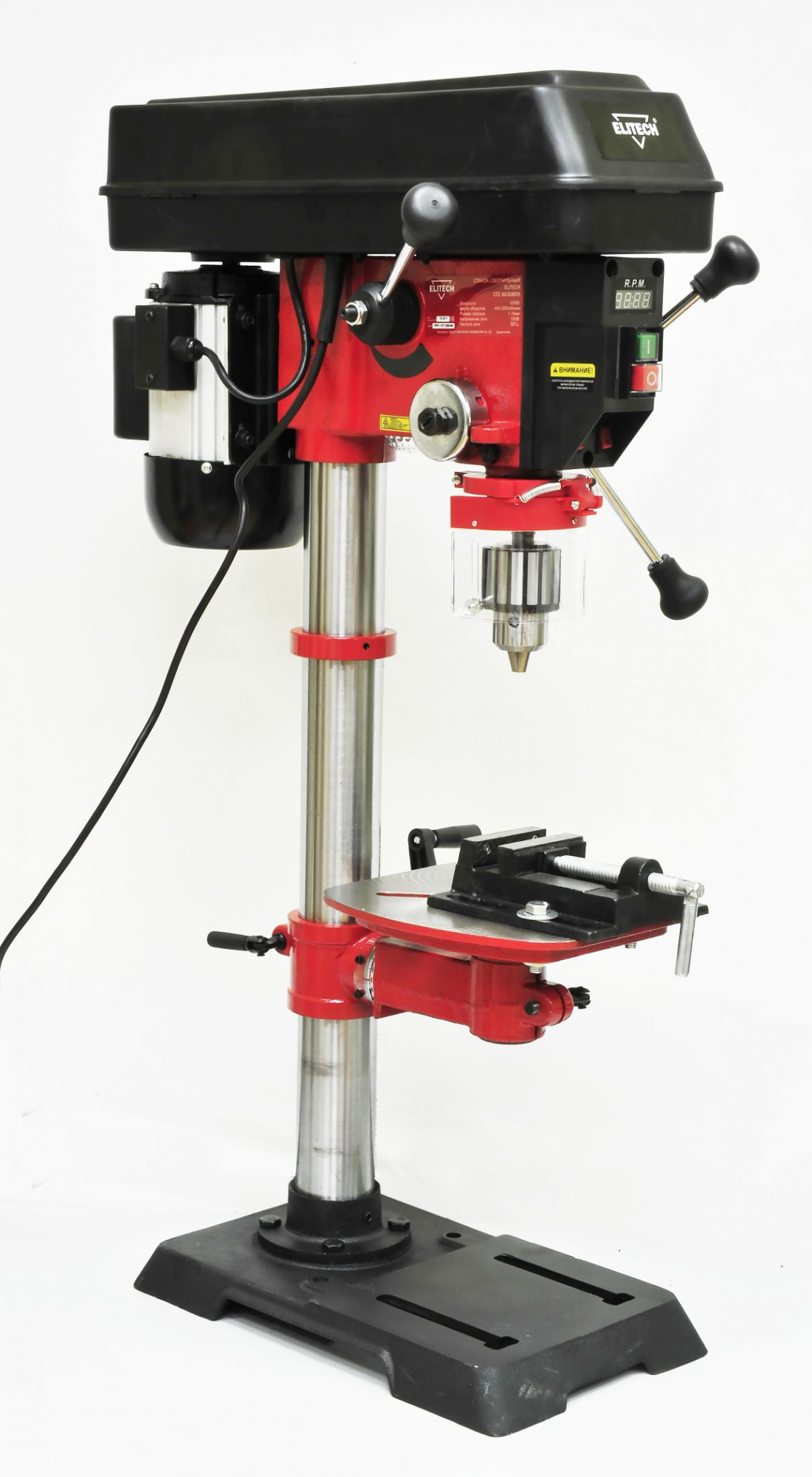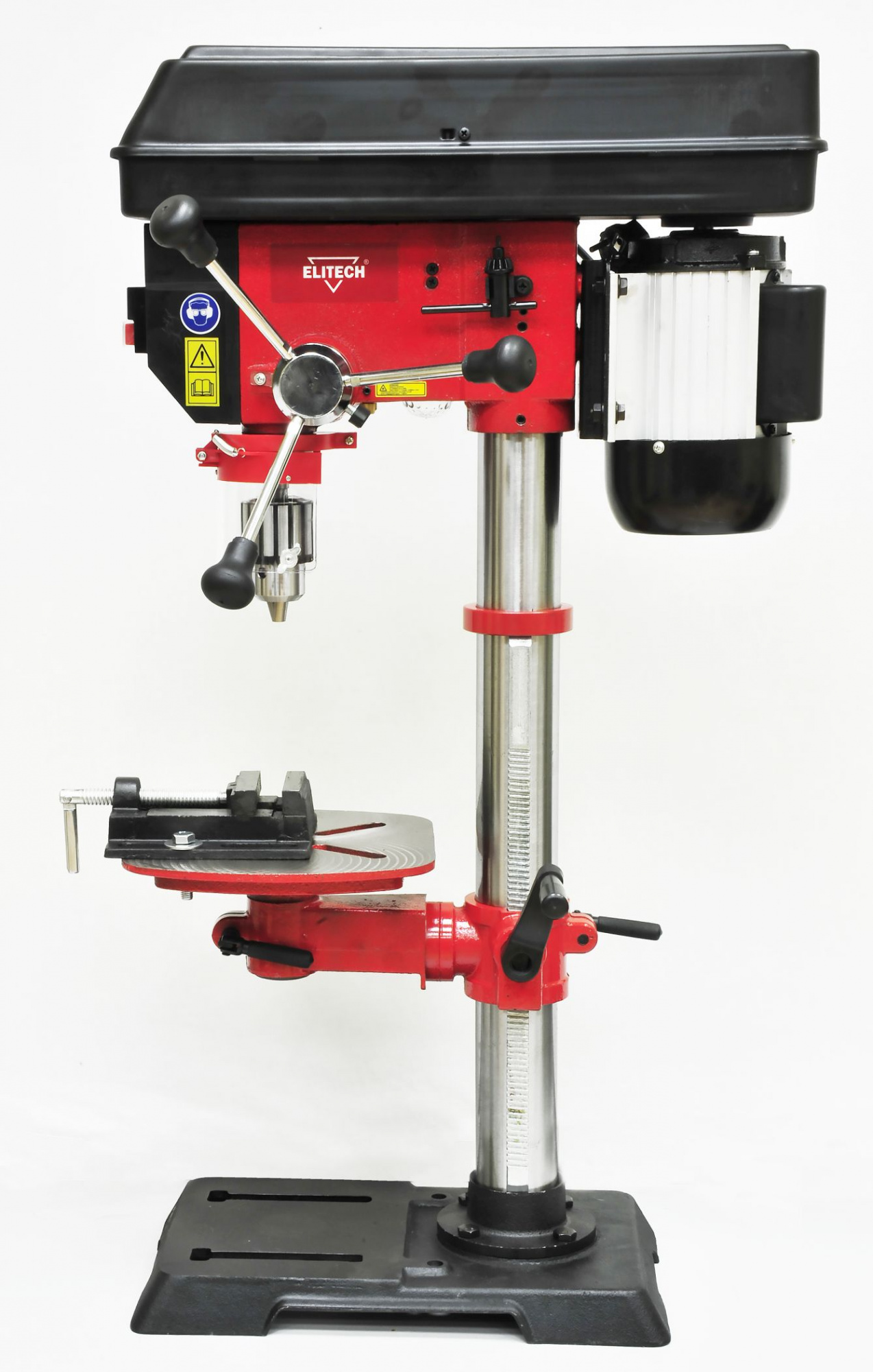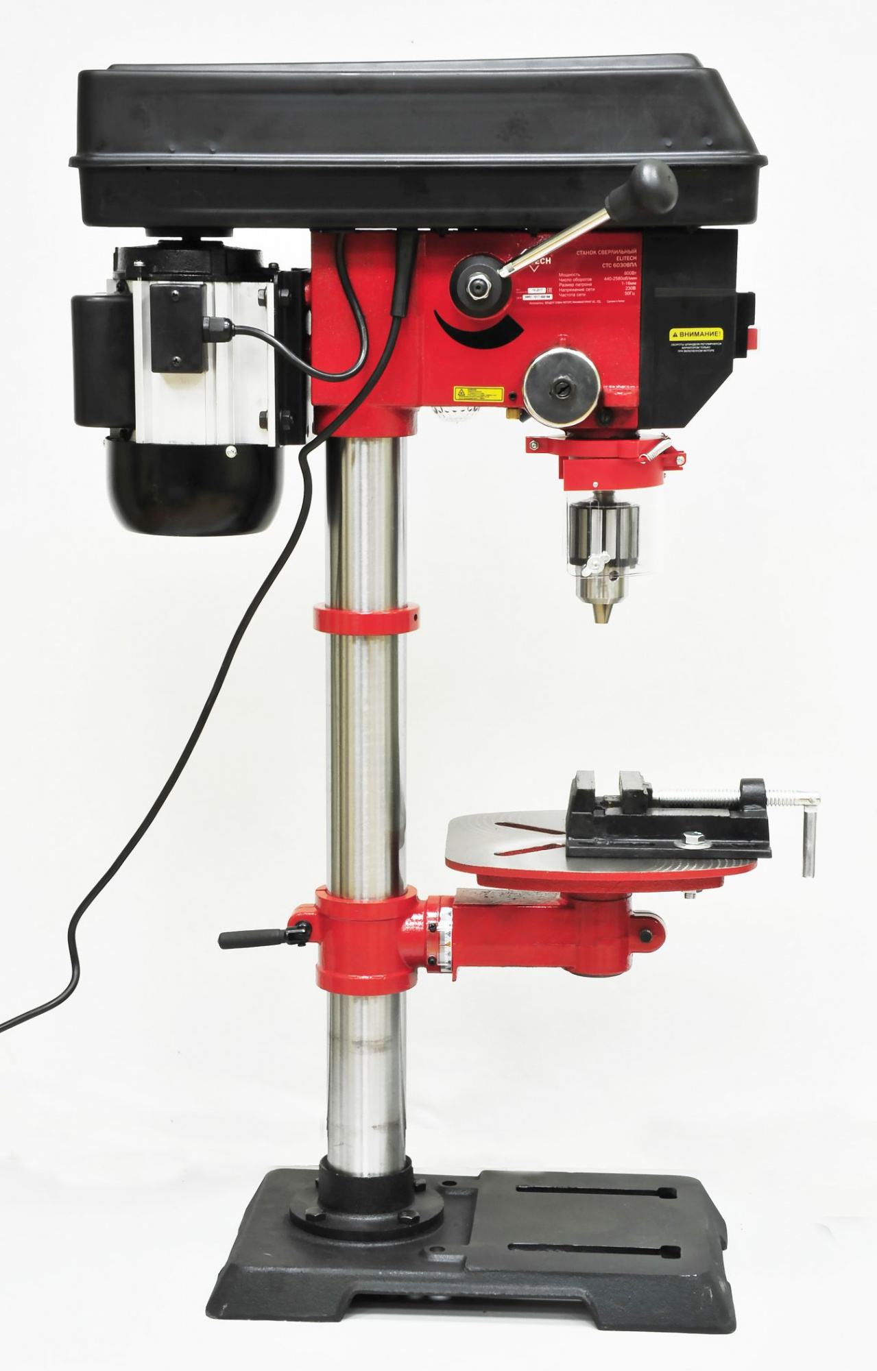Вариаторная регулировка скорости вращения шпинделя. Поворотный рабочий стол. Угол наклона рабочего стола 0° -45° (лево-право). Элевационная рейка рабочего стола. Регулировка глубины сверления. Защитный щиток патрона.