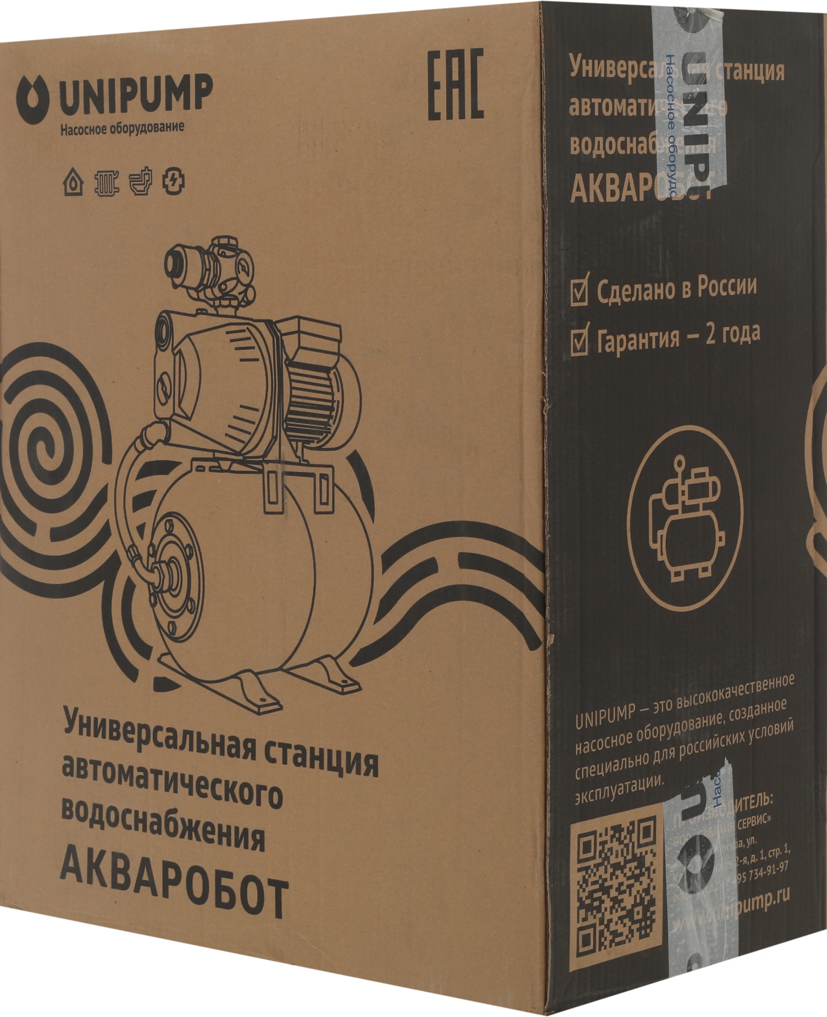 Корпус из чугуна; встроенный эжектор; предназначен для перекачивания чистой воды; центробежный асинхронный двигатель; гидроаккумулятор емкостью 24 л; блок управления.