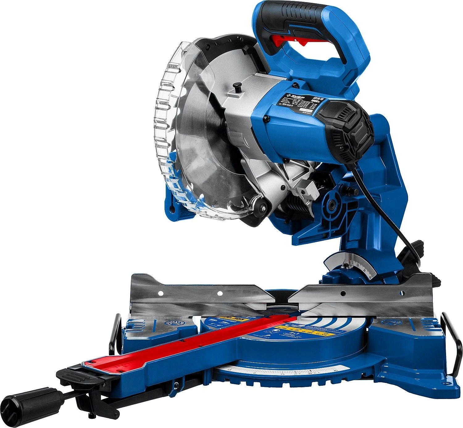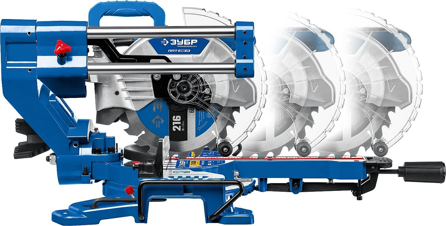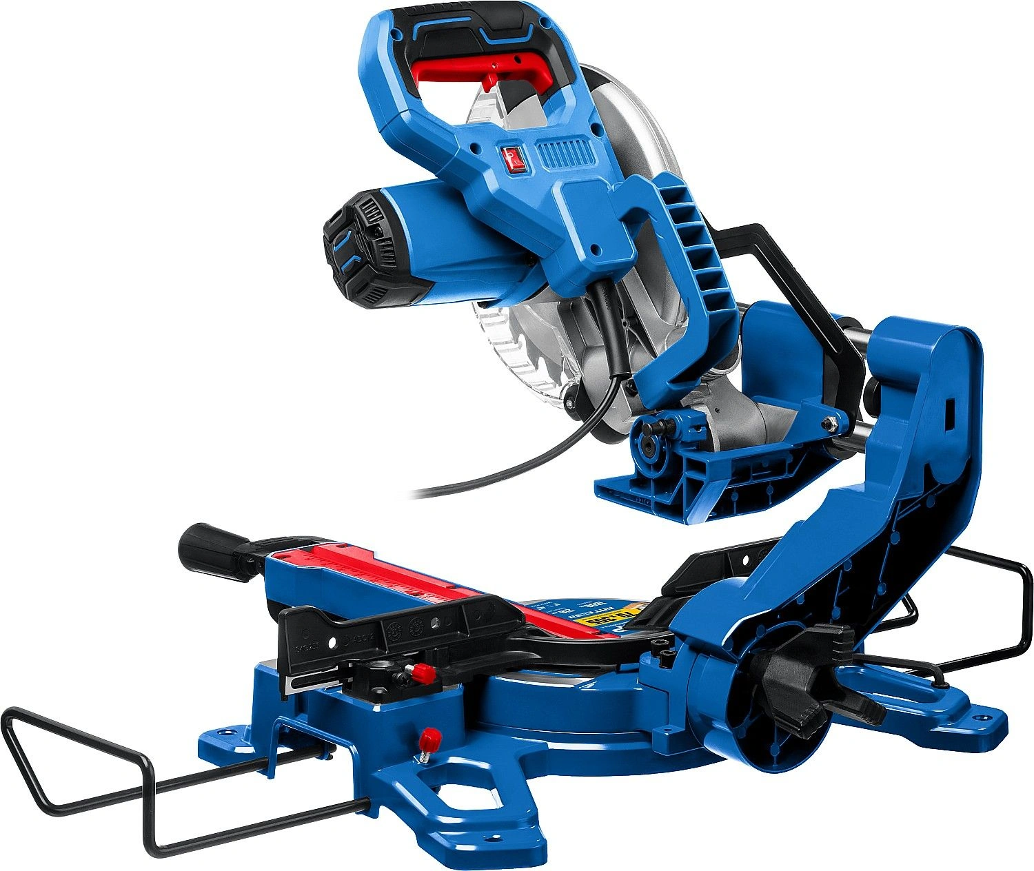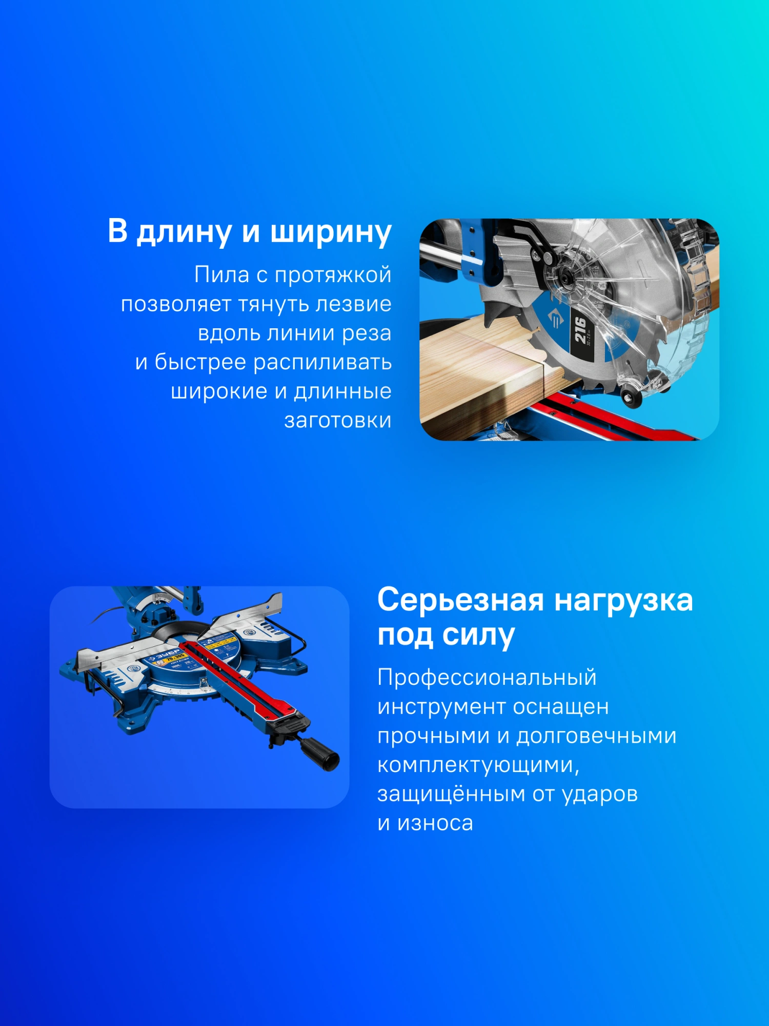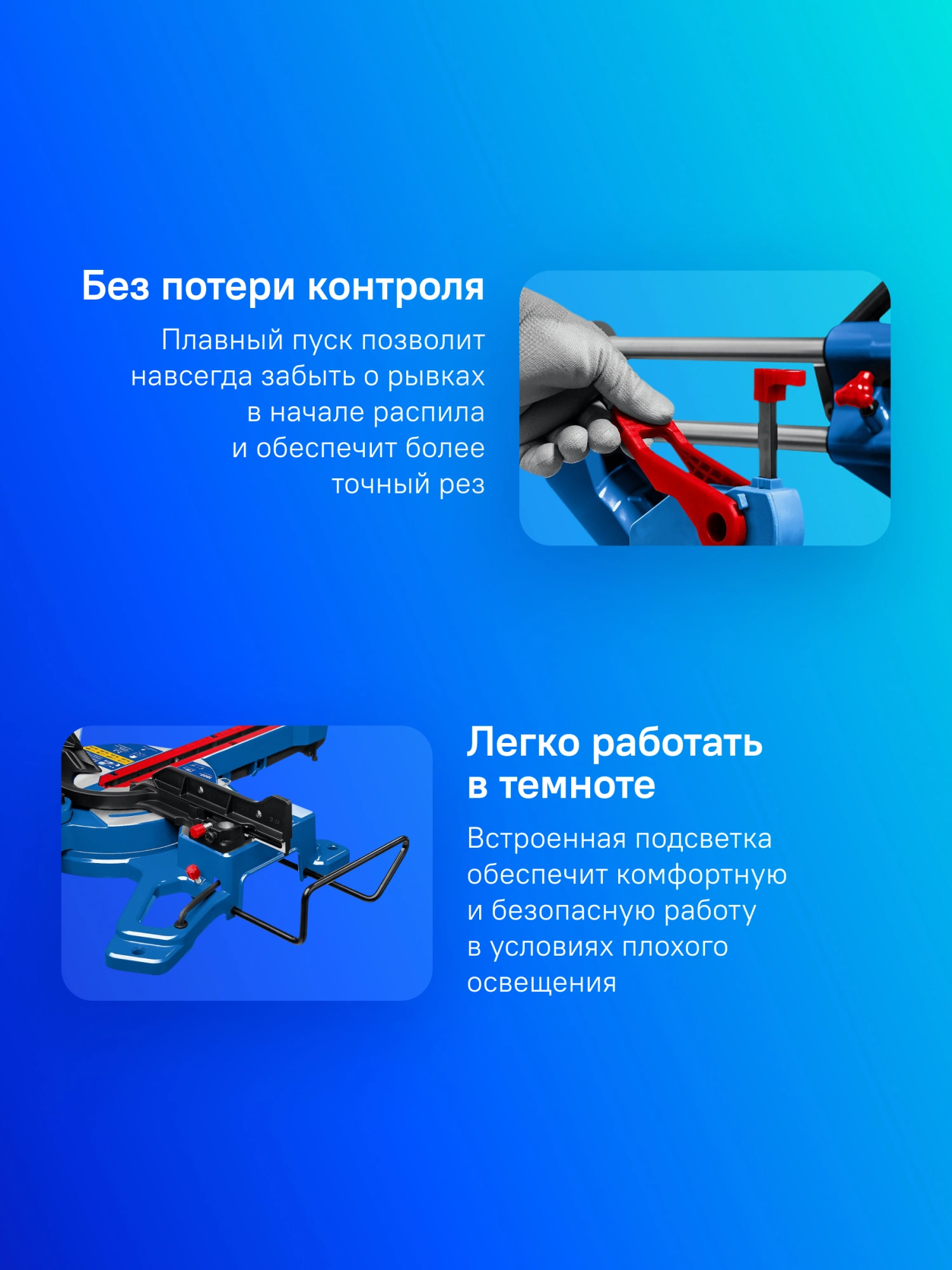 Высокая точность реза. Сдвижная консоль. Плавный пуск. Удобная регулировка наклона. LED-подсветка с указателем реза. Автоматически закрывающийся кожух. Удлинители стола.