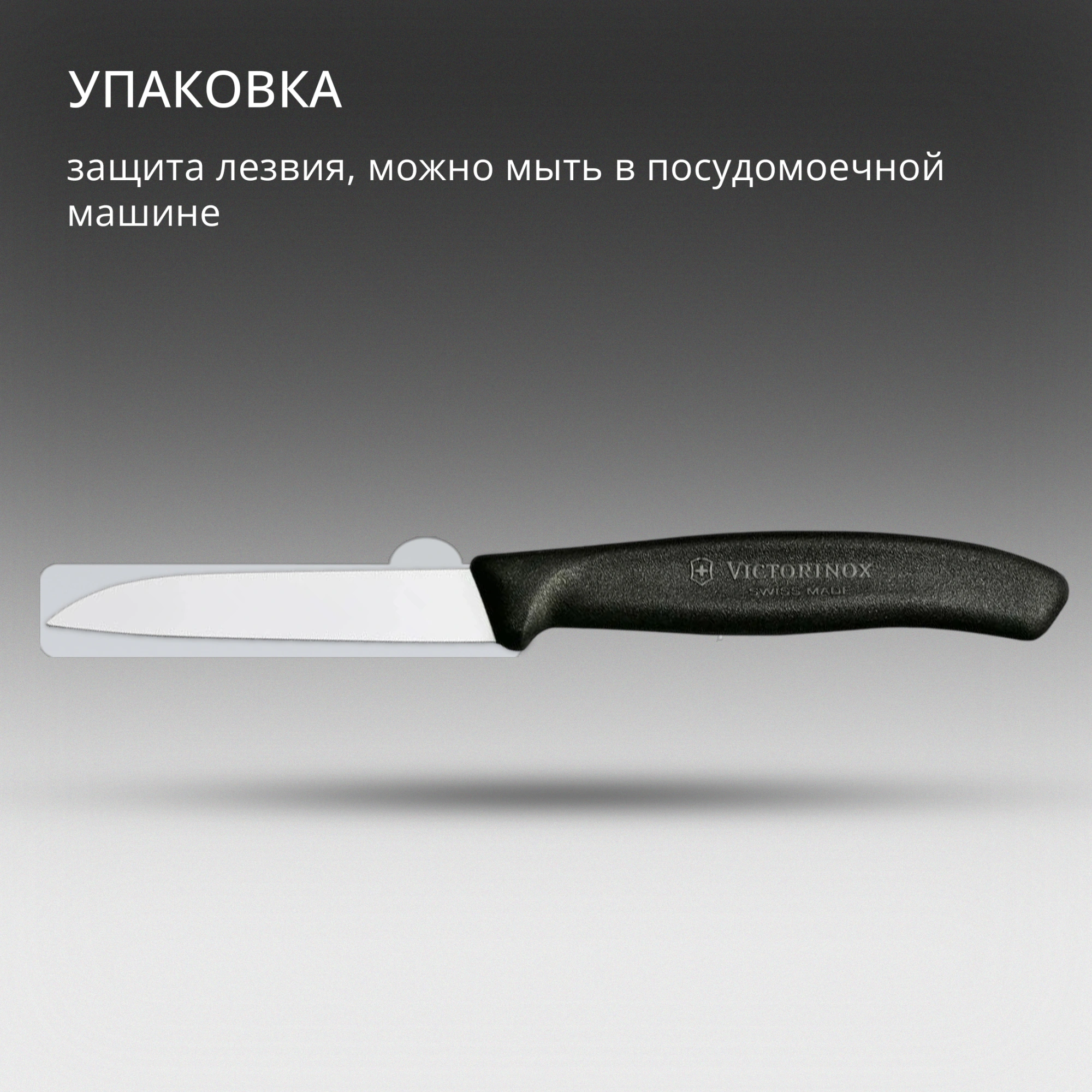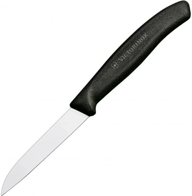 Нож для очистки овощей швейцарского производства с прямым лезвием.