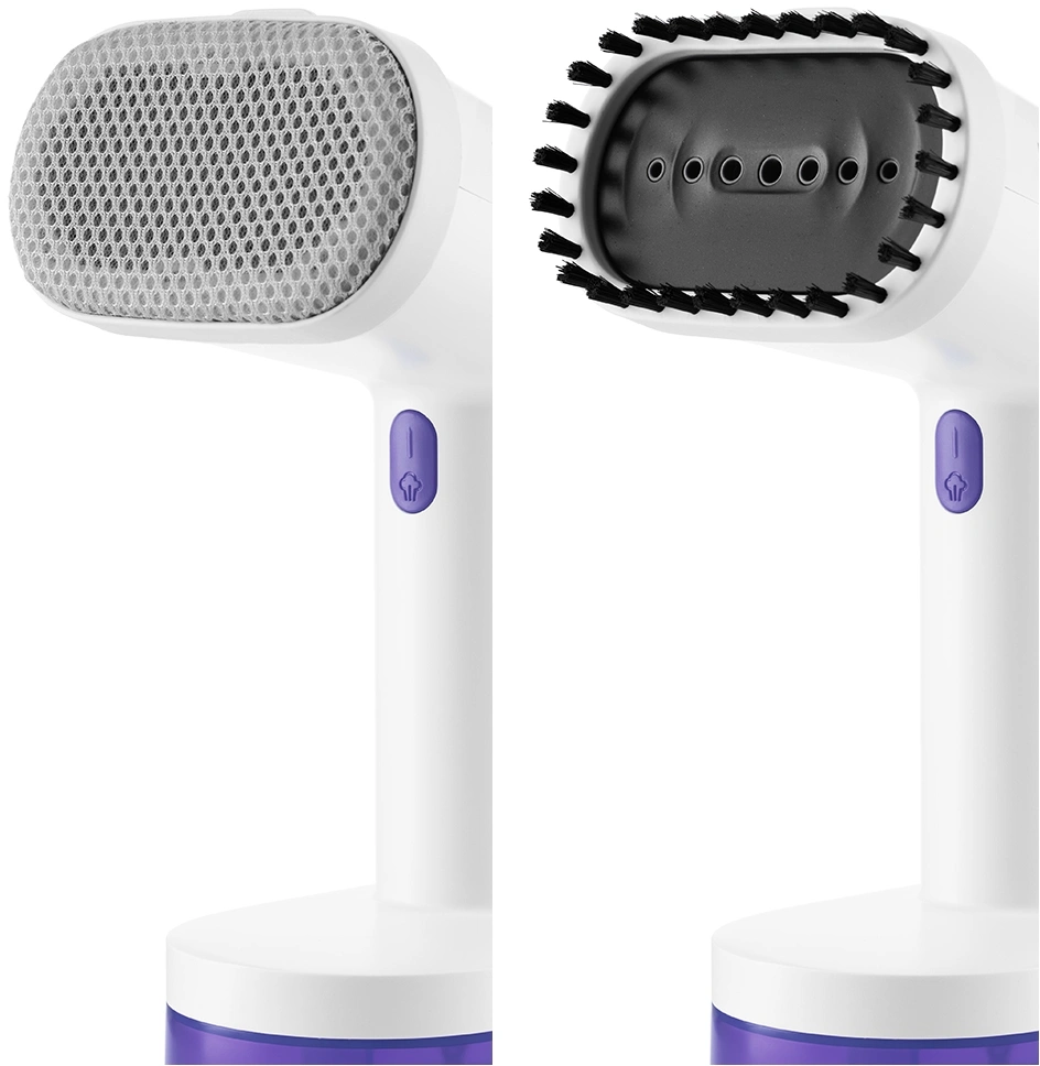 В комплекте с ручным отпаривателем идут 2 насадки. Ворсовая легко чистит загрязнённые поверхности, а также убирает шерсть домашних животных, волосы, ворс. Тканевая насадка необходима при работе с деликатными тканями.