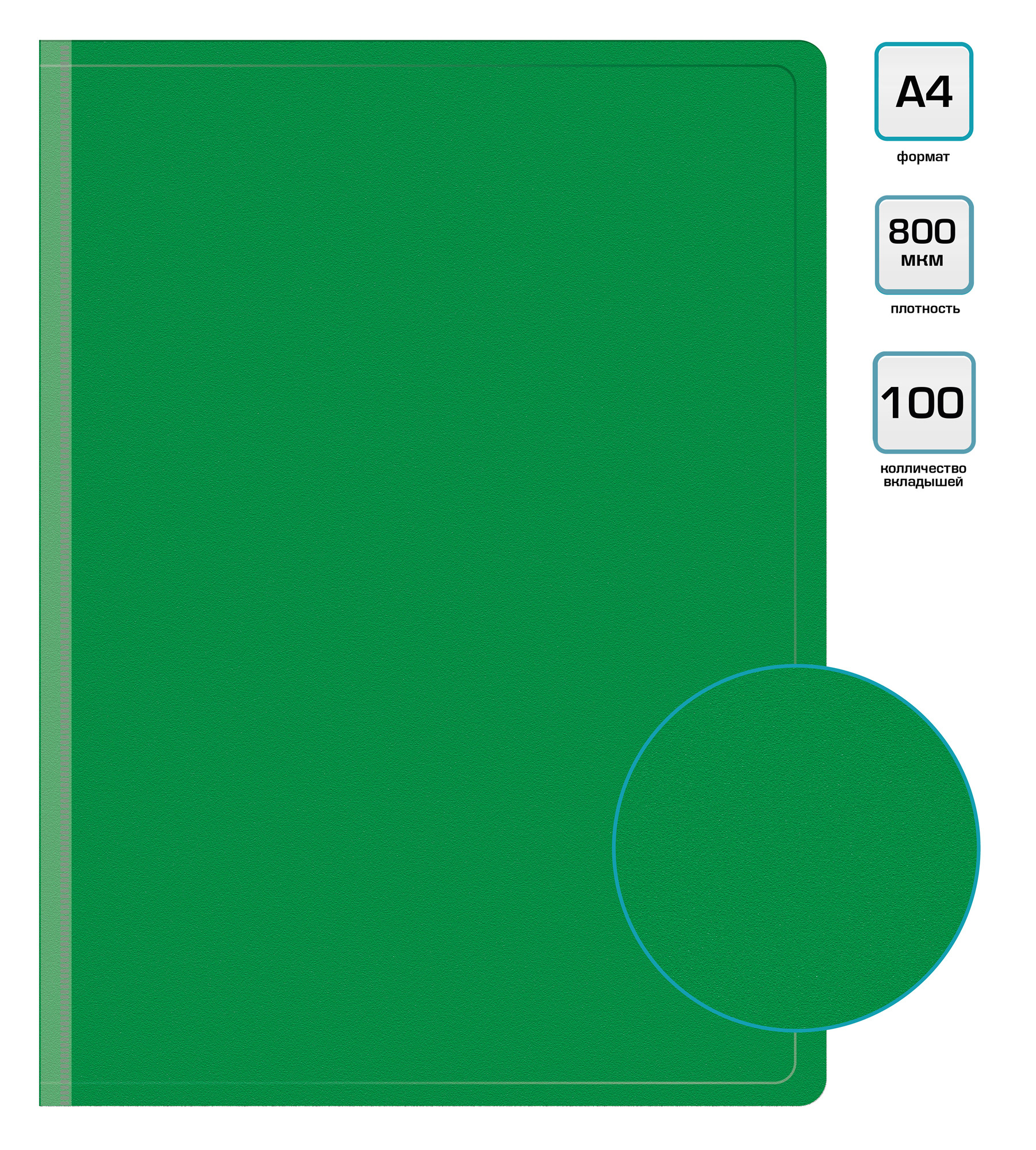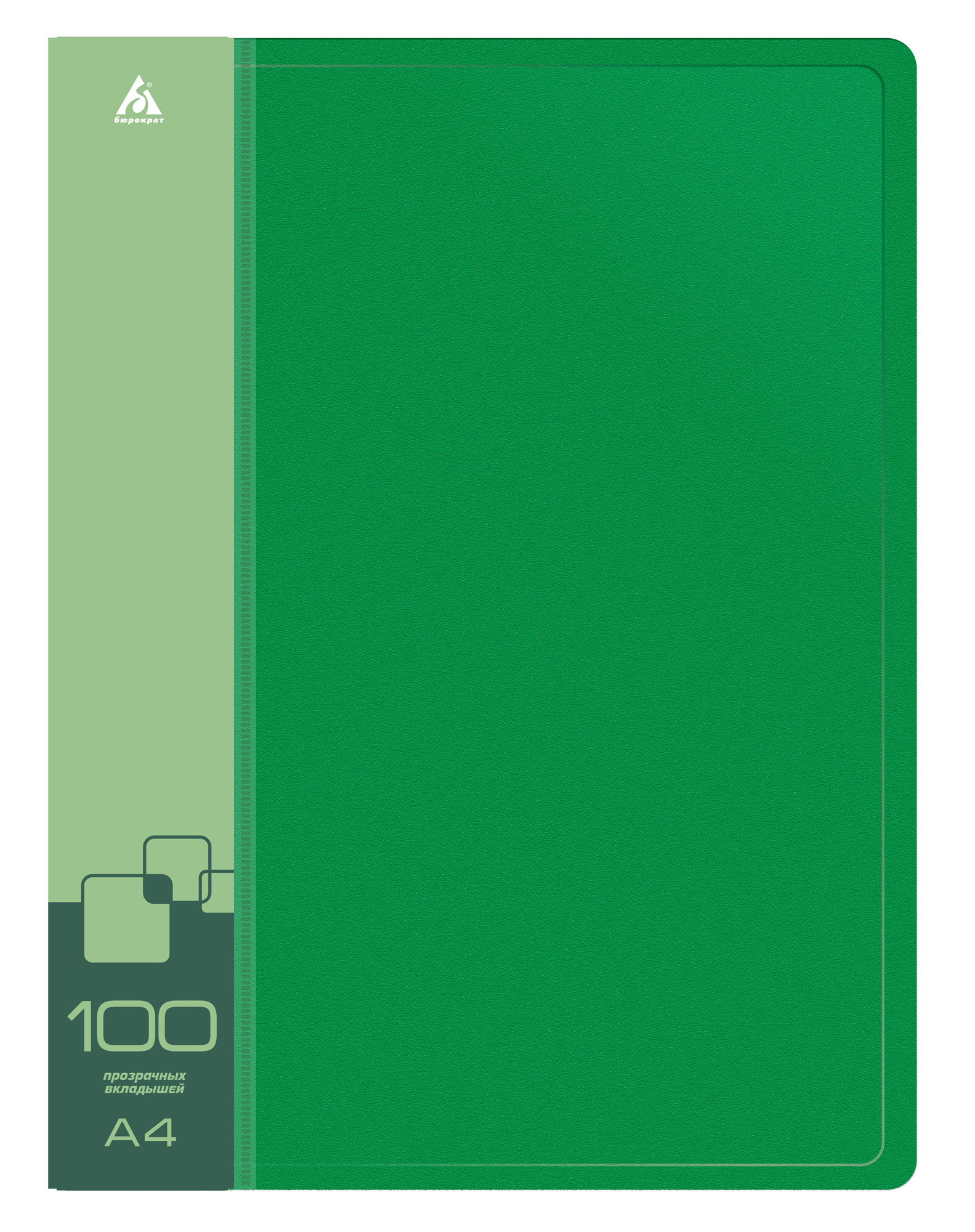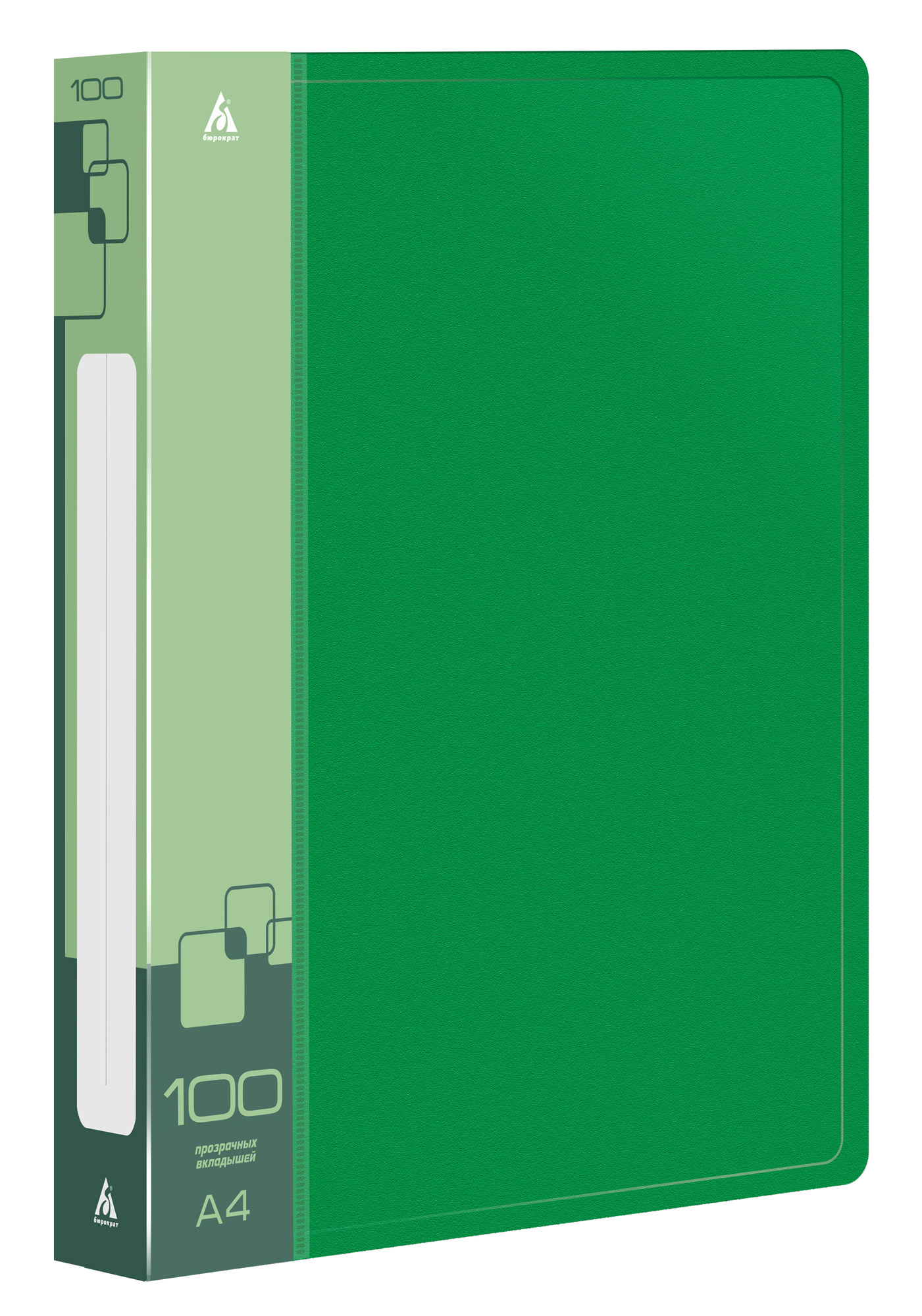 Папка с 100 прозр.вклад. Бюрократ -BPVN100GRN A4 пластик 0.8мм торц.карм с бум. встав зеленый