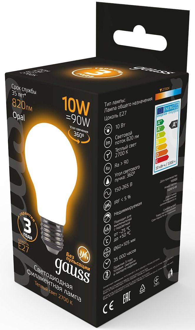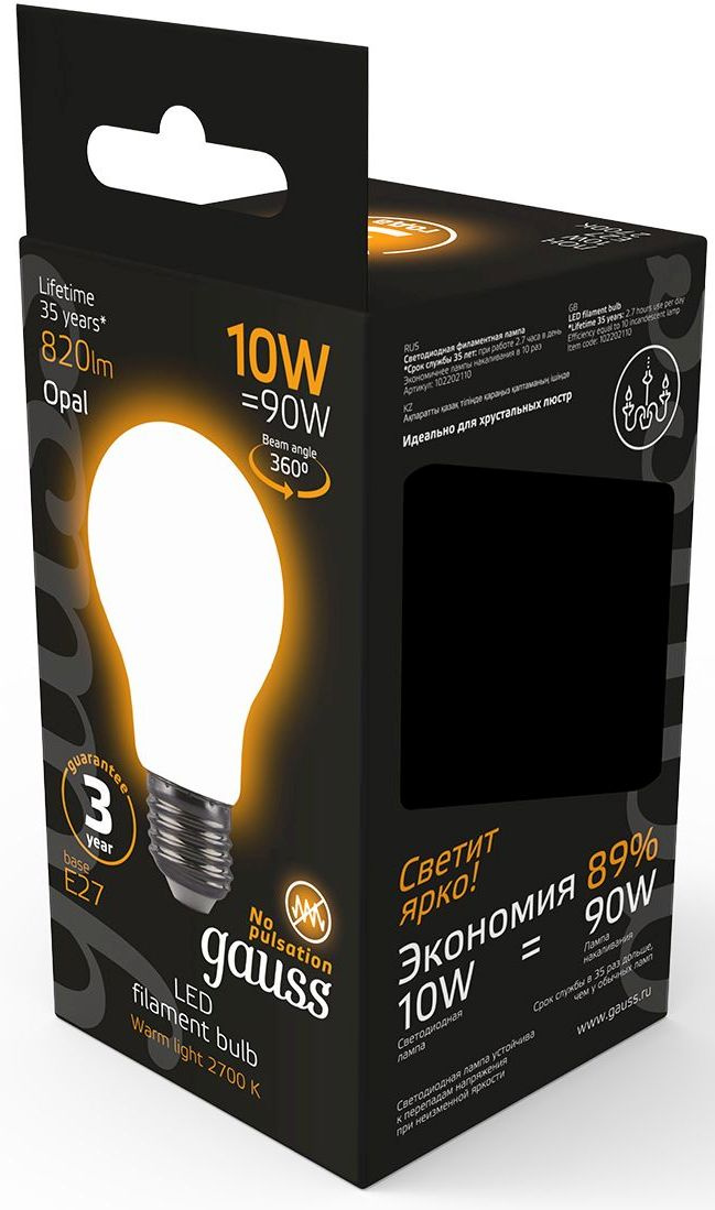 Лампа светодиодная Gauss 10Вт цок.:E27 шар 220B св.свеч.бел.теп. A60 (упак.:10шт) (102202110)
