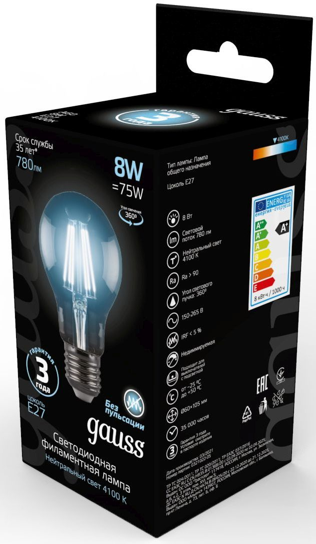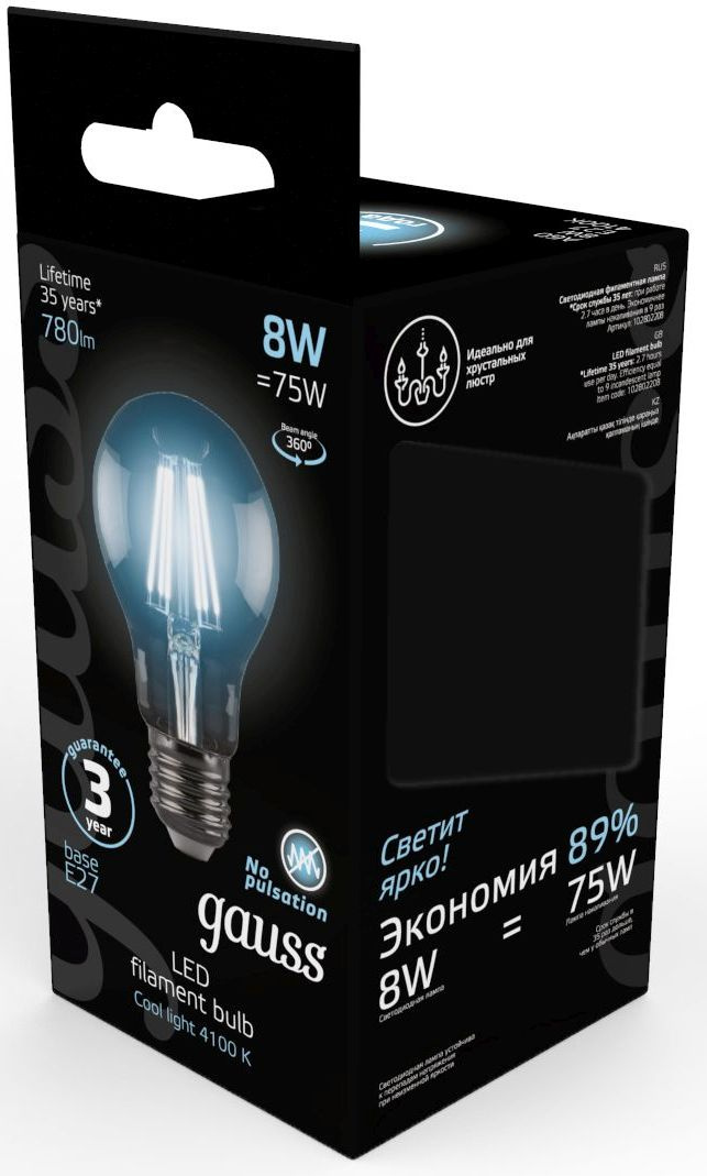 Лампа филам. Gauss 8Вт цок.:E27 шар 220B св.свеч.бел.нейт. A60 (упак.:10шт) (102802208)