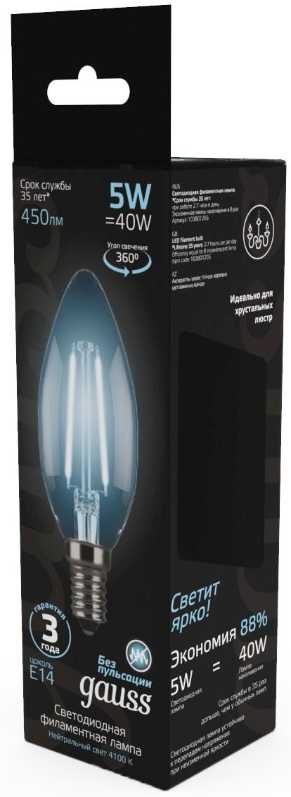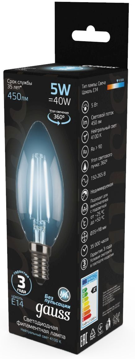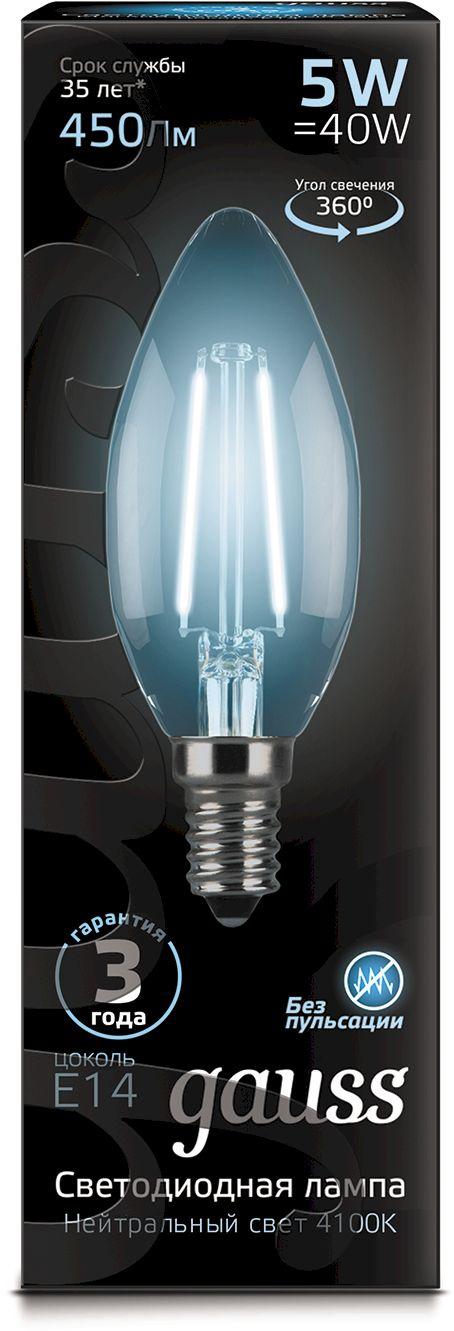 Лампа филам. Gauss 5Вт цок.:E14 свеча 220B св.свеч.бел.нейт. C37 (упак.:10шт) (103801205)