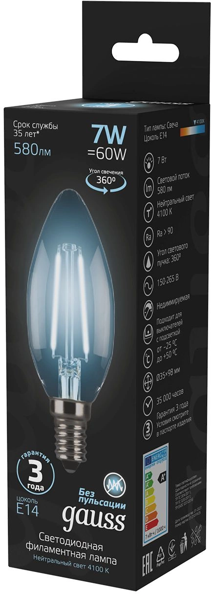 Лампа филам. Gauss 7Вт цок.:E14 свеча 220B св.свеч.бел.нейт. C37 (упак.:10шт) (103801207)