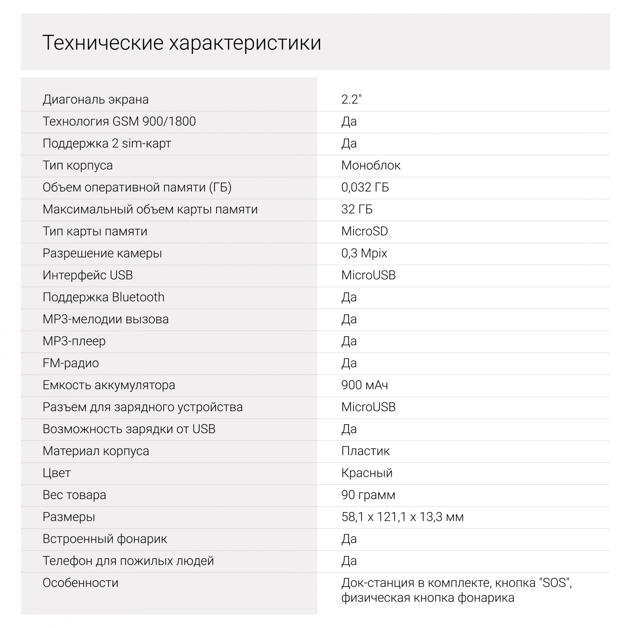 Мобильное устройство с корпусом из пластика красного и черного цветов весит 90 г. Благодаря размерам 58,1х121,1х13,3 мм оно легко помещается в карман. Емкий аккумулятор позволяет всегда быть на связи, а кнопка SOS будет полезна, если понадобится как можно быстрее связаться с близким человеком или врачом. Предусмотрен хорошо продуманный органайзер с калькулятором, календарем и будильником.