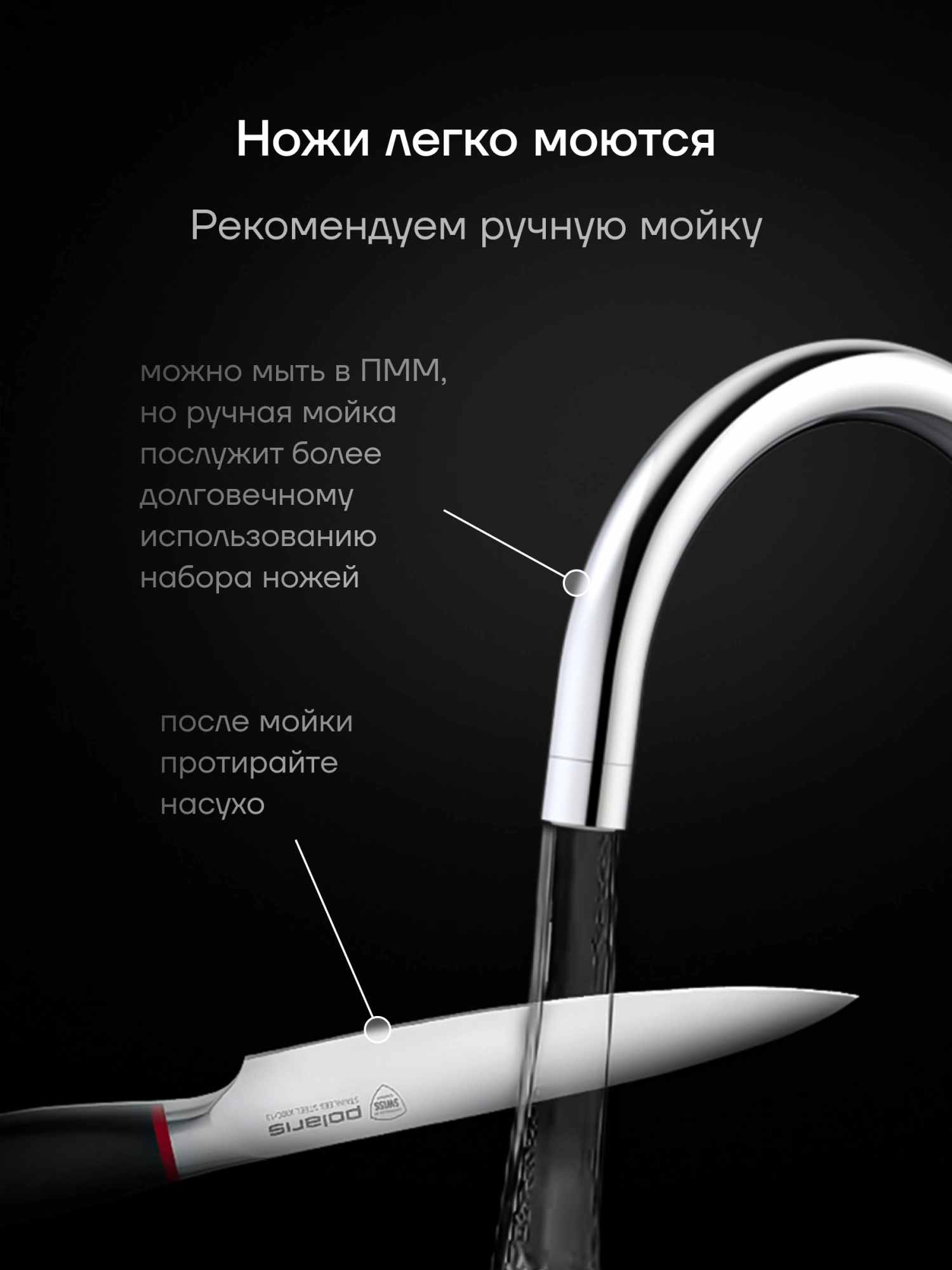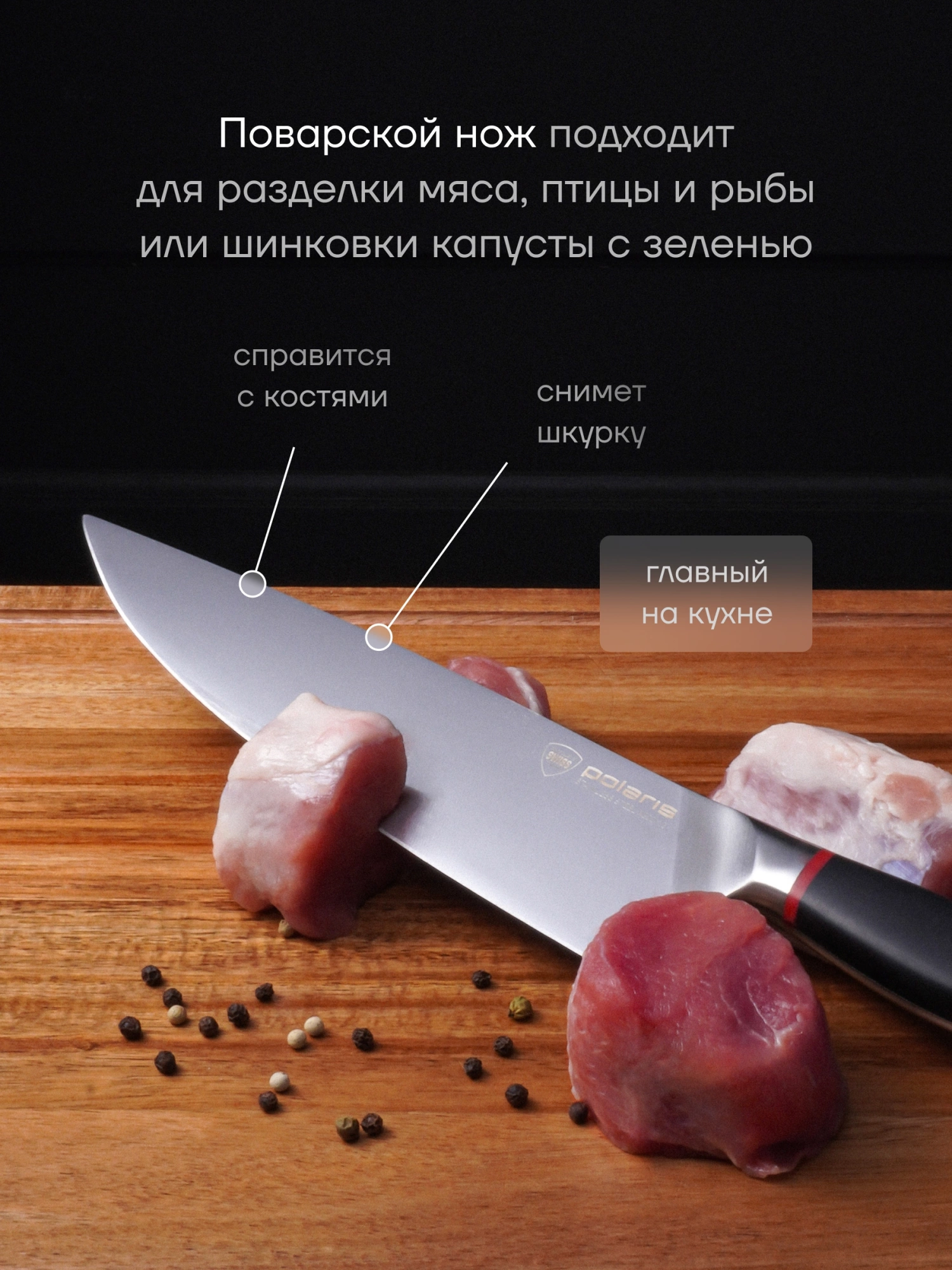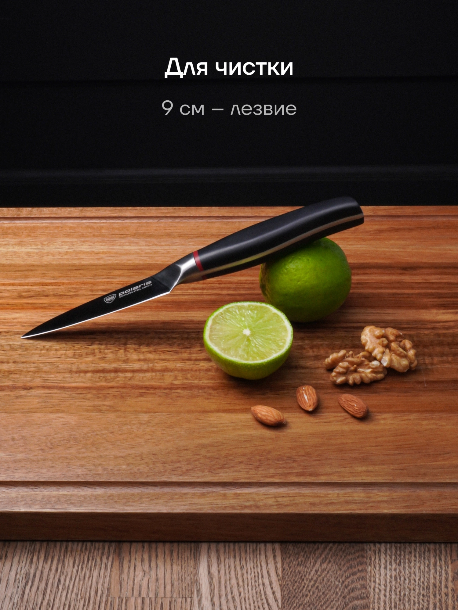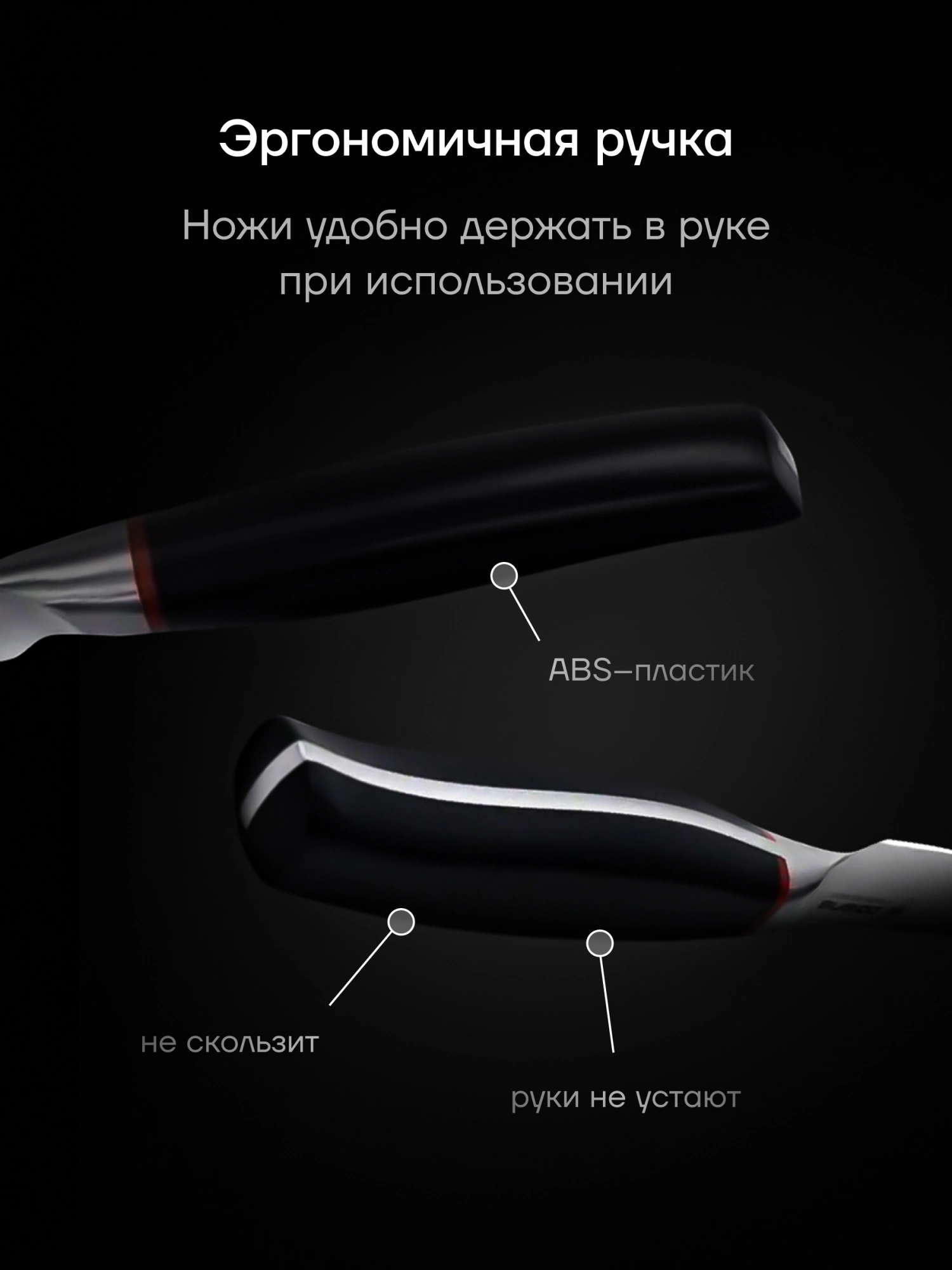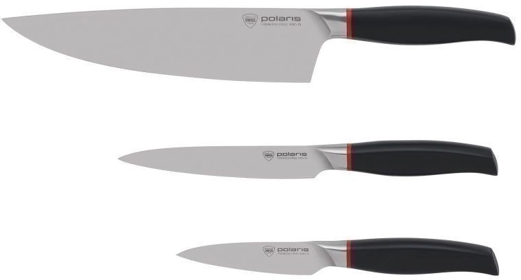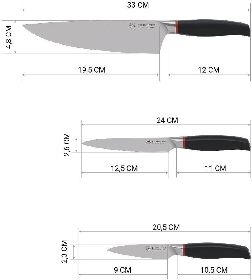 Нож поварской - 8'' - 19,5 см. Нож универсальный - 5'' - 12,5 см. Нож для чистки и резки - 3,5" - 9 см.