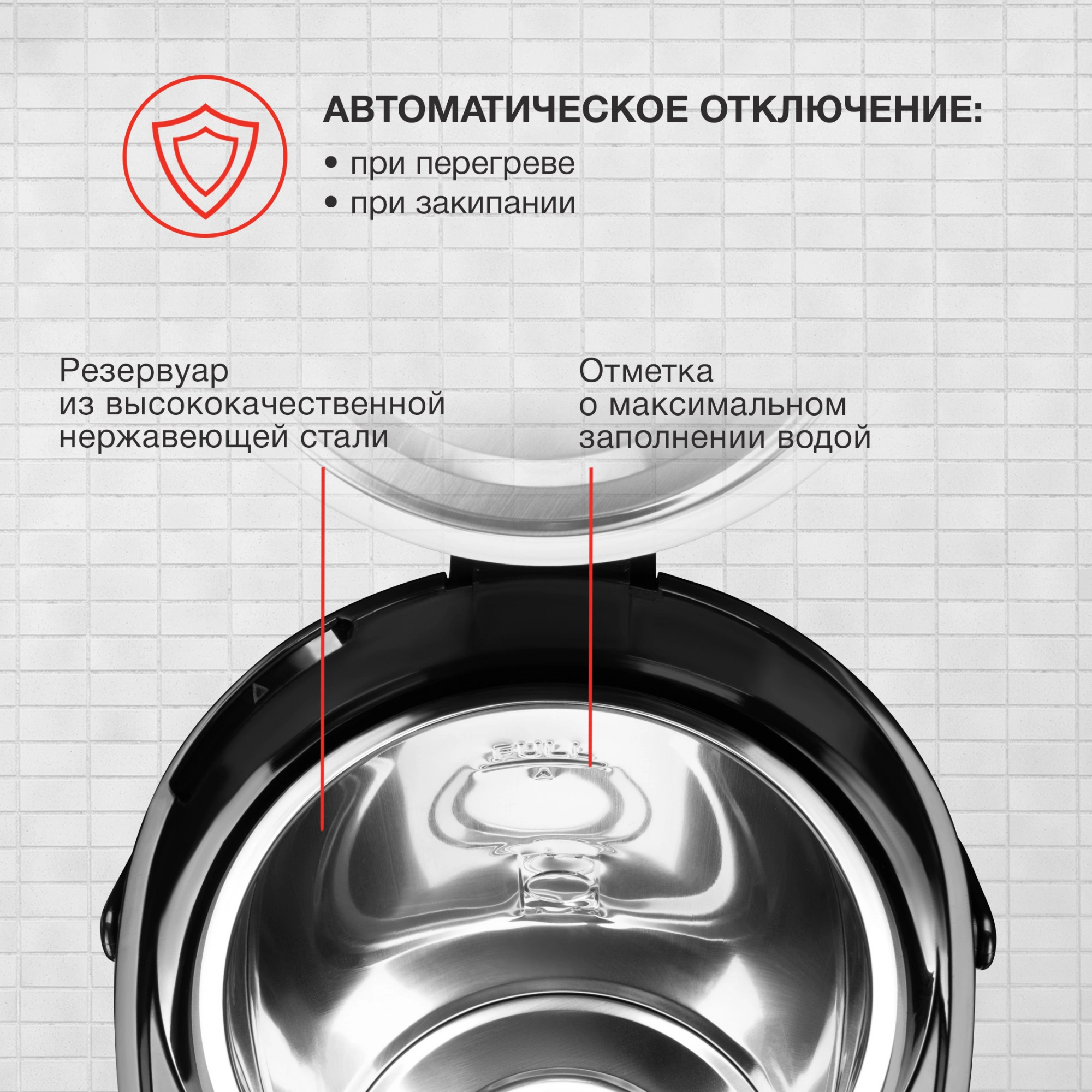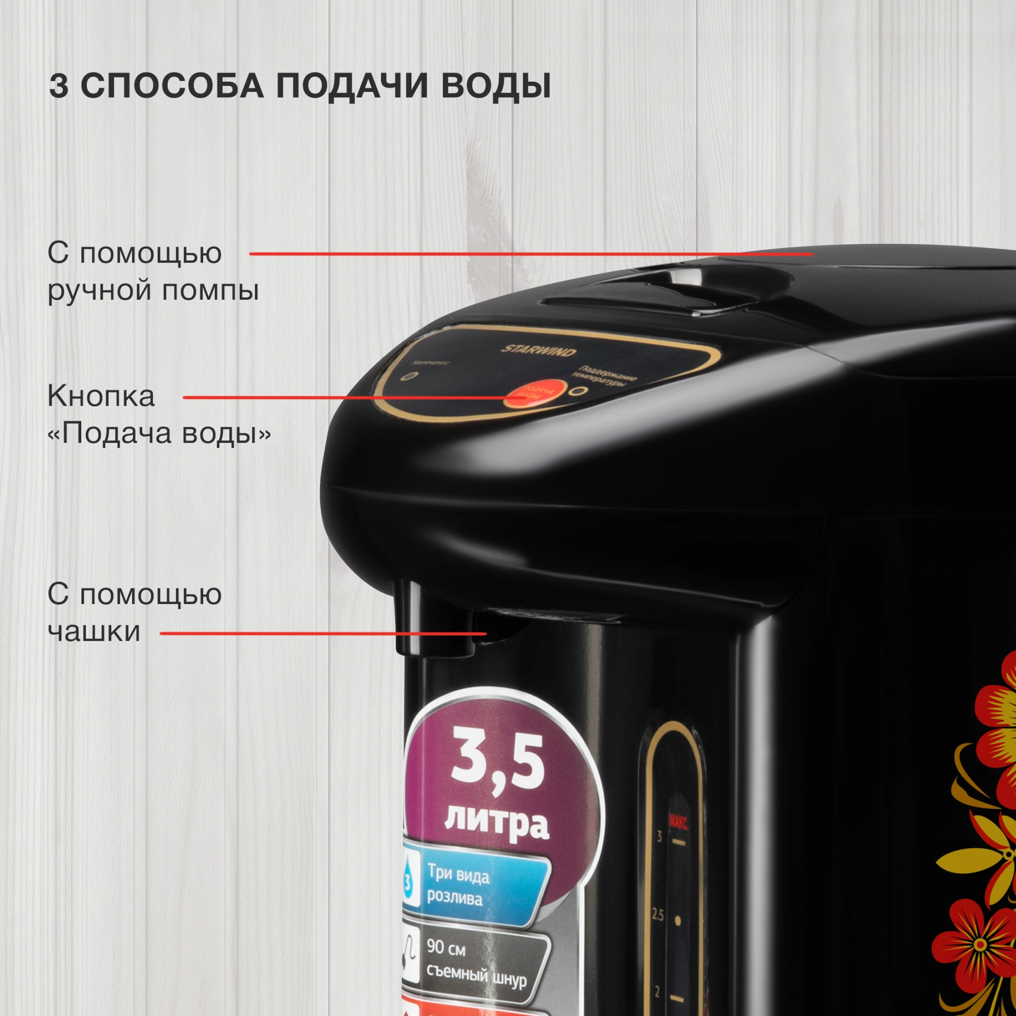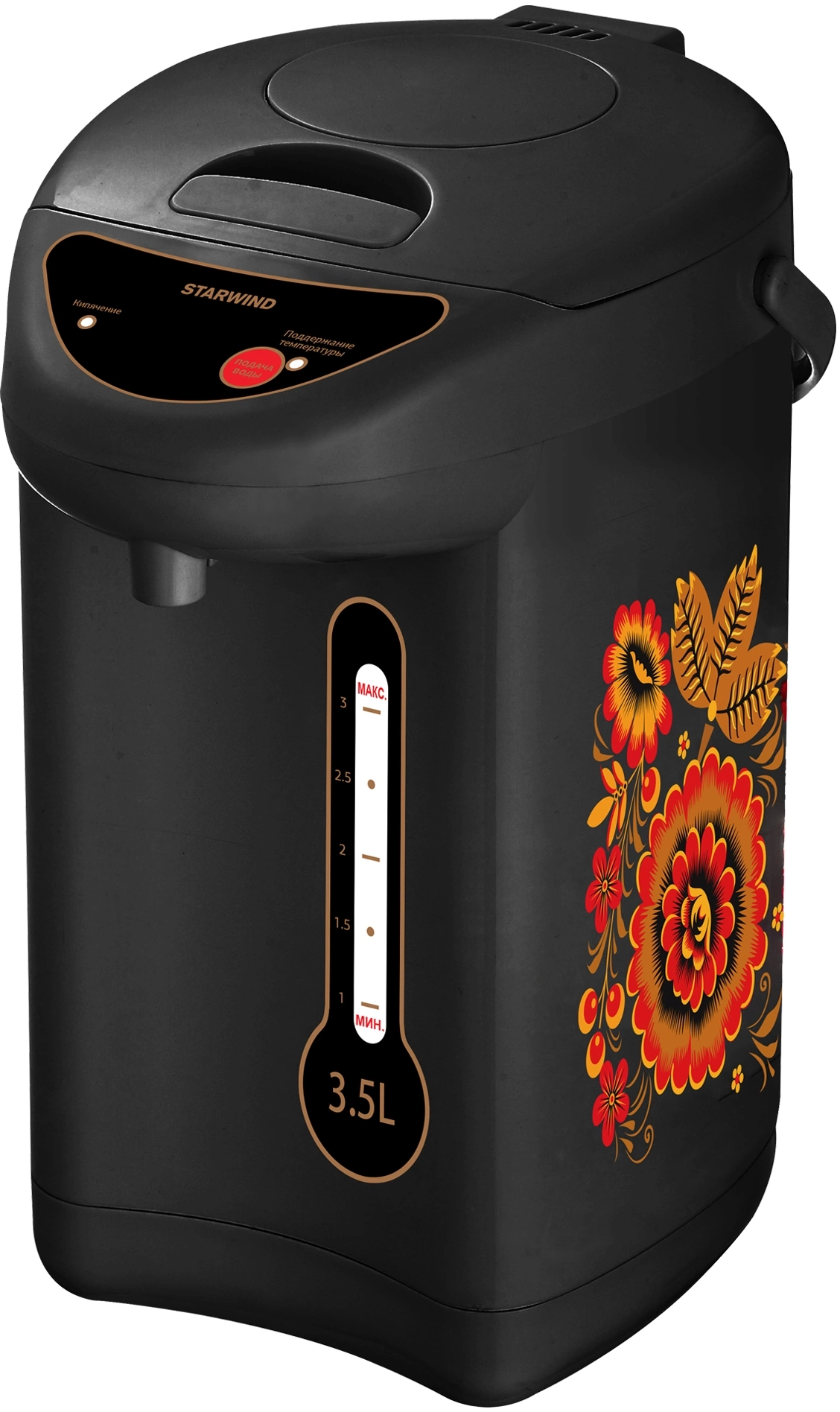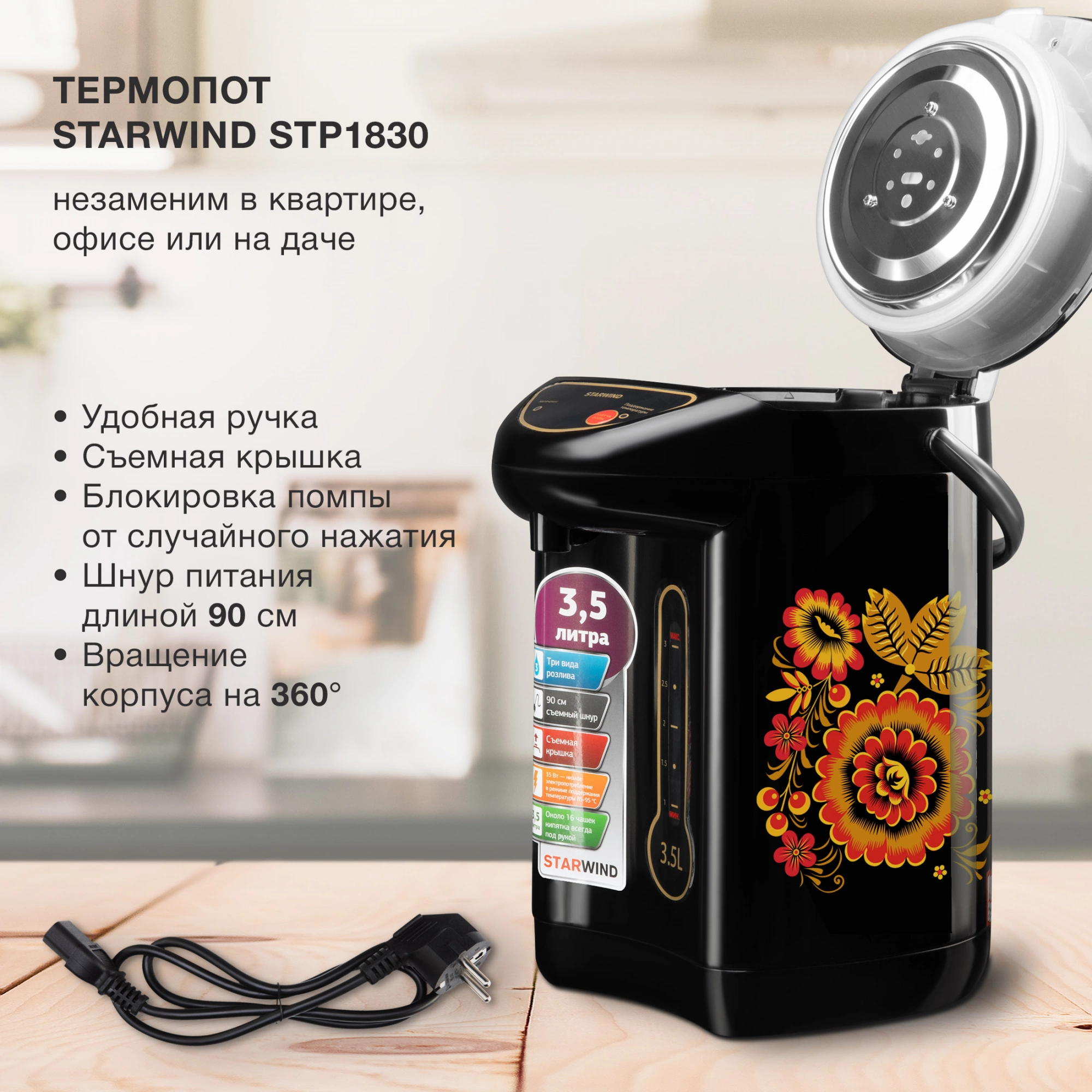 Термопот Starwind STP1830 представляет собой специальное кухонное оборудование, которое является чем-то средним между электрическим чайником, самоваром и термосом. Устройство способно в сжатые сроки вскипятить питьевую воду, поддерживать нужный температурный режим. Мощность современного термопота составляет порядка 750 Вт, а объем предусмотренной емкости для воды равен 3,5 л. Два режима функционирования позволяют поддерживать температуру в пределах 85-90 и 100 градусов по Цельсию. Изготавливается термопот на основе качественной нержавеющей стали и пластика, выполнено устройство в классическом черном цвете (нанесен яркий узор). Вес прибора составляет 1,9 кг, а длина сетевого шнура – 0,9 метра.