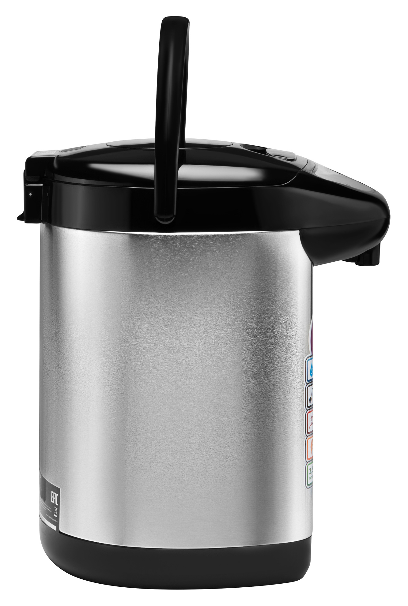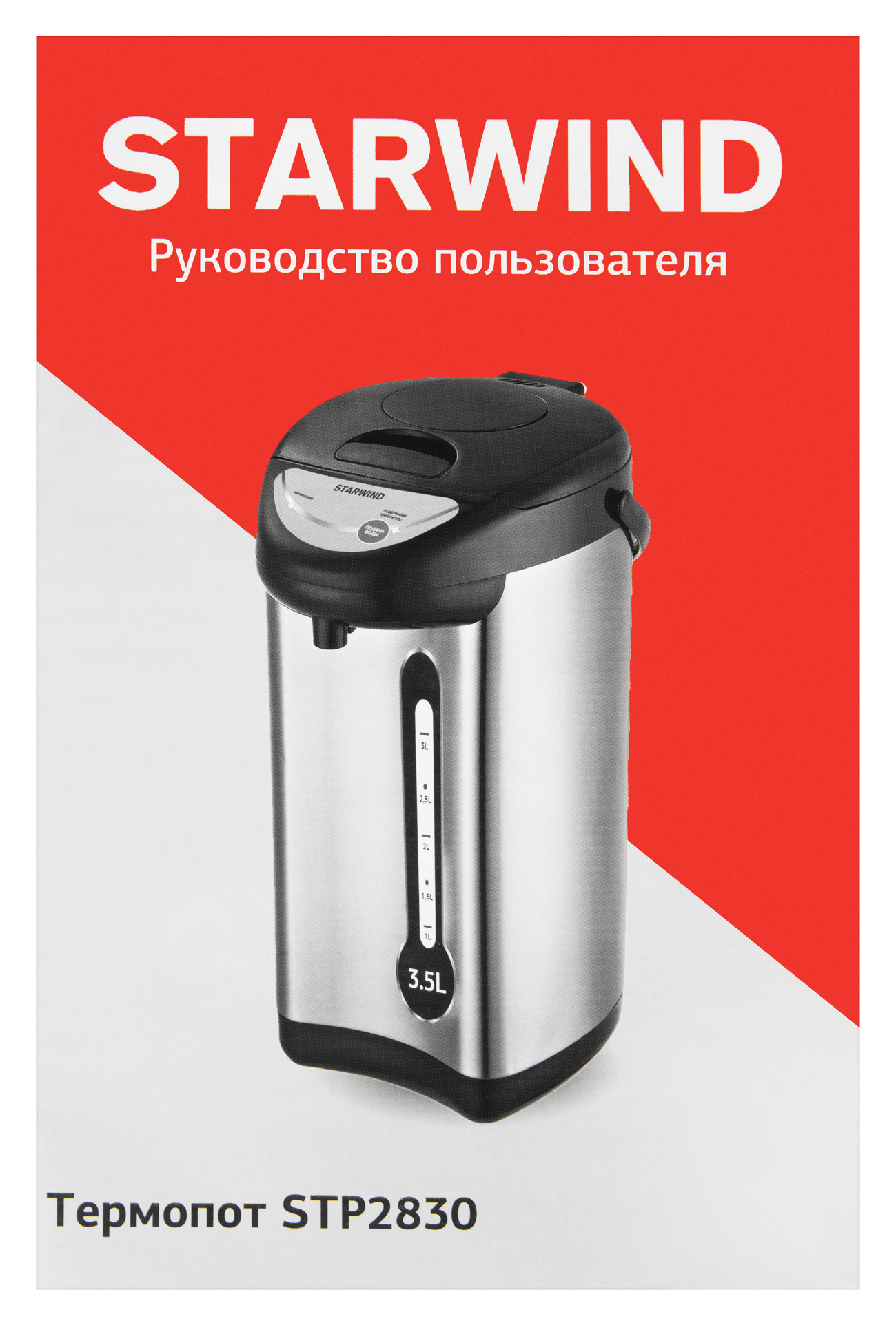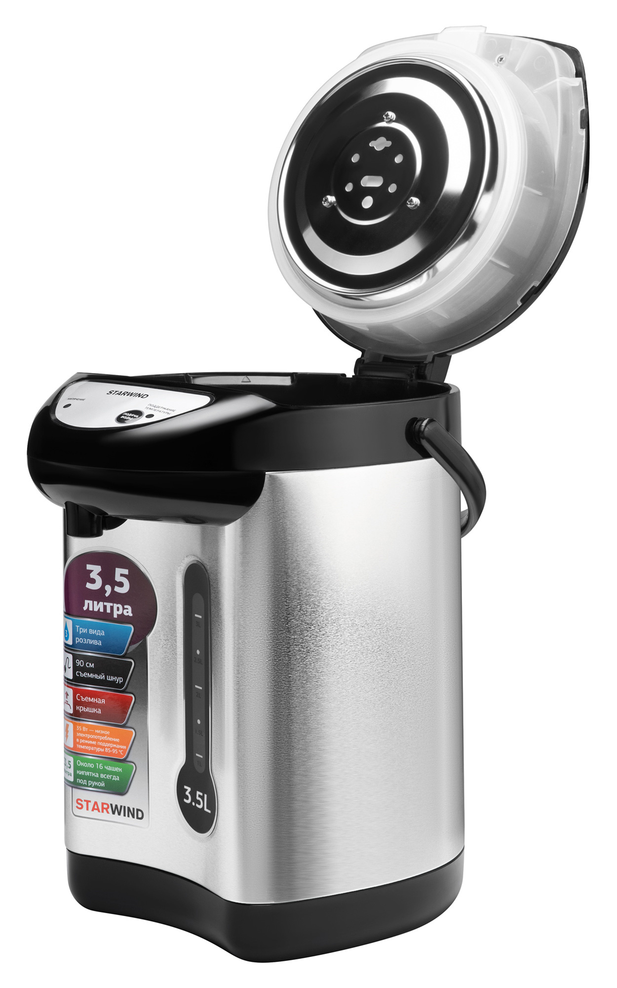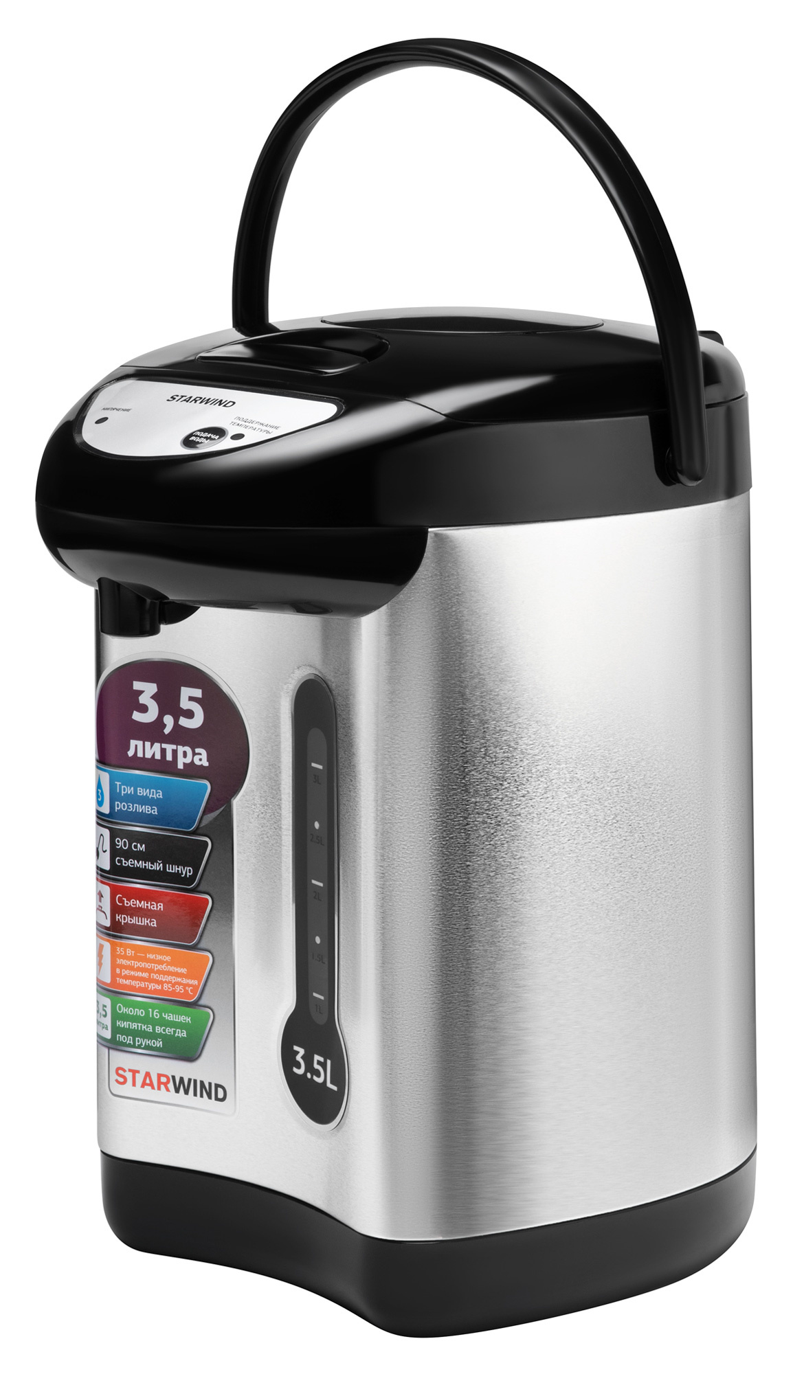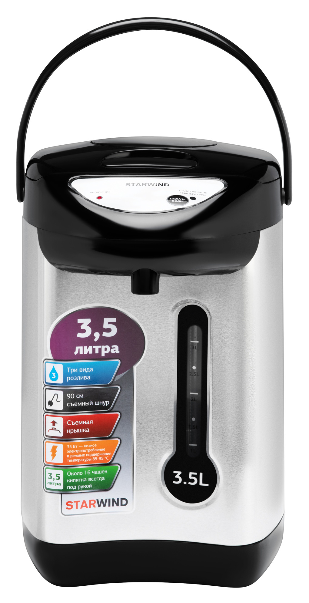 Термопот Starwind STP2830 – популярное современное устройство, обладающее высокой функциональностью. Мощность термопота находится на уровне 750 Вт, а объем предусмотренного в конструкции резервуара для воды равен 3,5 литрам. Есть возможность использования одного из двух температурных режимов – 85-90 и 100 градусов Цельсия. В конструктиве современного устройства предусмотрены скрытая нагревательная система и комбинированная помпа для подачи воды в чашки. Для удобства эксплуатации имеются индикаторы уровня воды и включения, а корпус может вращаться на 360 градусов.