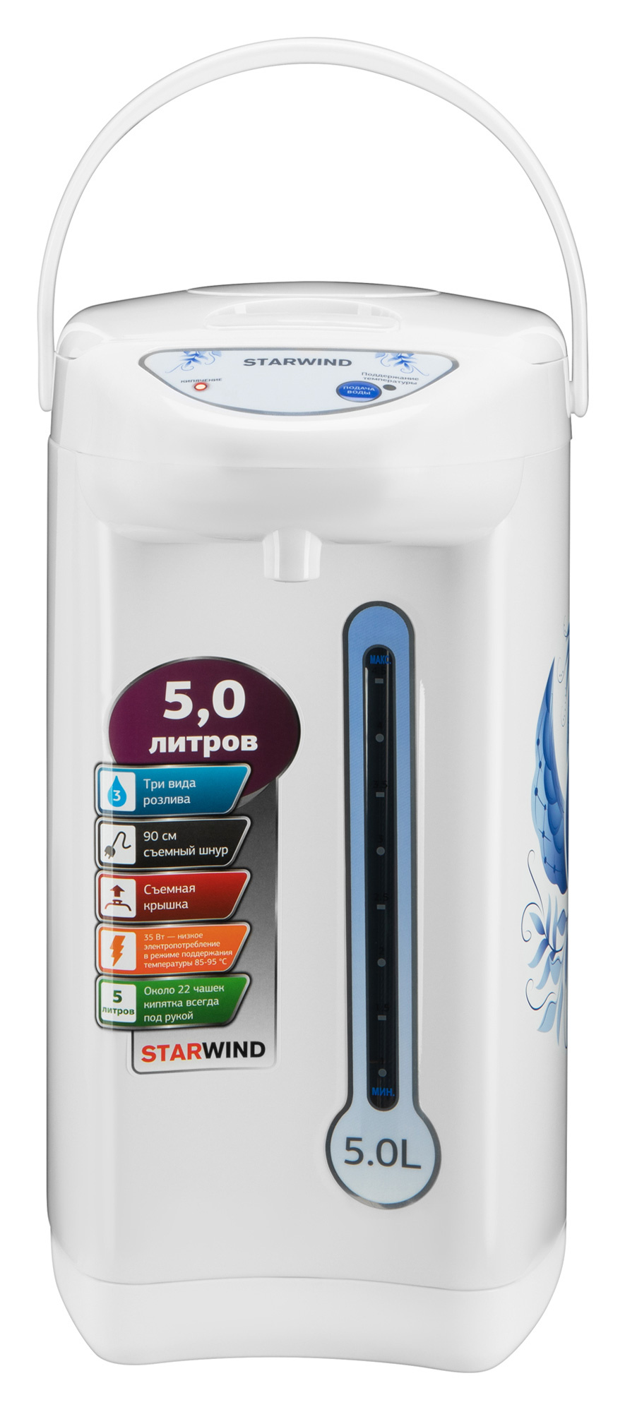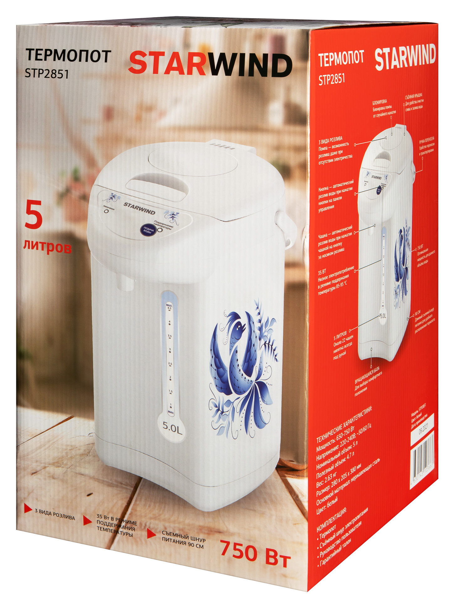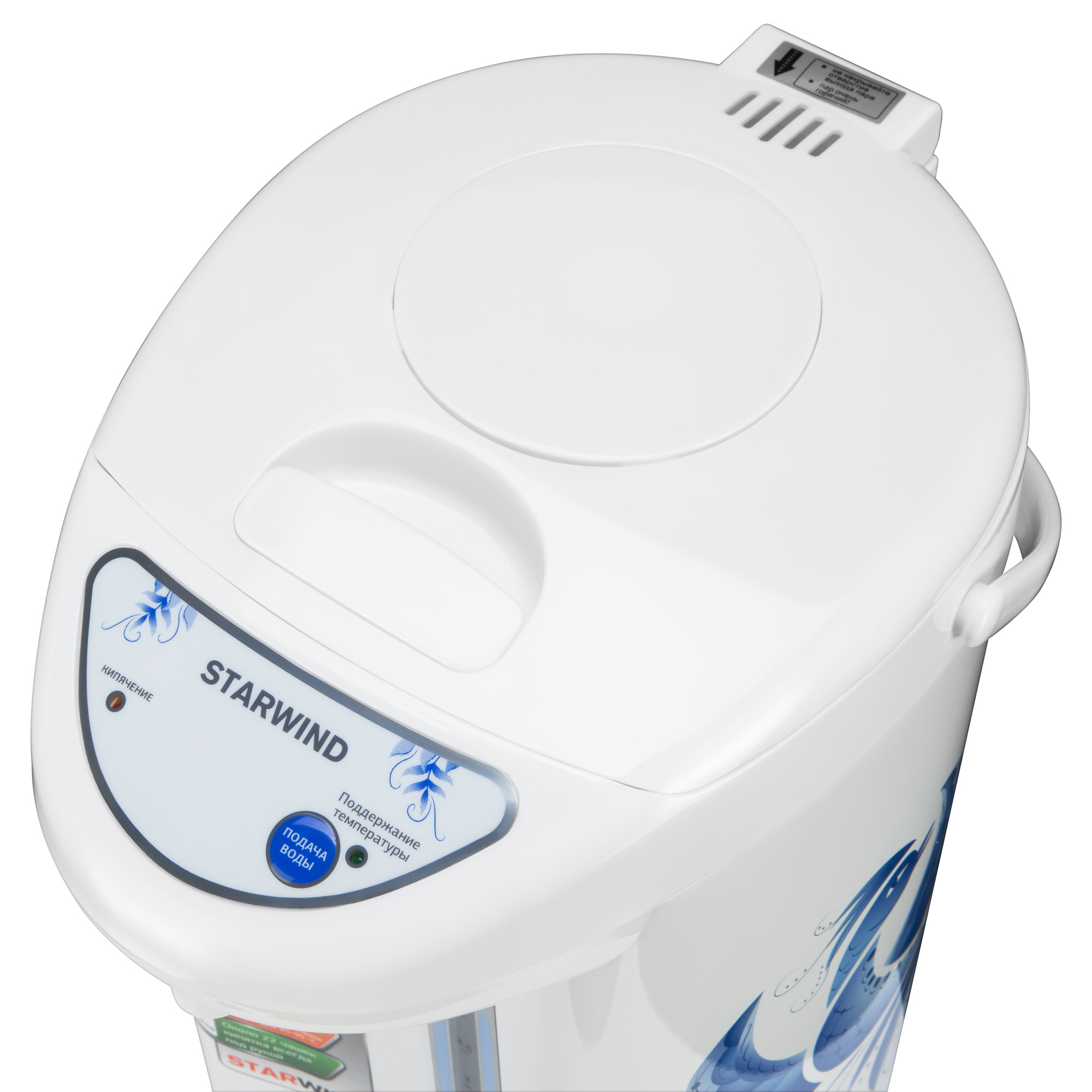 Термопот Starwind STP2851 представляет собой гибрид электрического чайника и термоса. Это бытовое устройство станет незаменимым помощником на кухонном пространстве каждой современной хозяйки. Оно способно быстро нагреть воду, а в дальнейшем сохранит ее температуру длительное время. Мощность термопота составляет порядка 750 Вт, а объем предусмотренного в конструкции резервуара равен примерно 5 литрам. Опционально есть два температурных режима, позволяющих поддерживать температуру на уровне 85-90 и 100 градусов по Цельсию. Корпус современного термопота изготовлен на основе качественного пластика и металла, выполнен в бело-голубой расцветке. Колба создана из нержавеющей стали. Есть съемная крышка, ручка для переноски.