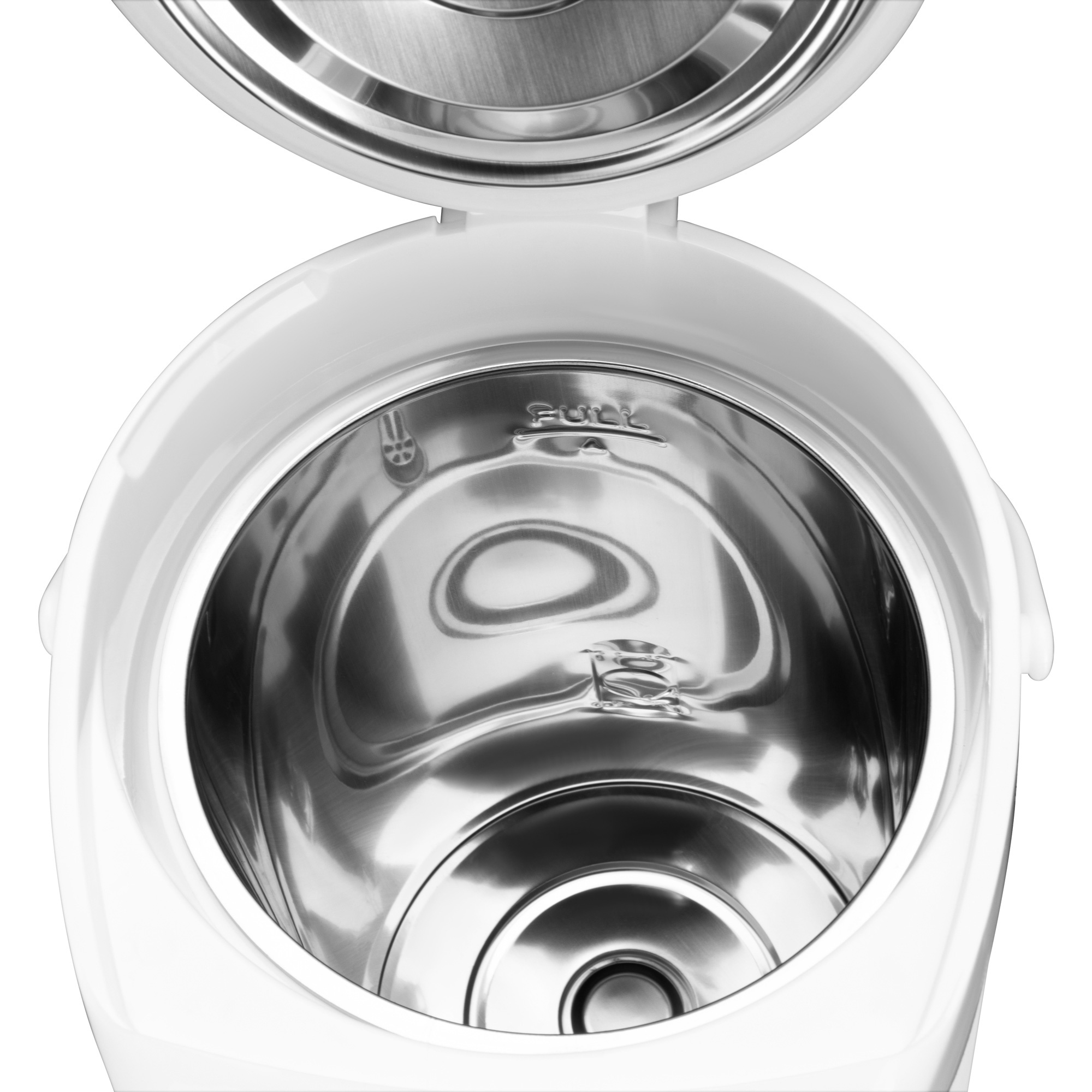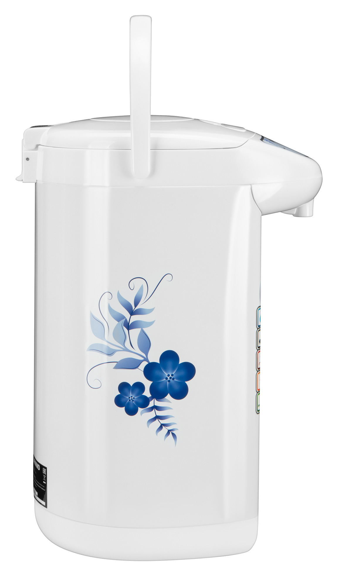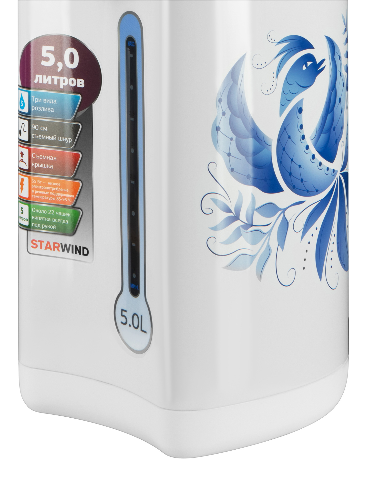 Термопот Starwind STP2851 представляет собой гибрид электрического чайника и термоса. Это бытовое устройство станет незаменимым помощником на кухонном пространстве каждой современной хозяйки. Оно способно быстро нагреть воду, а в дальнейшем сохранит ее температуру длительное время. Мощность термопота составляет порядка 750 Вт, а объем предусмотренного в конструкции резервуара равен примерно 5 литрам. Опционально есть два температурных режима, позволяющих поддерживать температуру на уровне 85-90 и 100 градусов по Цельсию. Корпус современного термопота изготовлен на основе качественного пластика и металла, выполнен в бело-голубой расцветке. Колба создана из нержавеющей стали. Есть съемная крышка, ручка для переноски.